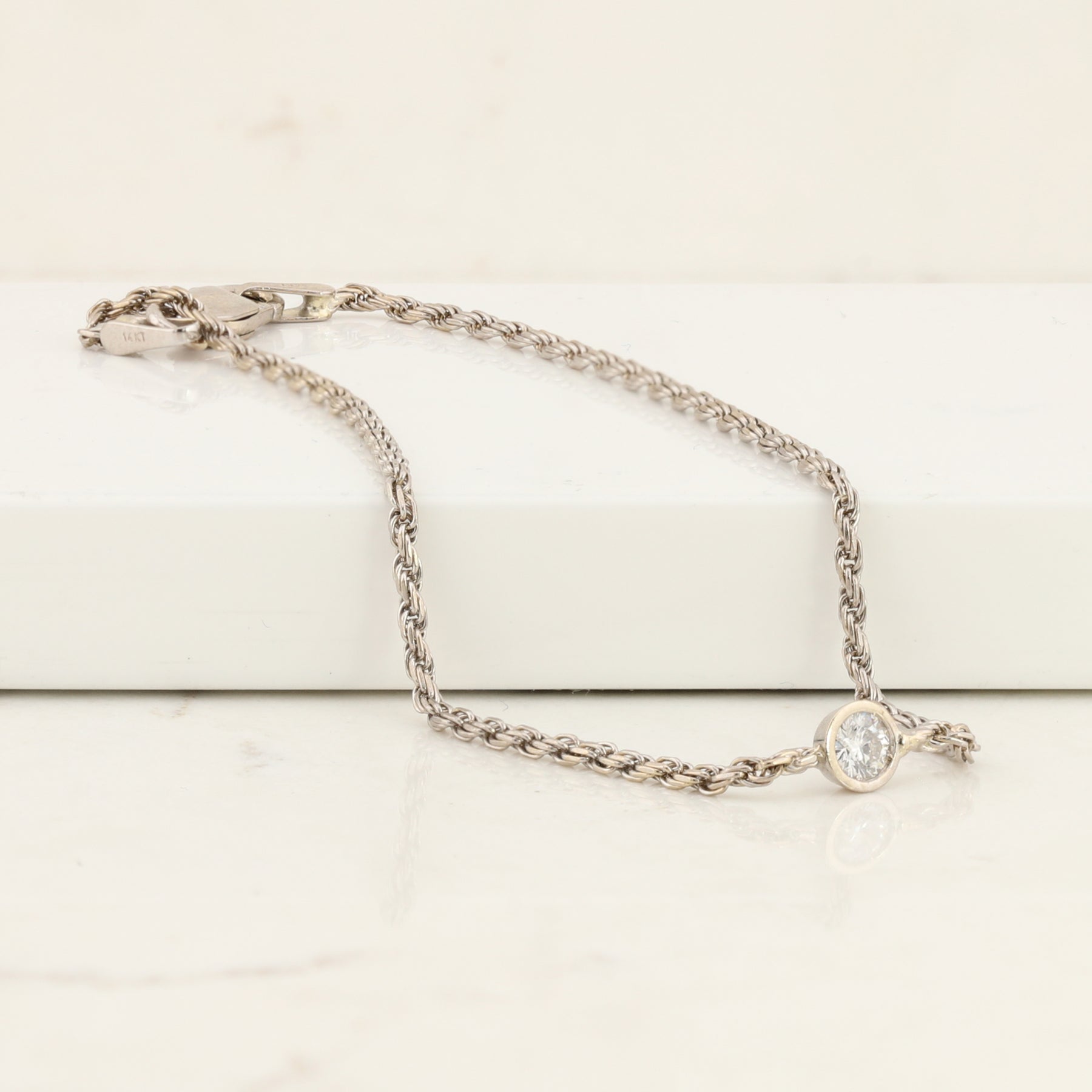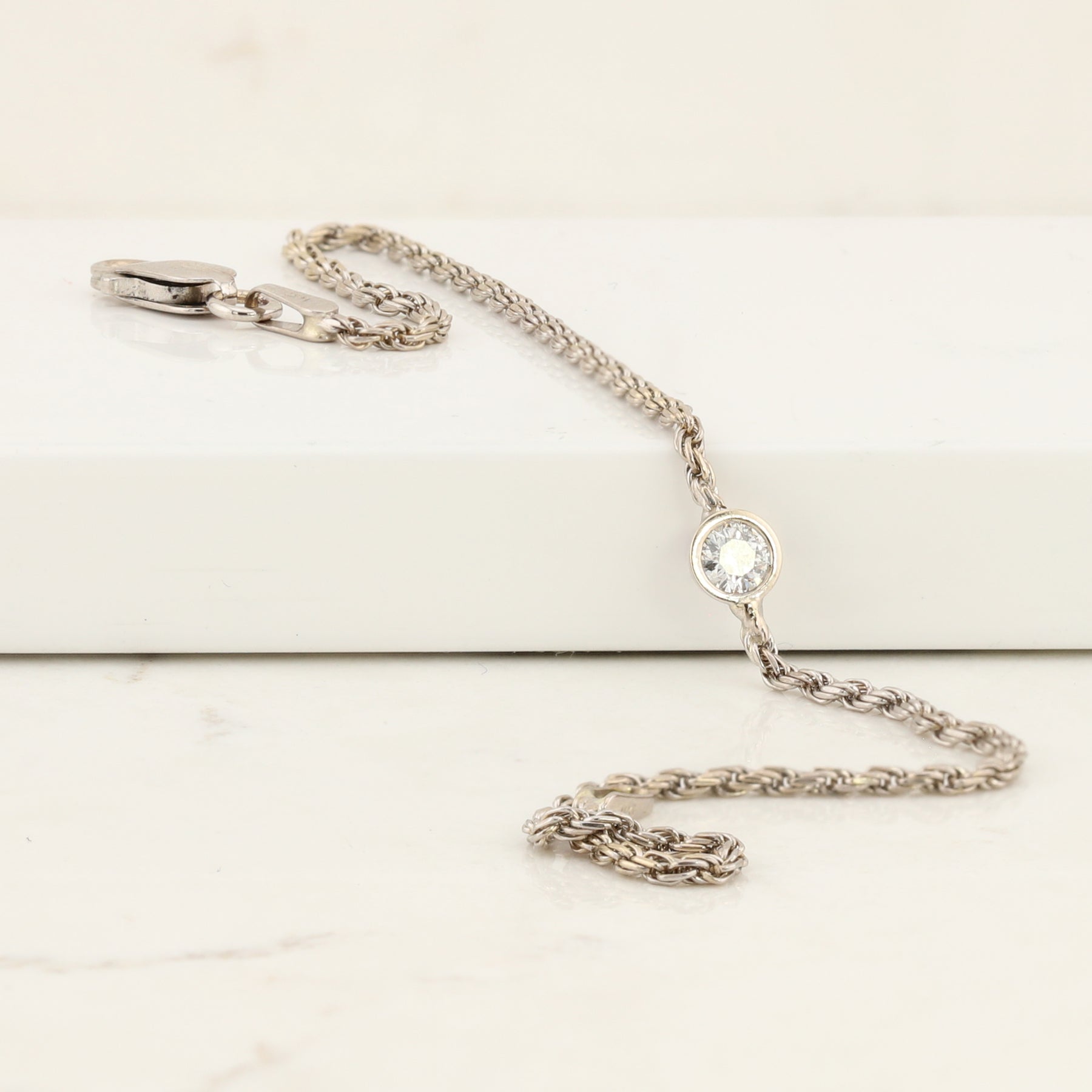 This is a 14kt white gold and diamond station bracelet, set in a bezel. The bracelet measures 7.25 inches in length.