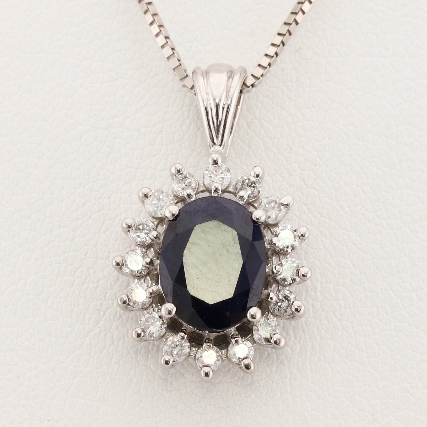 14kt white gold pendant with a diamond cluster oval sapphire pendant. The chain is 16 inches in length.