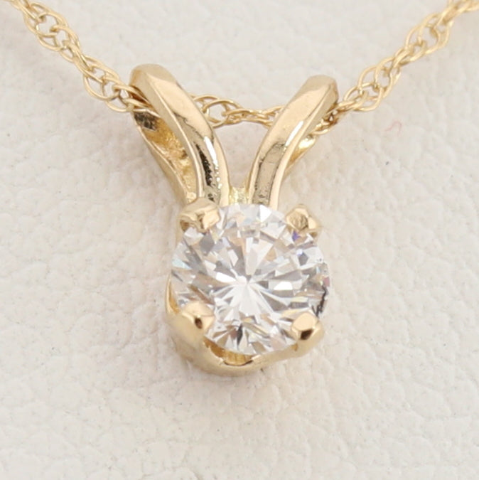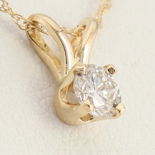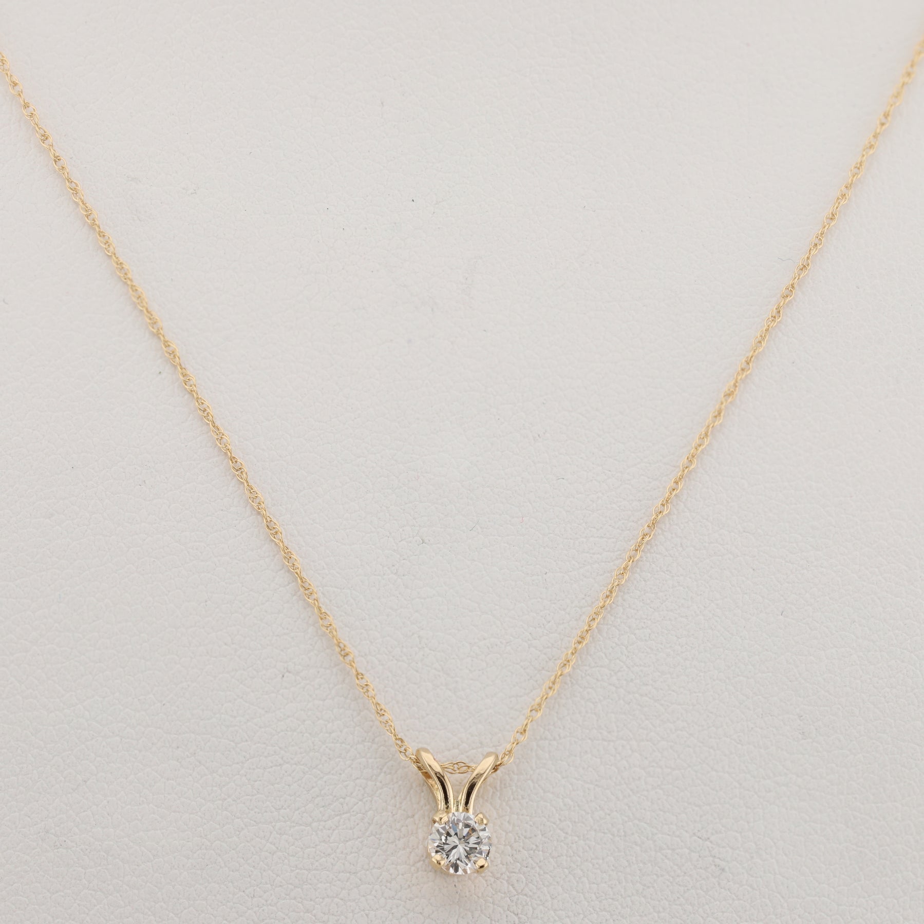 This classic pendant features a .15ct natural diamond suspended in a double bail, 4 claw setting to let that natural diamond sparkle like it was born to do. This pendant is paired with a delicate 14kt gold twisted rope type chain that allows this diamond to take center stage. The refined design combines timeless sophistication with everyday versatility, making it a must-have addition to any jewelry collection.