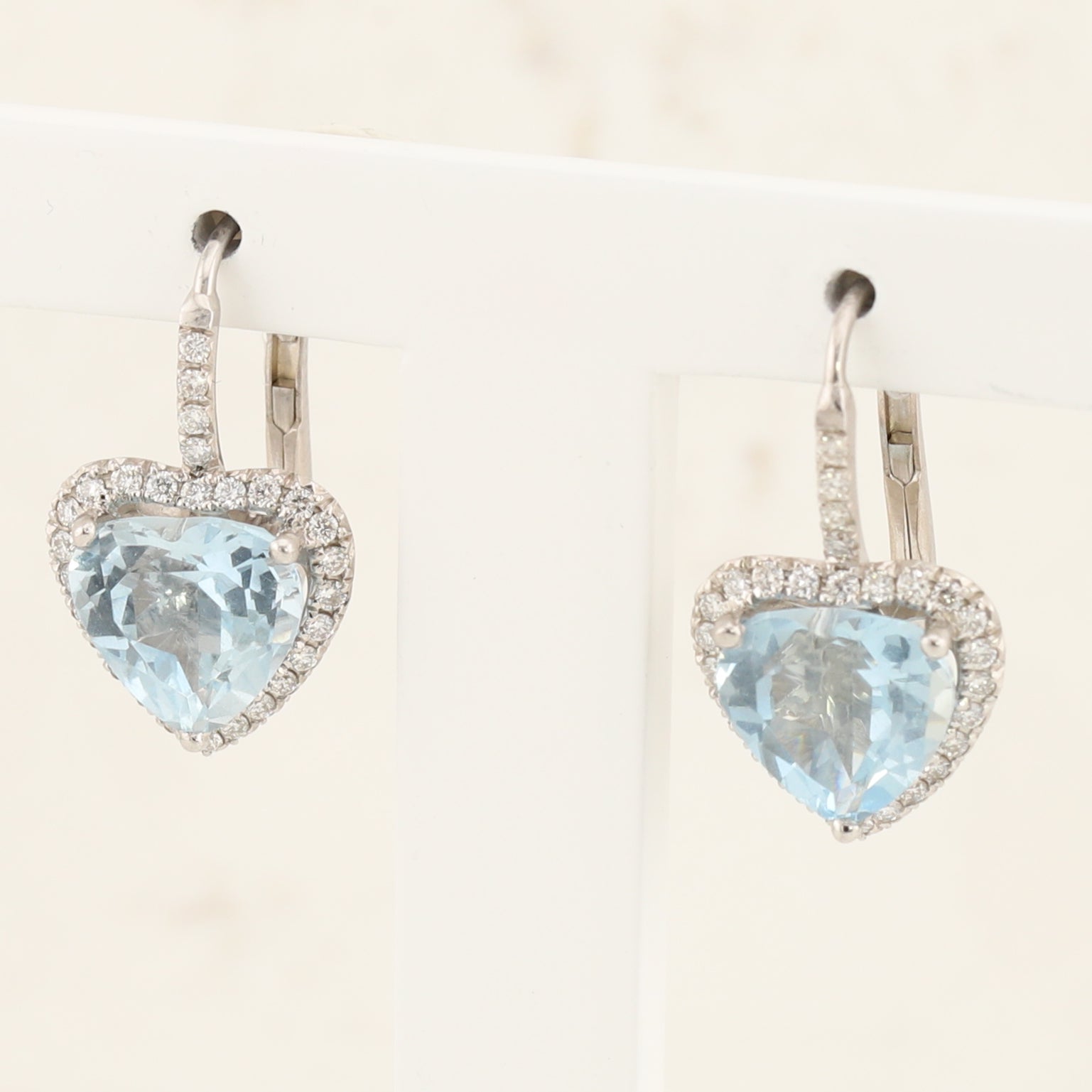 14kt white gold diamond halo surround these large heart cut aquamarine stone, they have a lever back setting