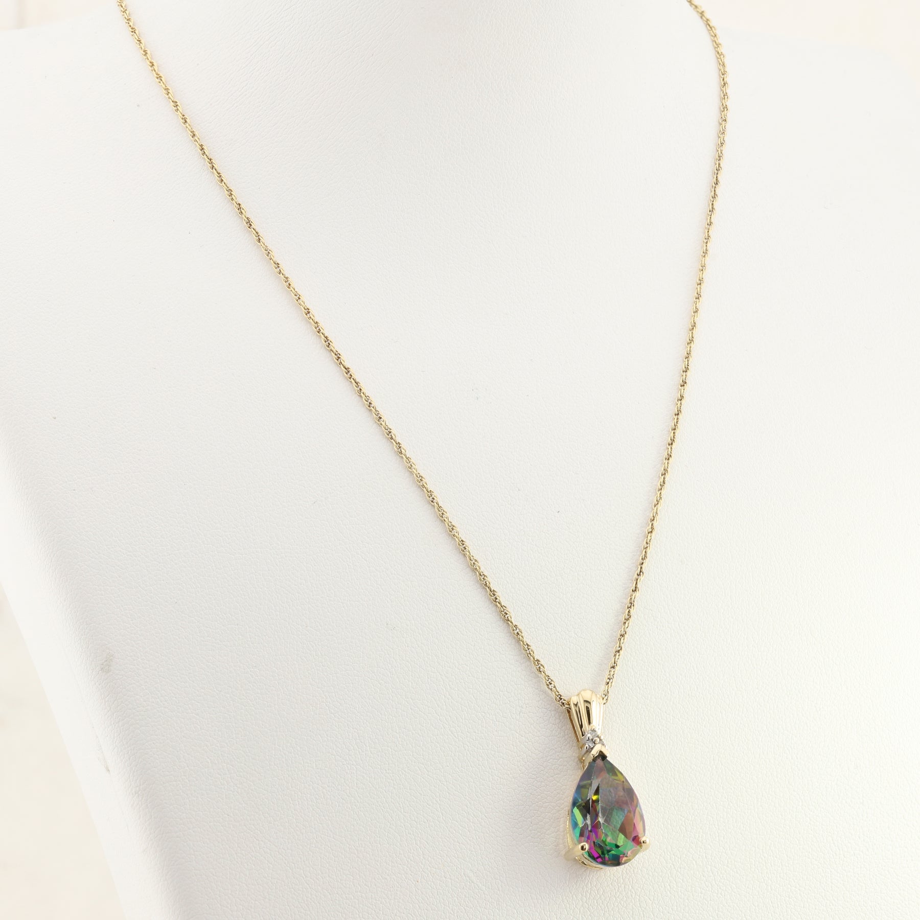 10kt yellow gold pendant set with a pear shaped mystic topaz. The chain measures 18 inches in length