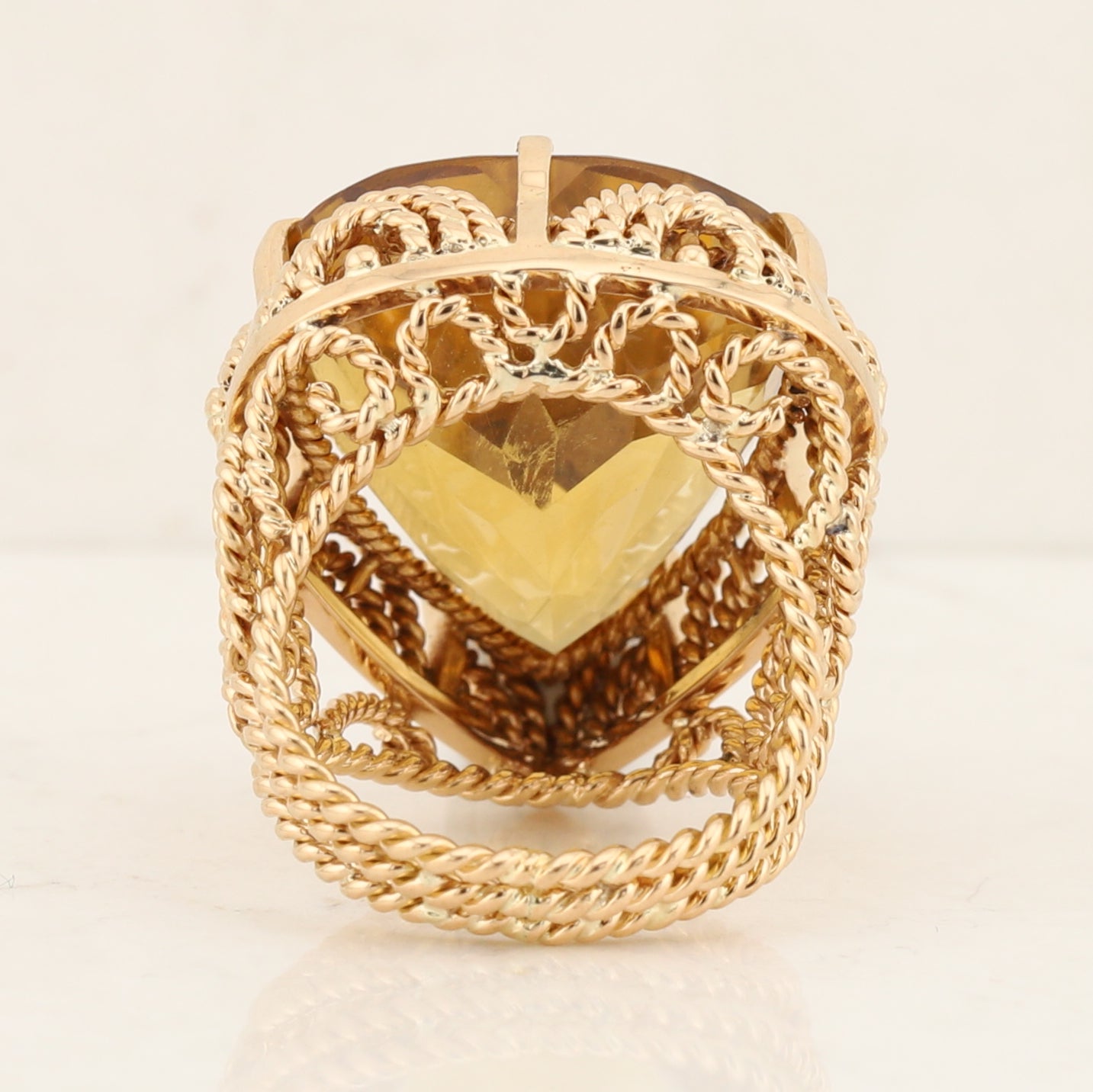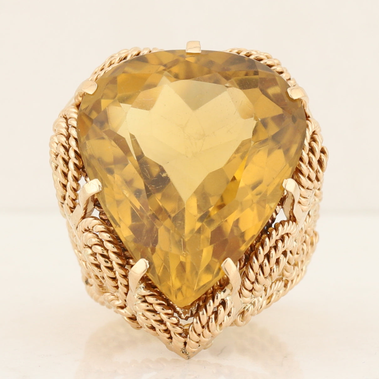 18kt yellow gold wire and filigree ring set with a large pear shaped citrine quartz measuring approximately be leverage gauge 24mm x 19mm. The ring is a finger size 4
