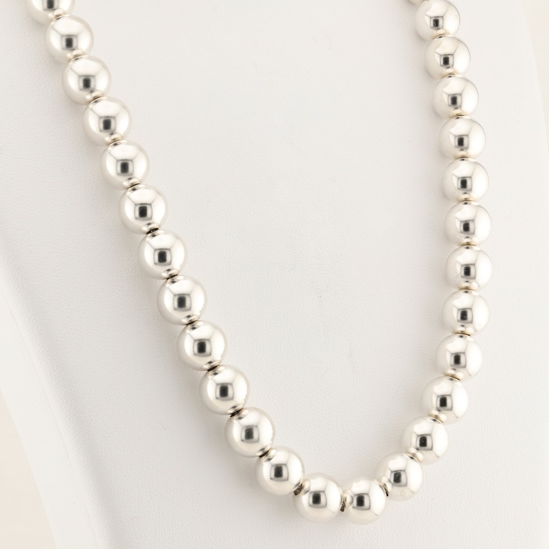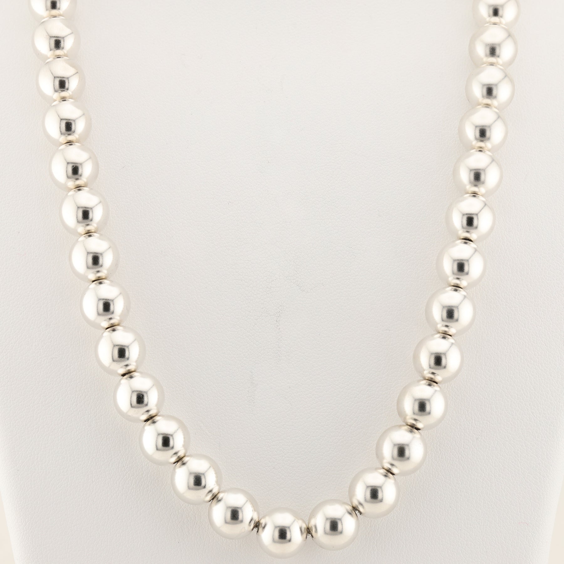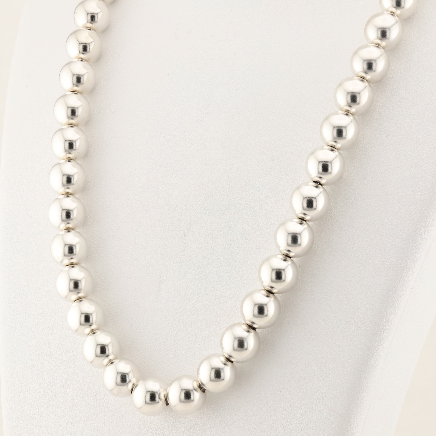 This 18" iconic (AG925) necklace features a striking string of 46 sterling silver spheres, as well as discreetly displaying the small Tiffany & Co. stamped tag, hanging near the clasp. This necklace is truly a genuine classic.