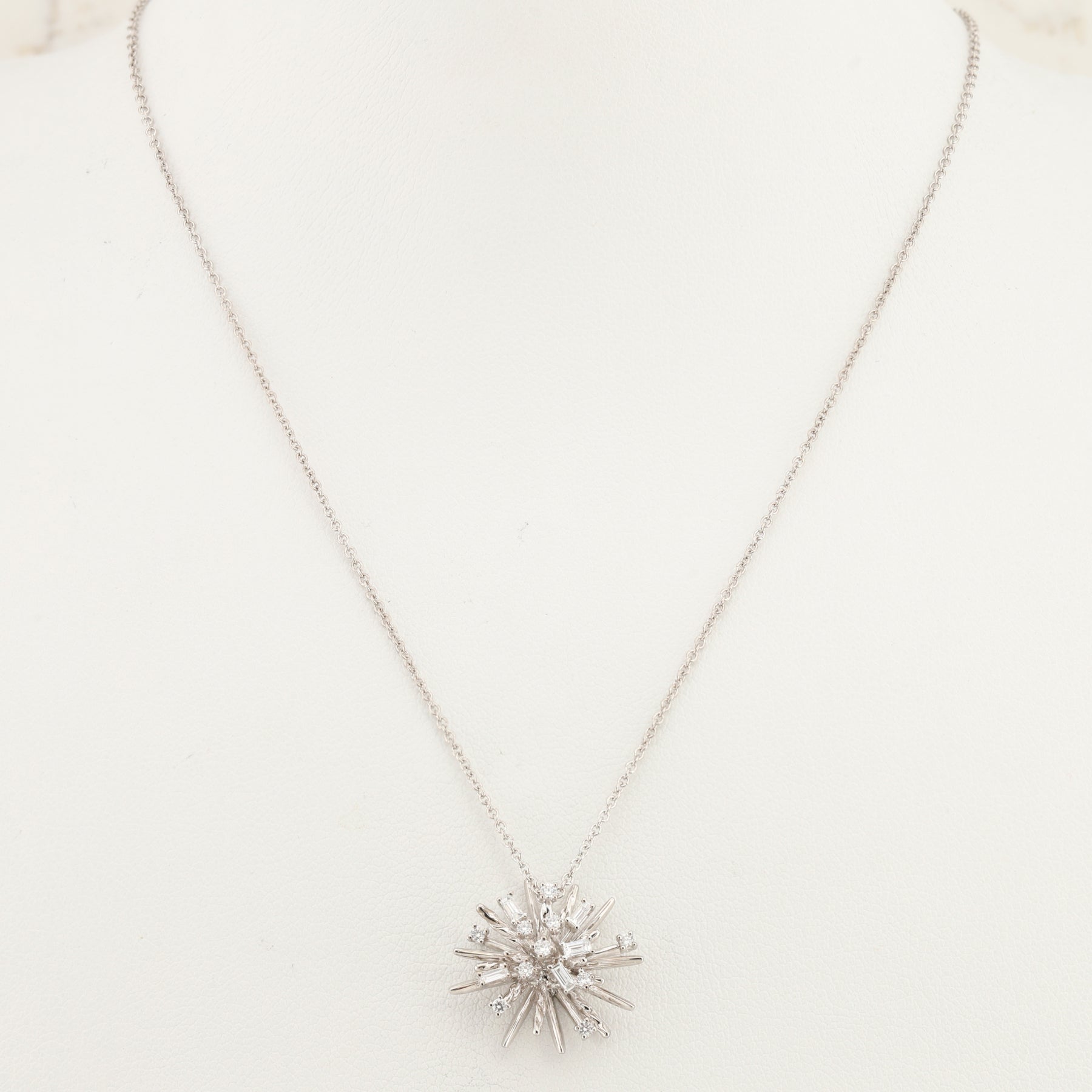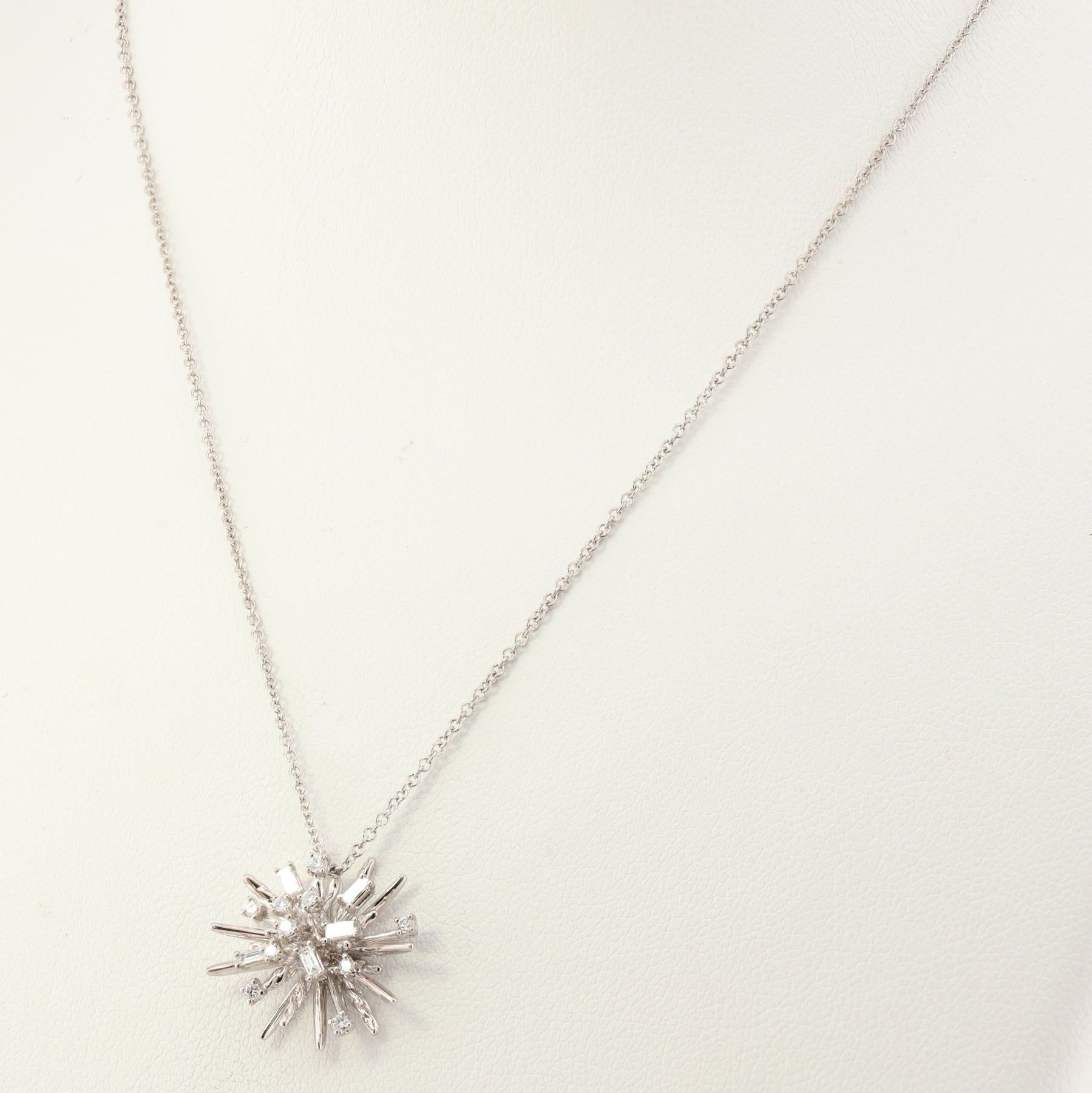18kt white gold & diamond pendant in the shape of a wishing star or dandelion design. The chain is 18 inches in length