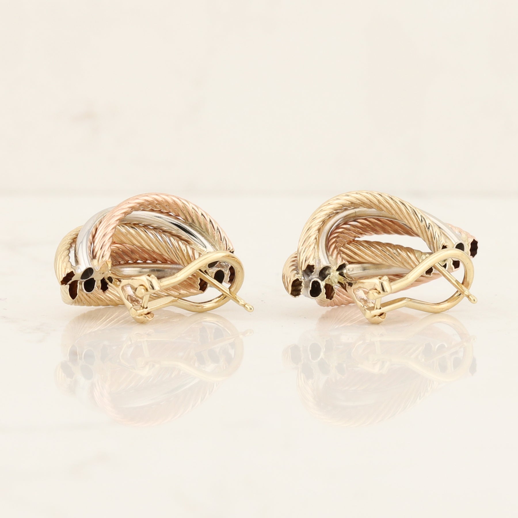 14kt yellow, rose and white gold twist earrings, with omega back wire and post setting.