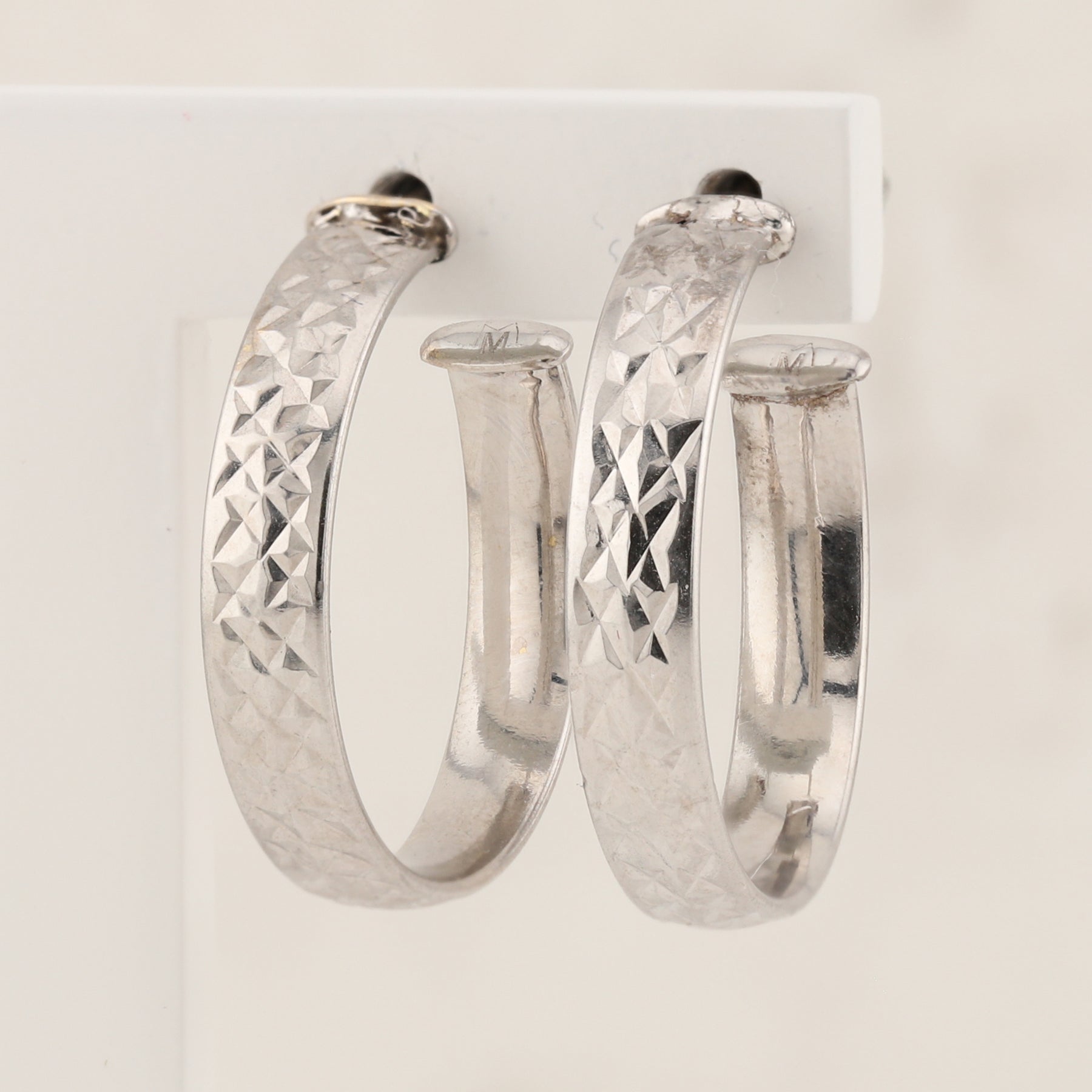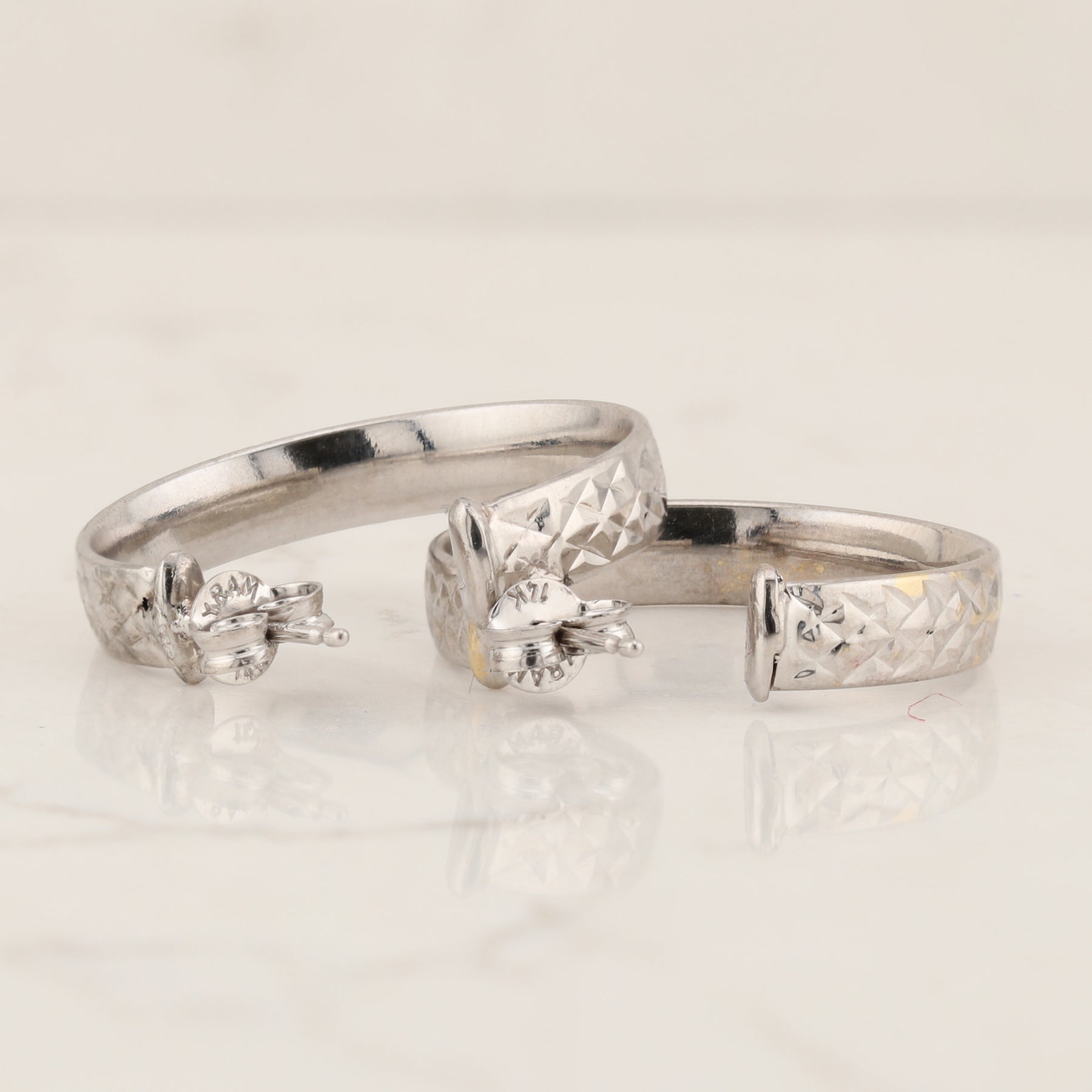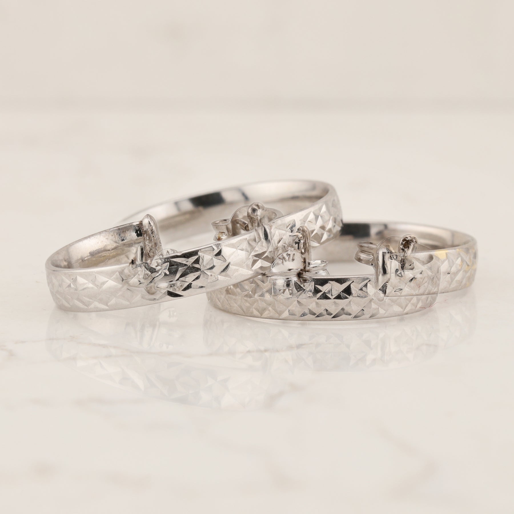These lovely hoop earrings feature a lustrous 14kt white gold construction with a distinctive hammered diamond texture that catches the light beautifully. Measuring approximately 21mm in diameter and about 4mm wide (across the textured surface), they offer a modern yet timeless look. The open ring style paired with secure butterfly backs ensures comfortable, all-day wear. Perfect for adding a touch of sophistication to any outfit.