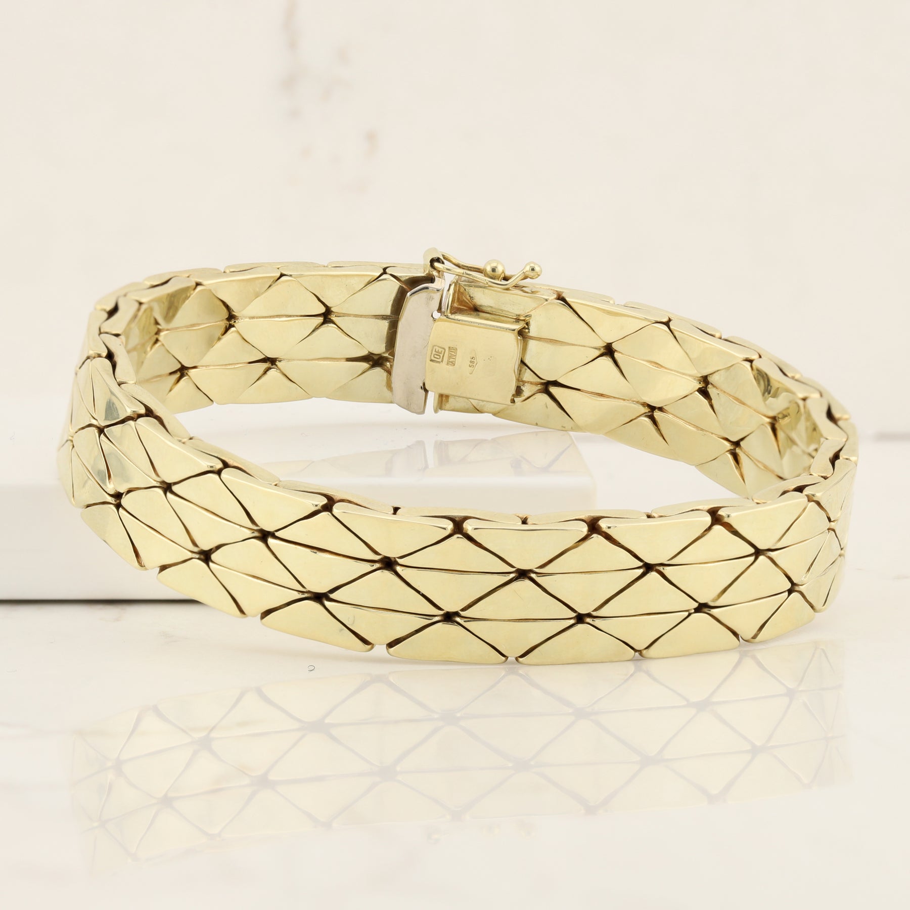 This wide, hollow link 18kt yellow gold fancy bracelet measures 7.5 inches in length and 1/2 inch wide.