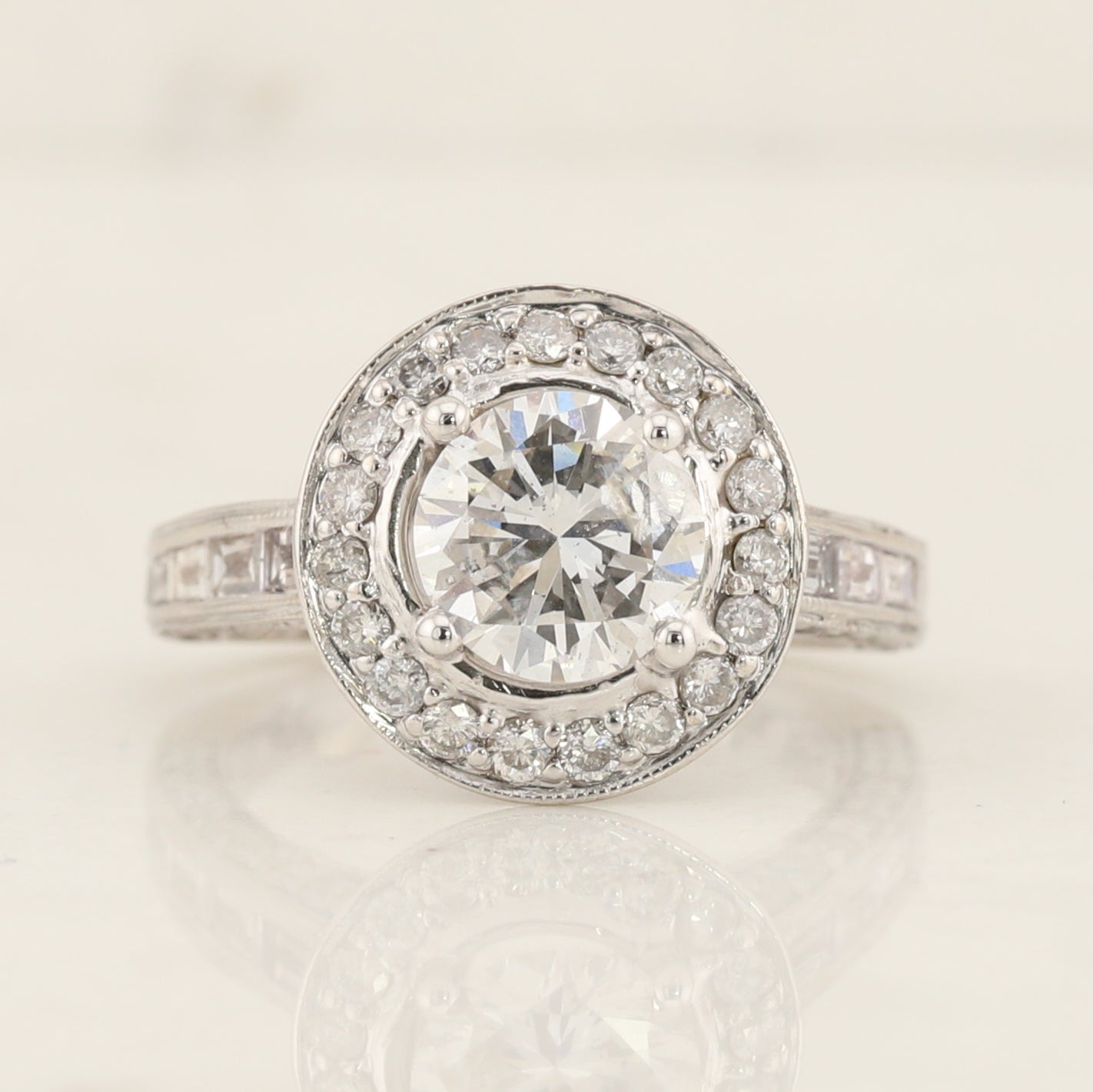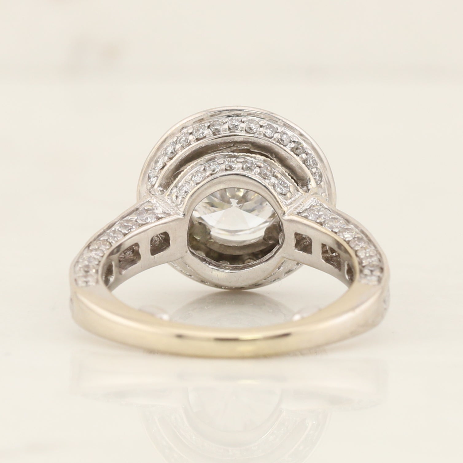 Gorgeous halo ring set with a 1.59ct, I1 clarity grade, F-G colour natural diamond. The ring is spectacular, encrusted with diamonds on all three sides. Come on in and try this on, it must be seen to be appreciated.