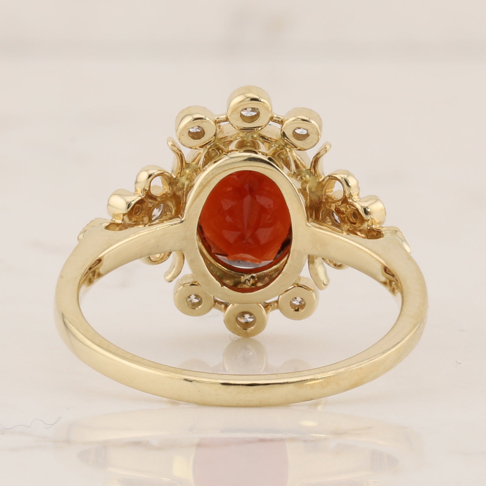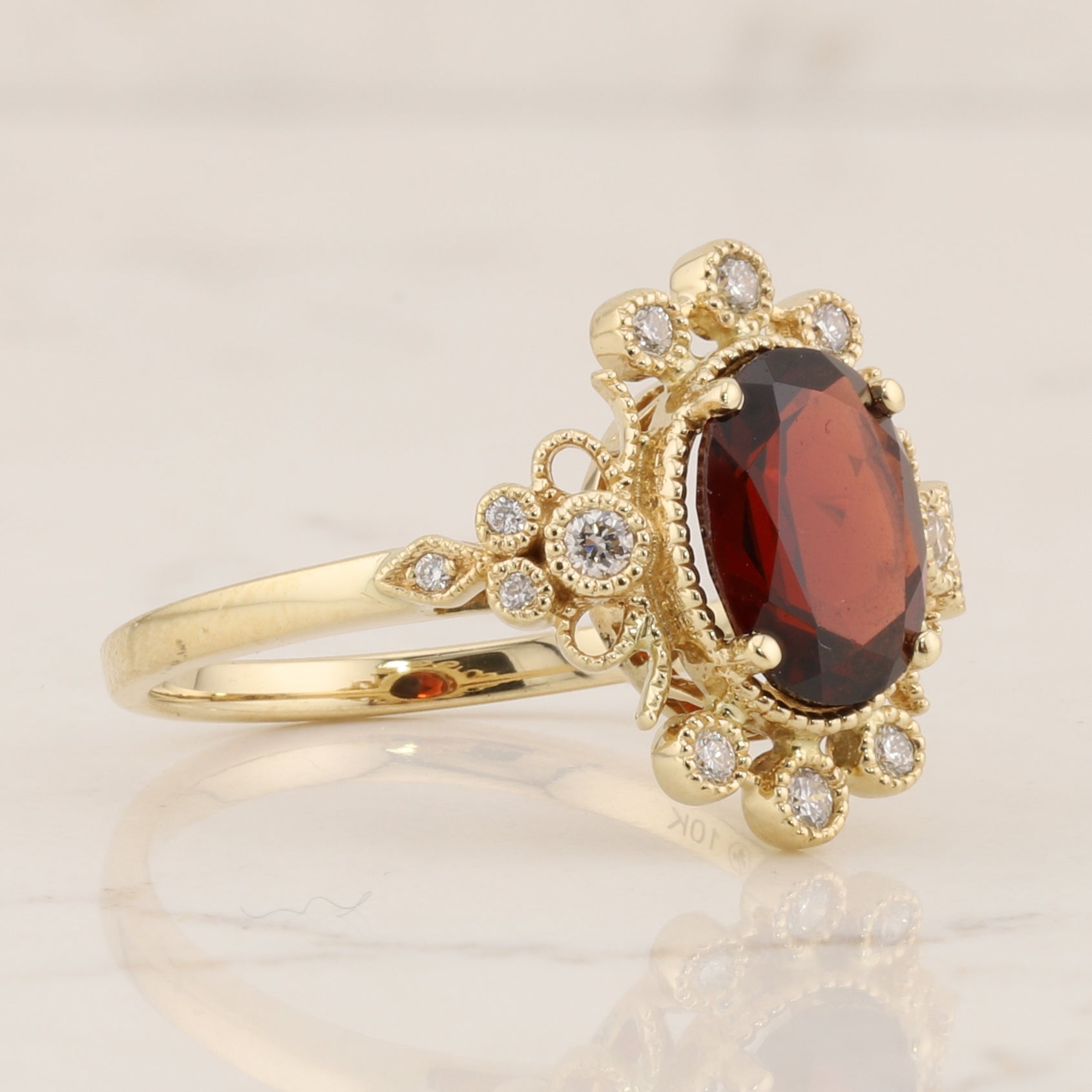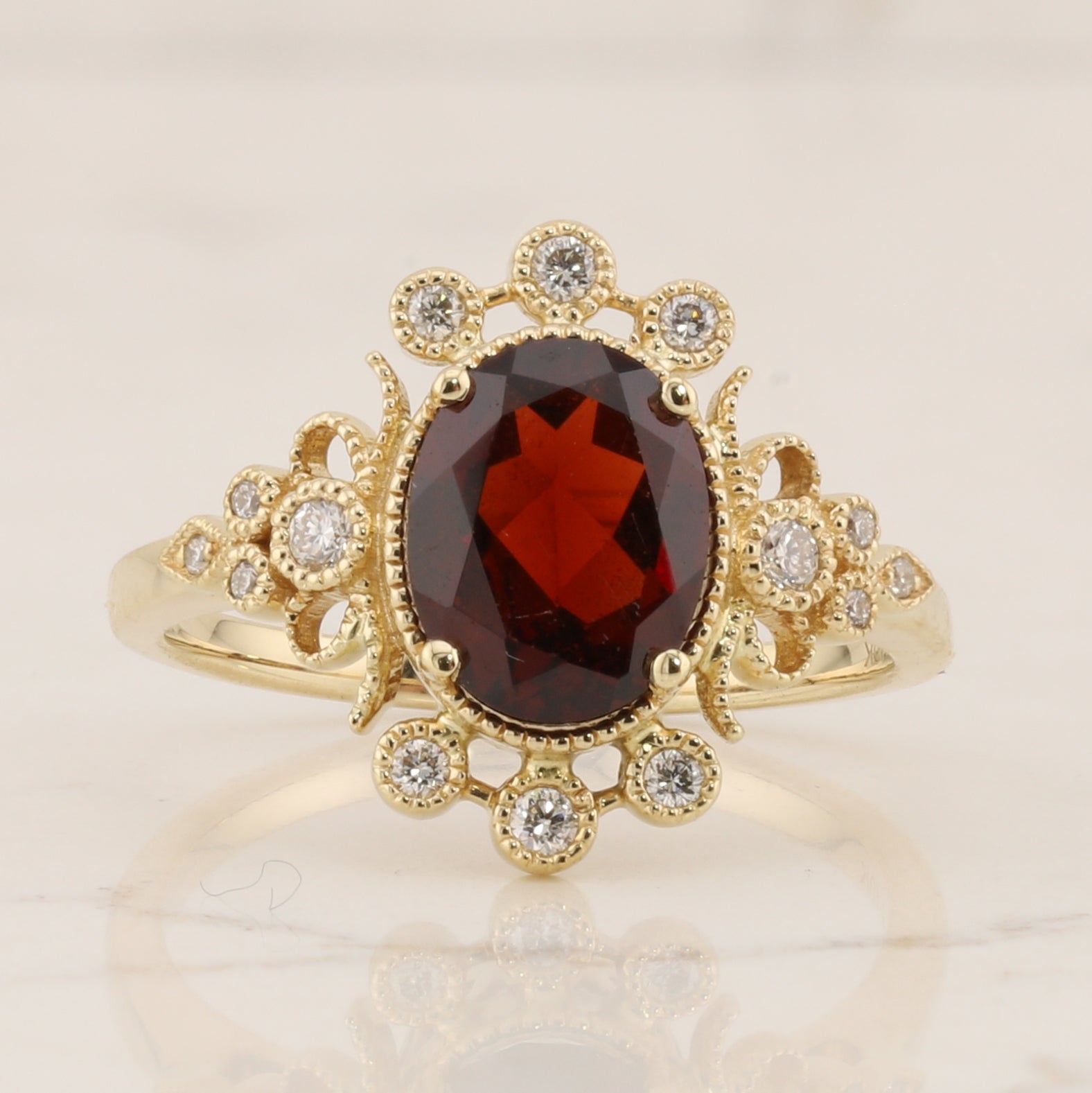 Elegant 10kt yellow gold ring featuring a striking oval garnet centerpiece, beautifully complemented by sparkling diamond accents. The intricate milgrain detailing adds vintage-inspired sophistication and texture to the band. This timeless piece combines the deep, rich warmth of garnet with the brilliance of diamonds, creating a distinctive look perfect for everyday wear or special occasions.