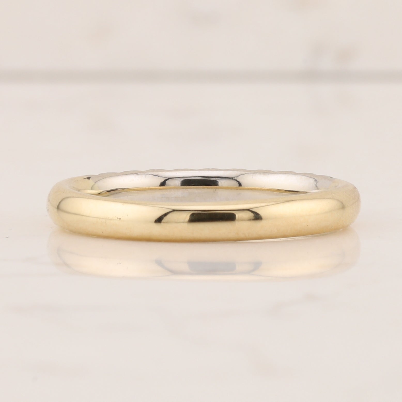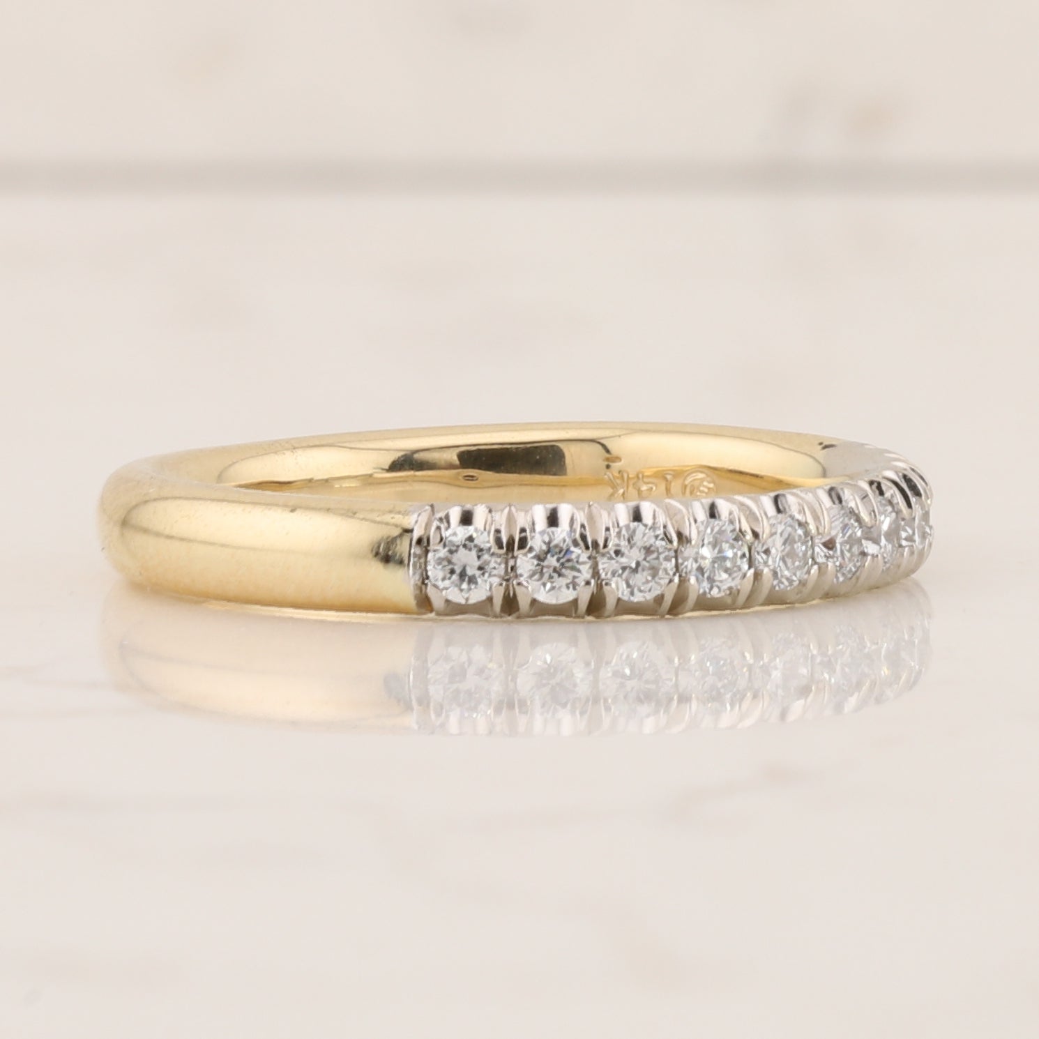 Featuring 0.33 carats total diamond weight (TDW) with VS1–VS2 clarity and F–G colour, each diamond is carefully set to create a continuous, radiant line along the top of the band. The warm 14kt yellow gold shank is perfectly complemented by a white gold setting that elevates the diamonds, allowing their brilliance and clarity to shine with understated sophistication.