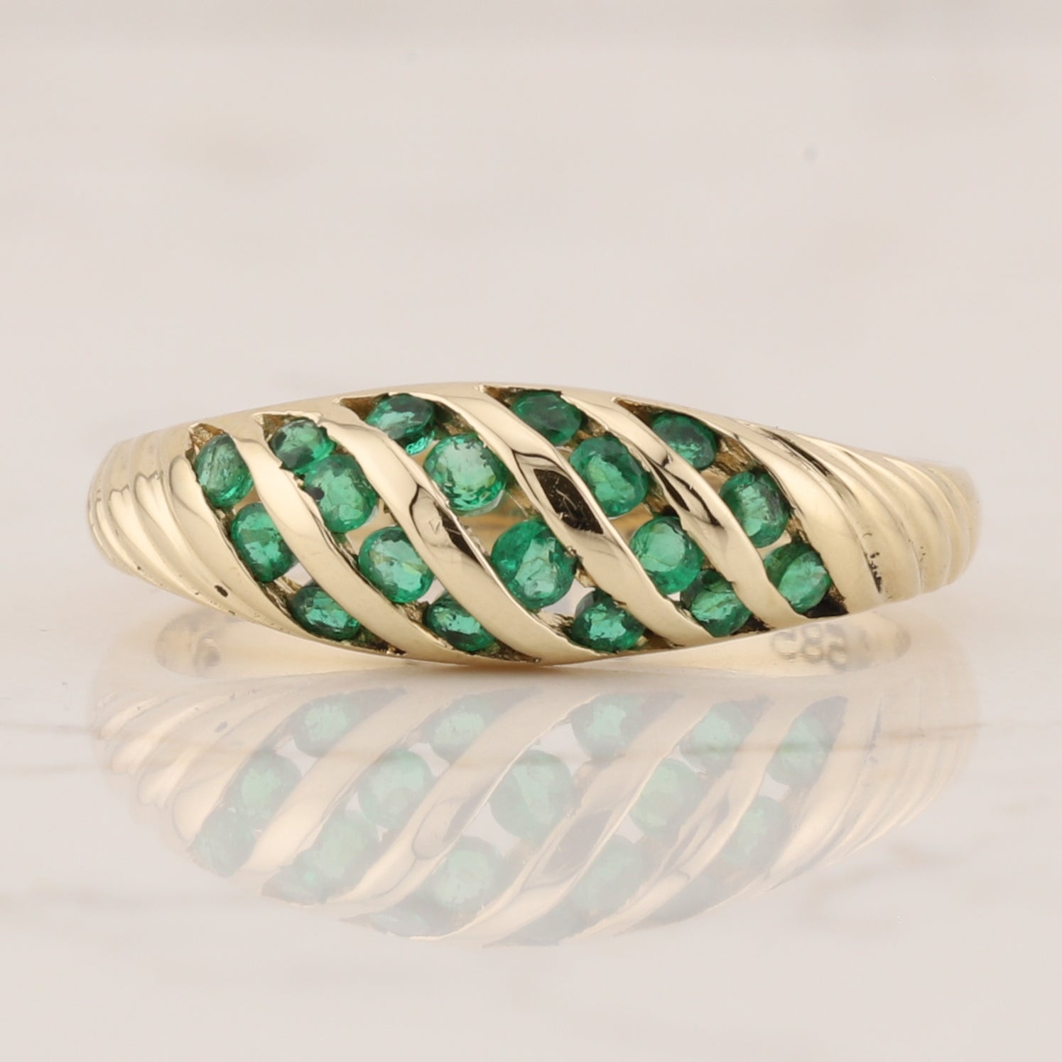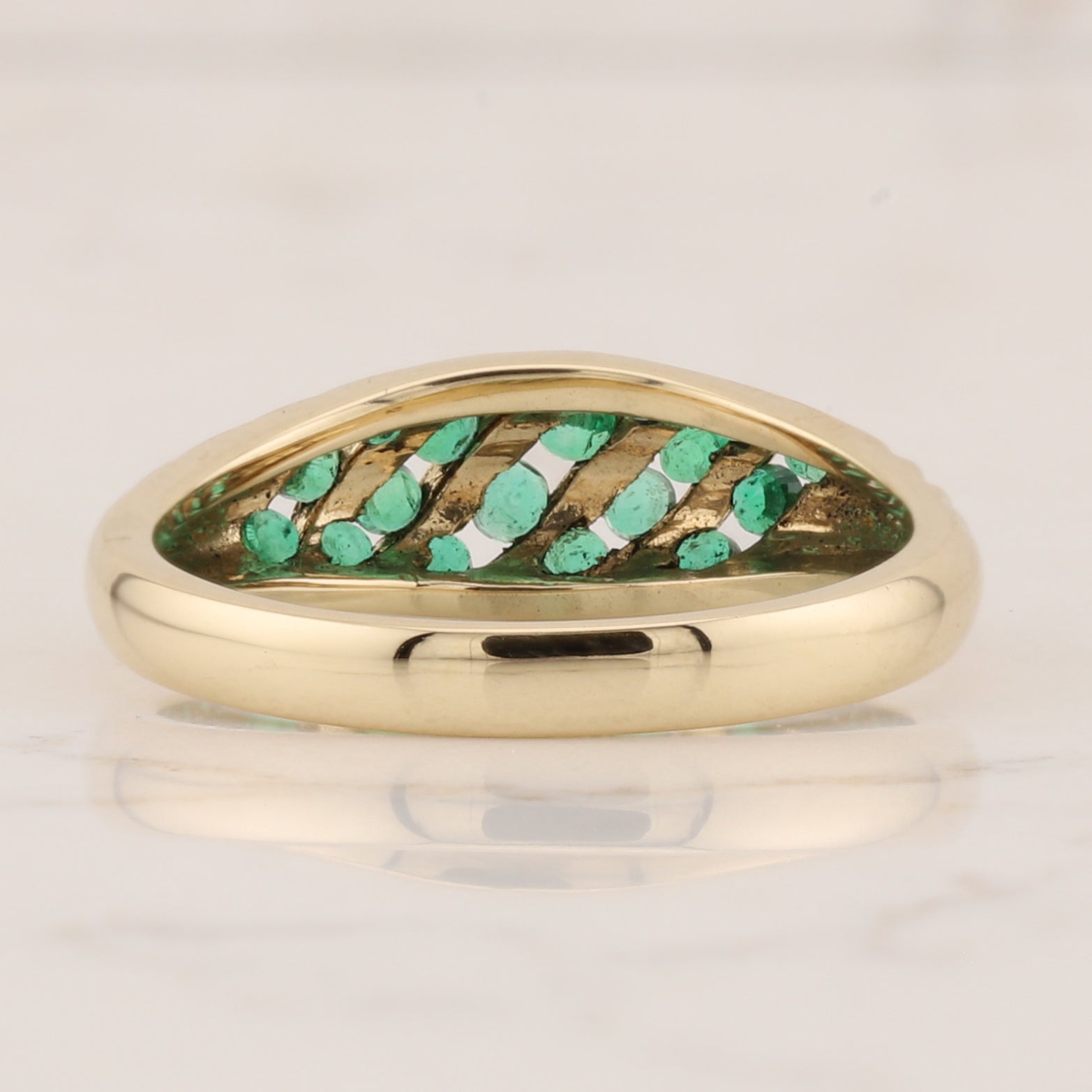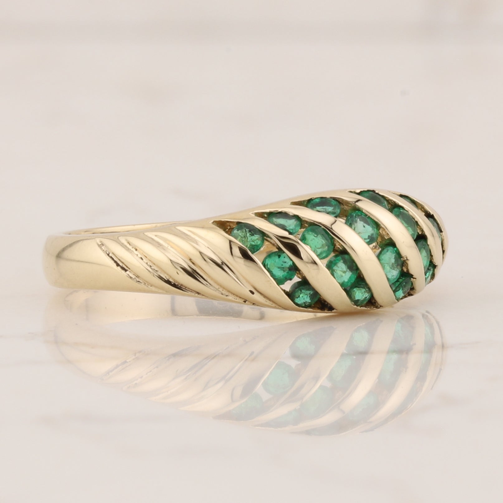 Sophisticated 14 kt gold band displaying five rows of vibrant emeralds in a secure channel setting. The alternating pattern of lustrous gold and rich green stones creates striking visual depth, making this piece equally suited for daily elegance or special occasions. A versatile addition to any jewellery collection. Size 6.5.