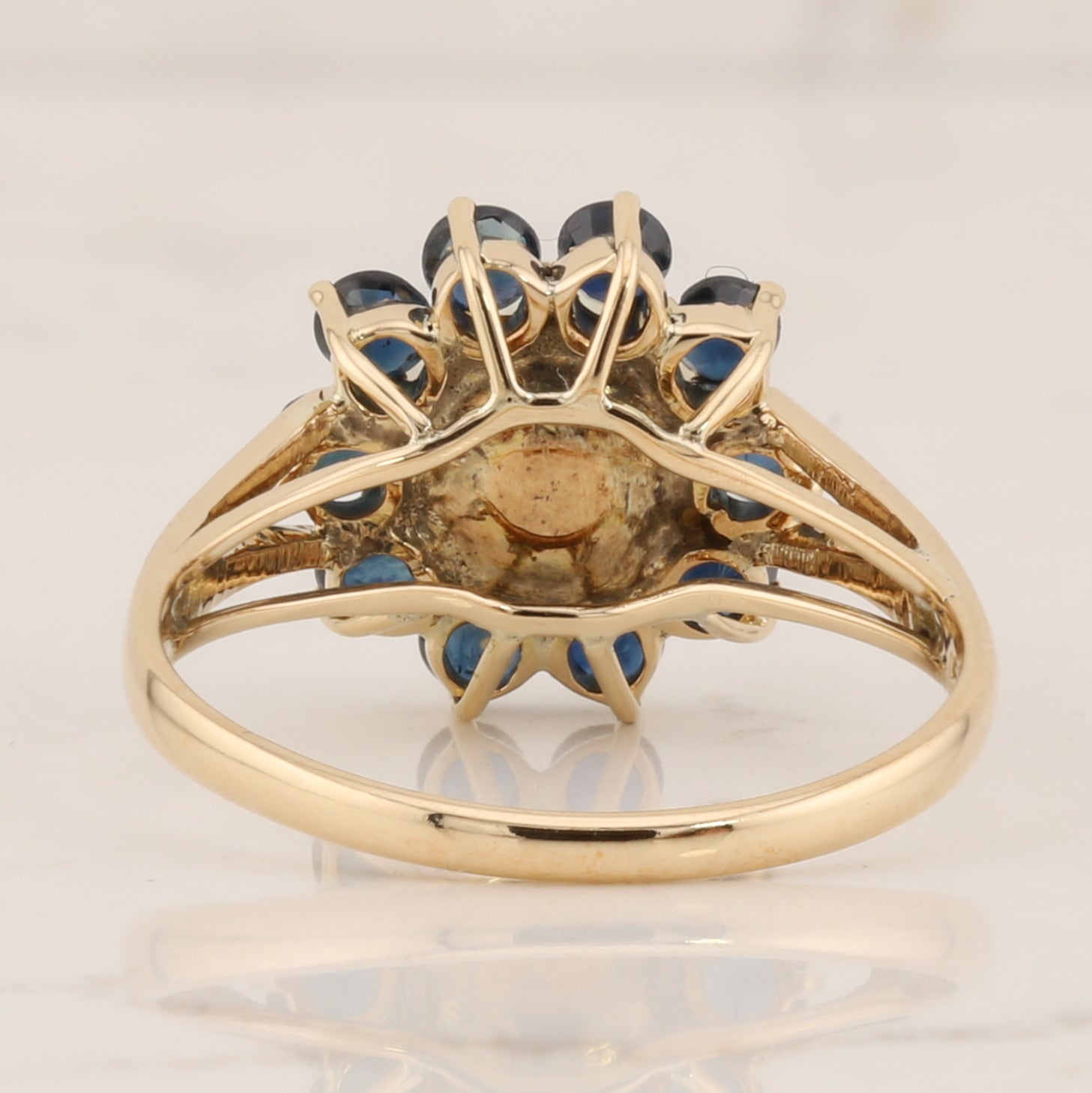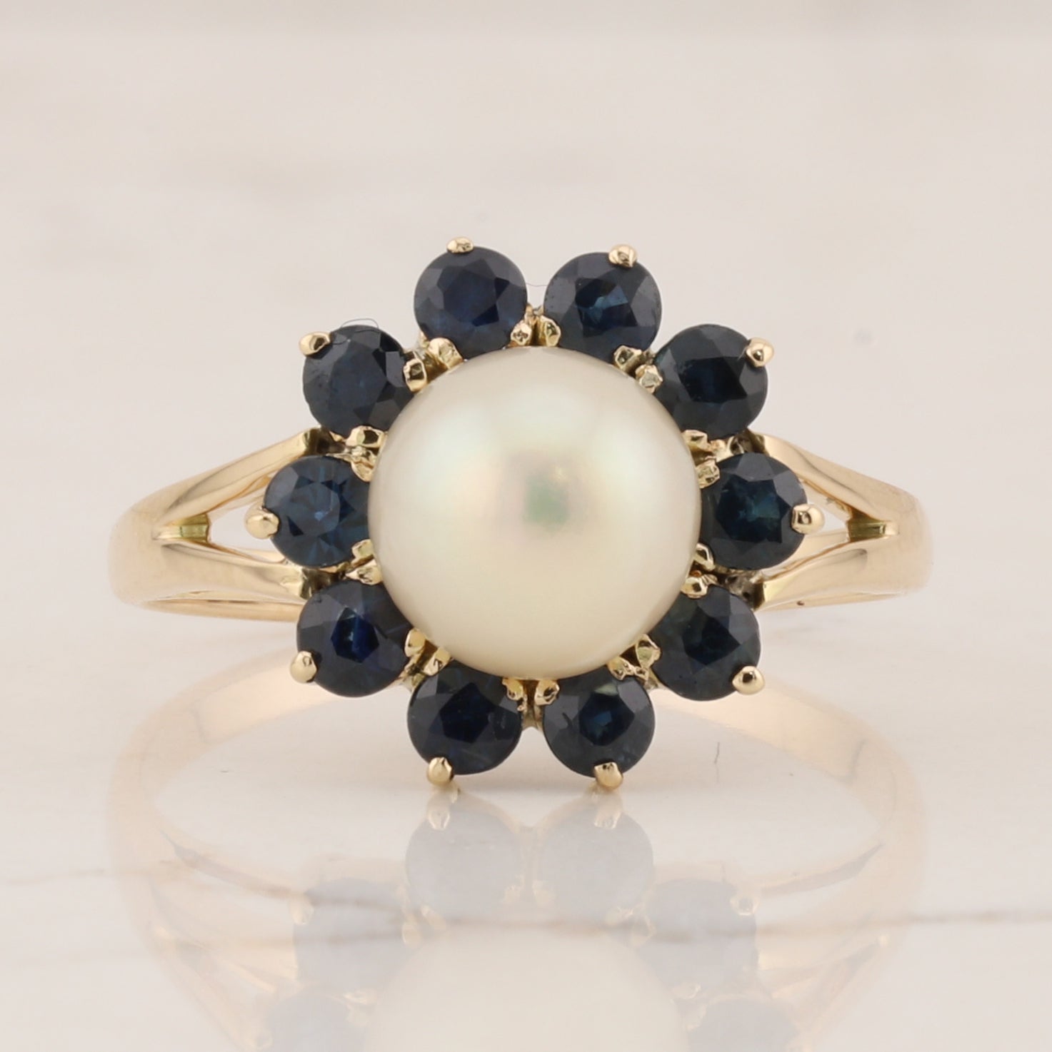 Elegant 14 kt yellow gold ring featuring a lustrous pearl at its center, encircled by a stunning halo of vibrant sapphires. The classic halo design amplifies the pearl's radiance while the rich blue sapphires add depth and sophistication. Perfect for engagements, anniversaries, or as a timeless statement piece that celebrates refined taste and enduring beauty.