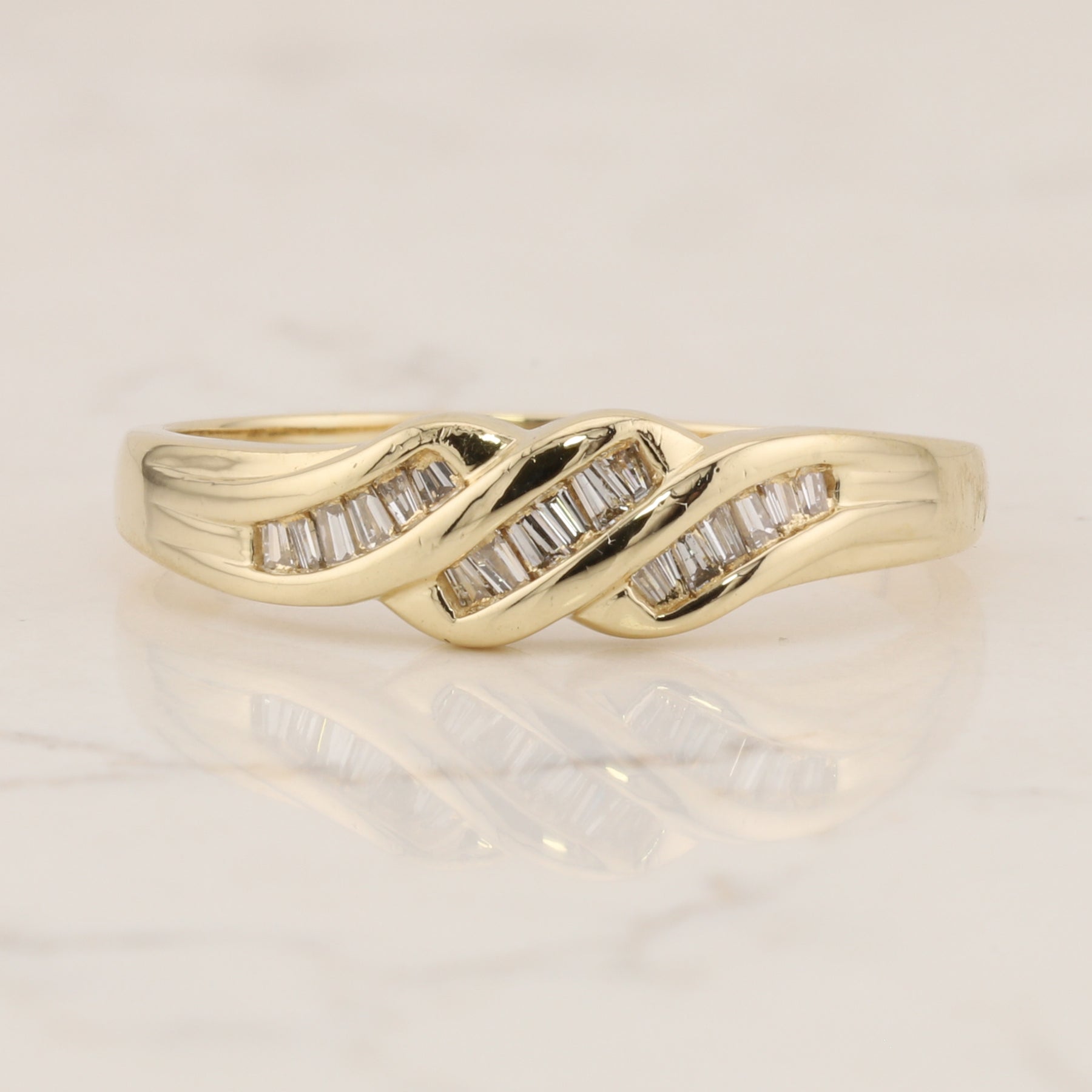 Elegant 14kt yellow gold bypass ring featuring three curved channels set with baguette diamonds. Sized at 11.25, this contemporary design showcases the timeless appeal of baguette-cut stones arranged in flowing channels that gracefully sweep across the band. The bypass silhouette creates a modern, sophisticated look while the warm glow of yellow gold complements the brilliant sparkle of the diamonds. Perfect for those seeking a distinctive ring that balances classic elegance with contemporary style.