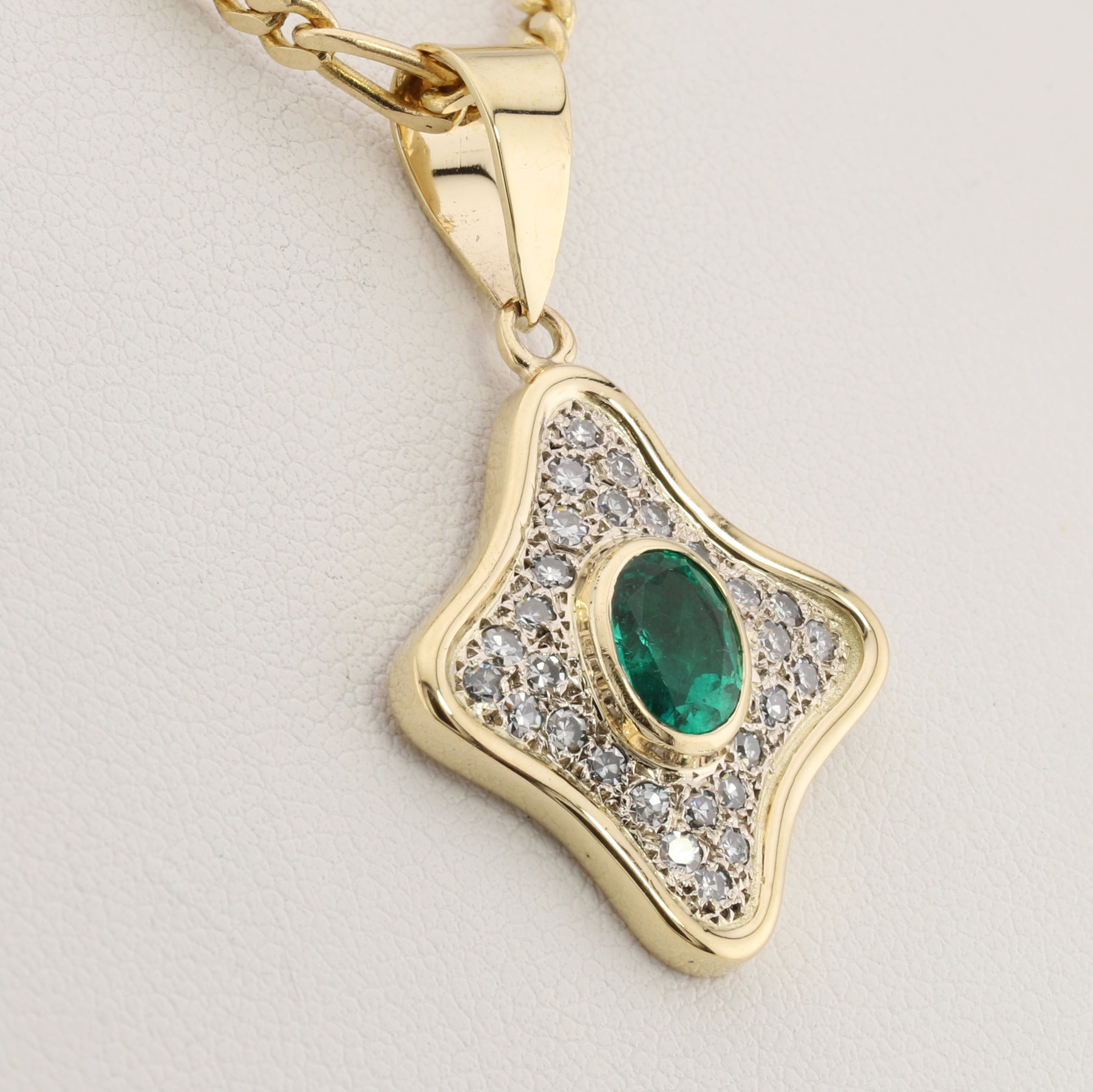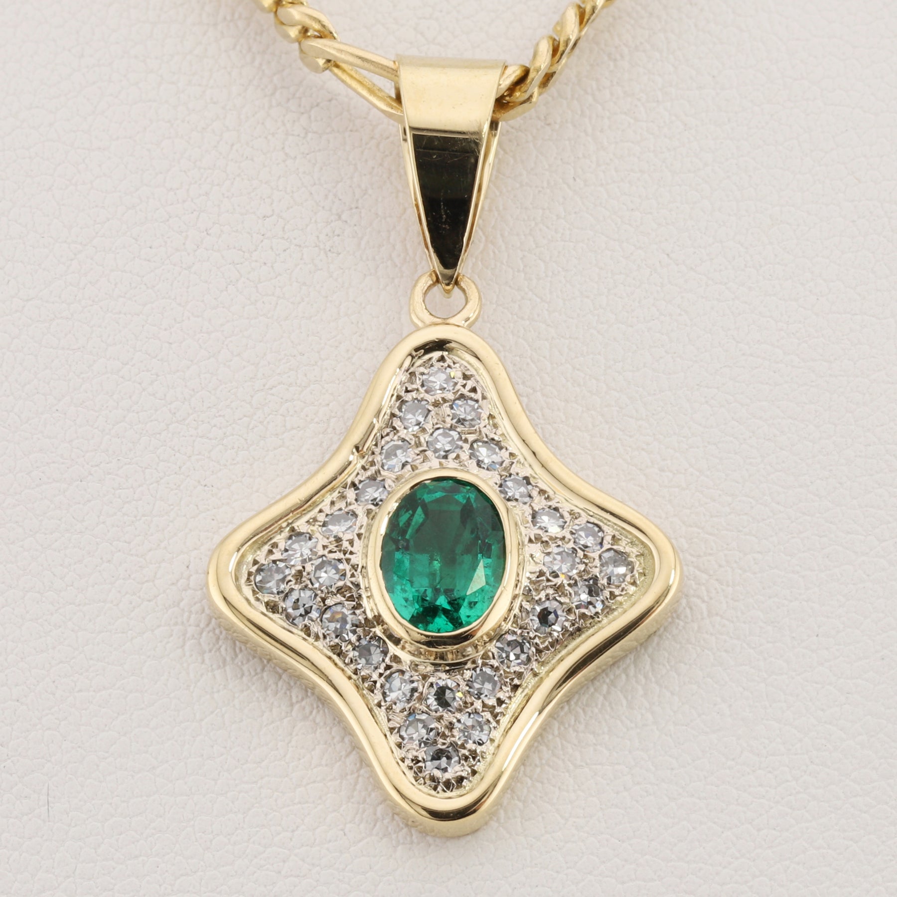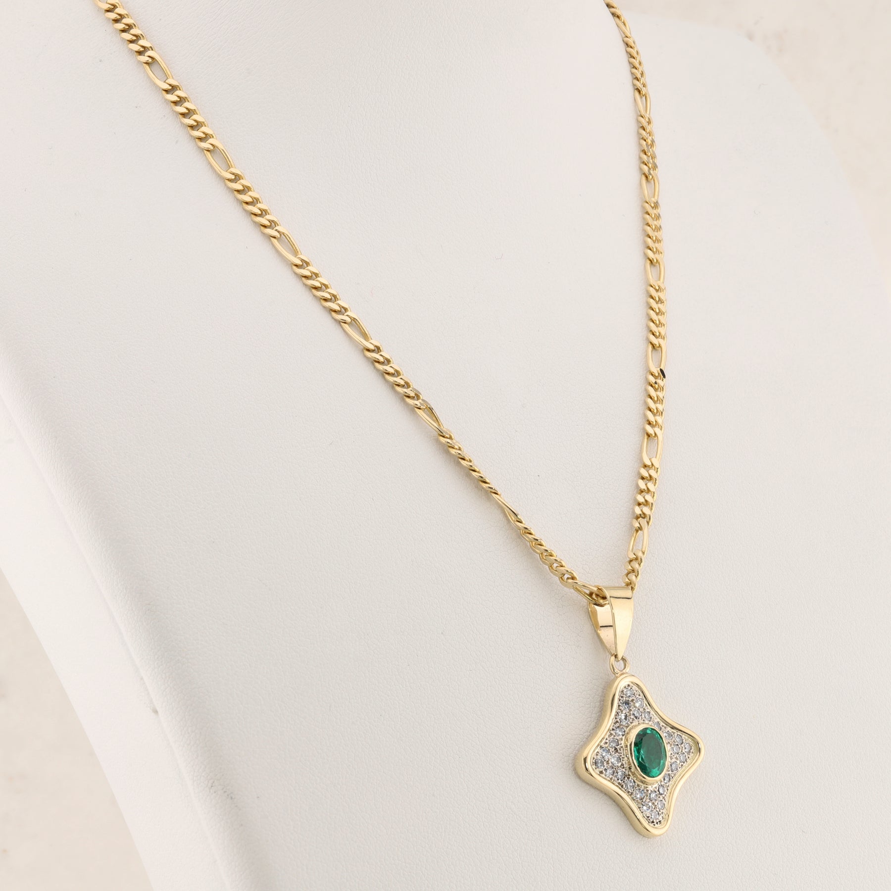 Elegant quatrefoil pendant featuring a vibrant emerald in a secure bezel setting, surrounded by sparkling diamonds that enhance its natural beauty. Crafted in 14kt gold with a substantial polished bail that catches the light beautifully. Suspended from a classic 19" figaro chain, this piece combines timeless design with refined sophistication—perfect for everyday wear or special occasions.