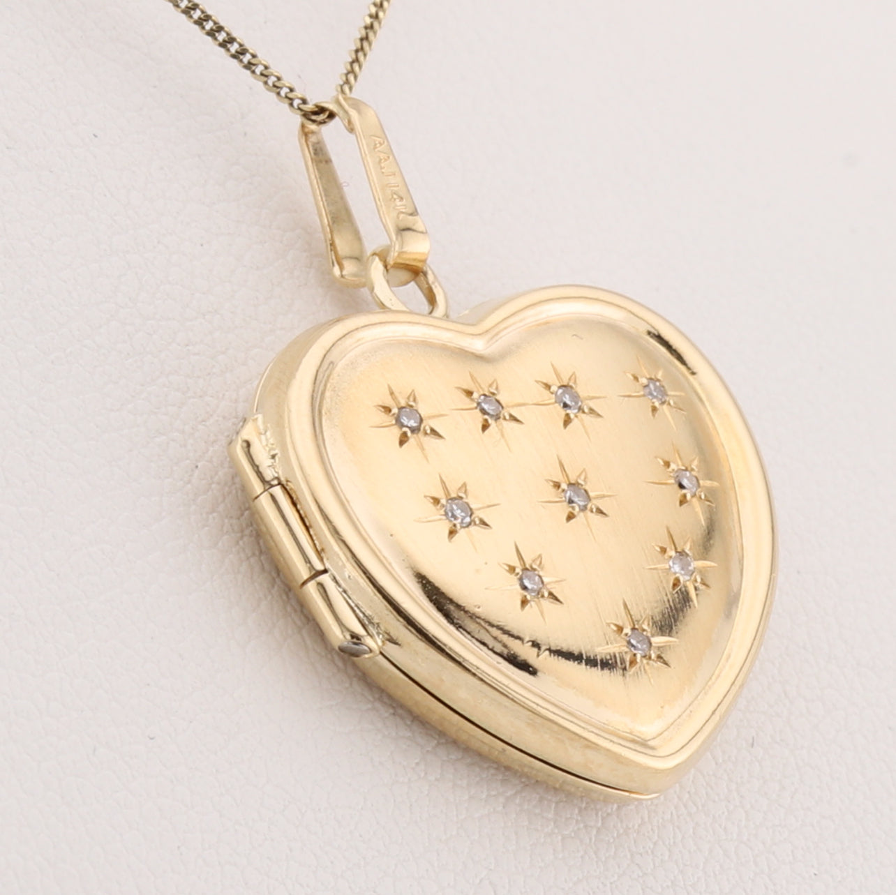 Elegant 14kt yellow gold heart locket featuring stunning clear stone star bursts designs on the front. This timeless piece measures 2.5 cm and makes a perfect keepsake for treasured photos or mementos. The sparkling stone work catches light beautifully, adding sophistication to any jewelry collection. Ideal for gifting or personal wear.(chain not included)