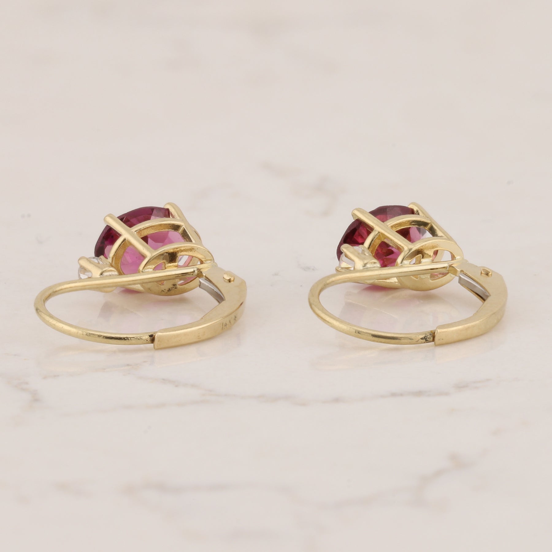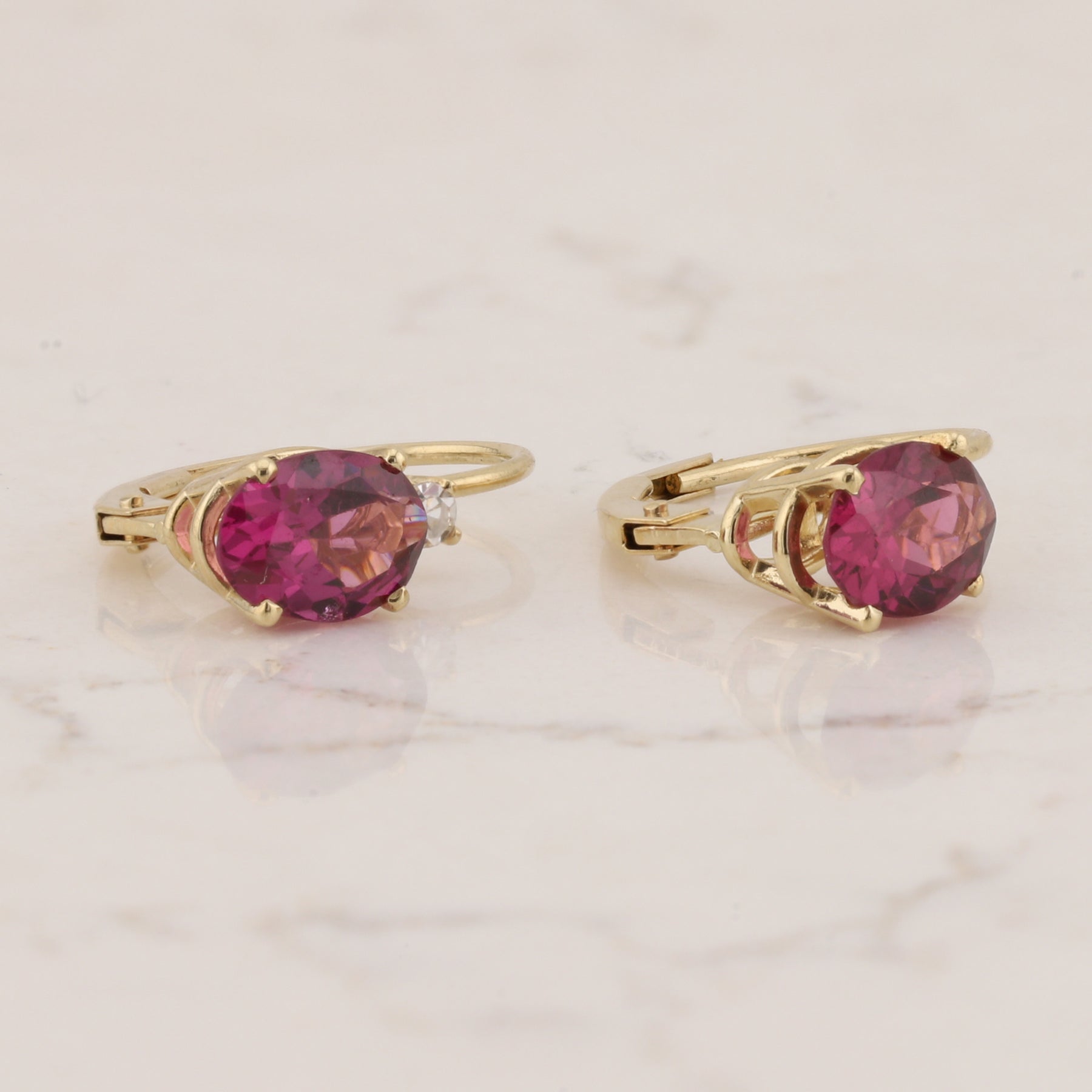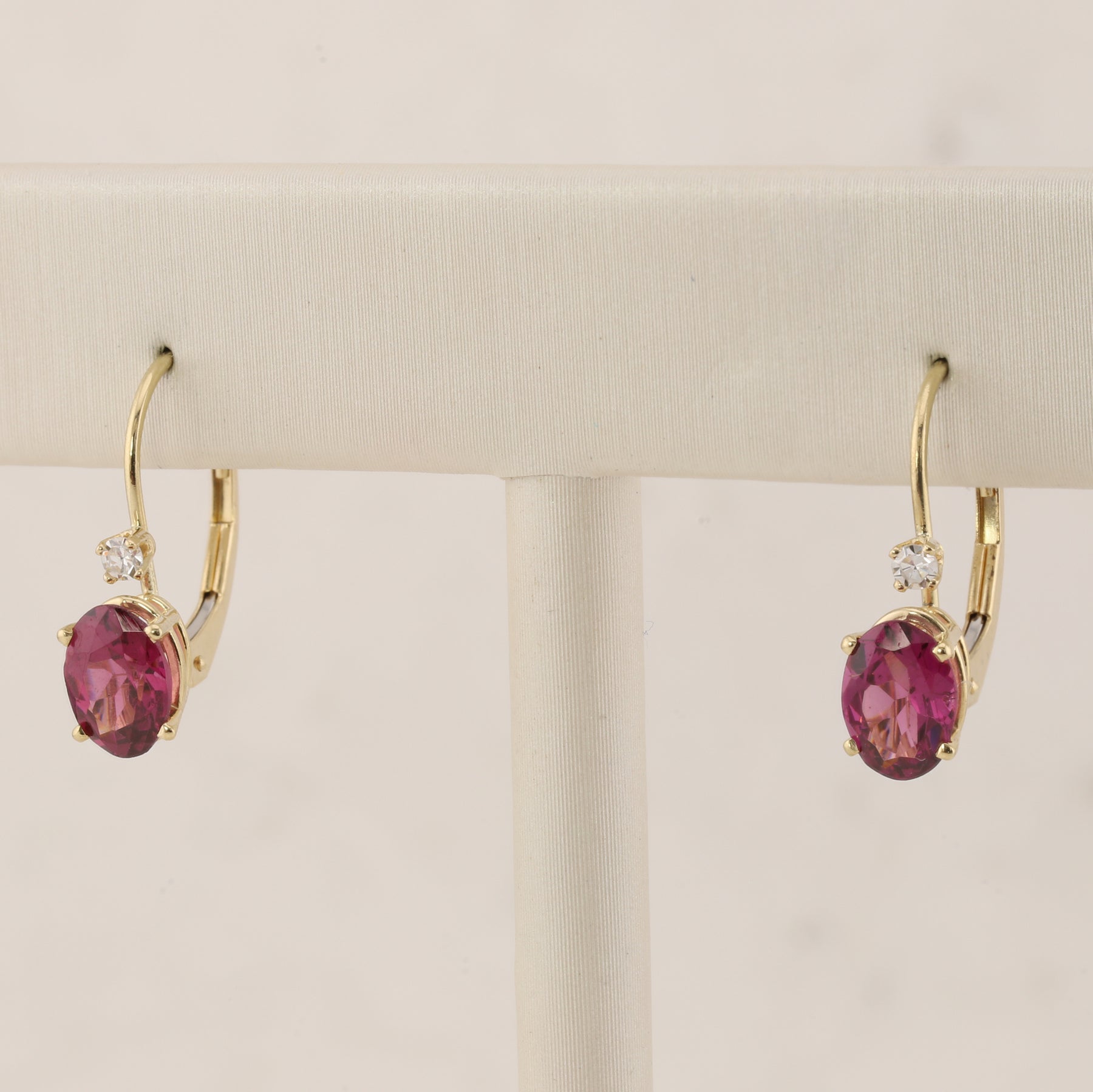 Elegant 14kt yellow gold earrings featuring stunning oval rhodolite garnet stones accented with sparkling diamonds. The secure lever back design ensures comfort and stability for all-day wear. The rich, deep red hue of rhodolite garnet pairs beautifully with warm yellow gold, creating a timeless piece perfect for special occasions or everyday sophistication.