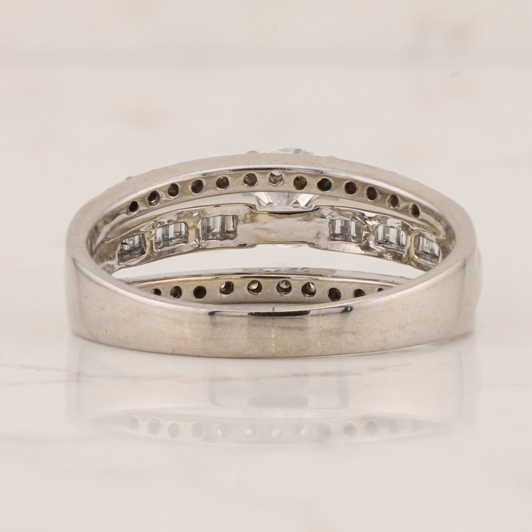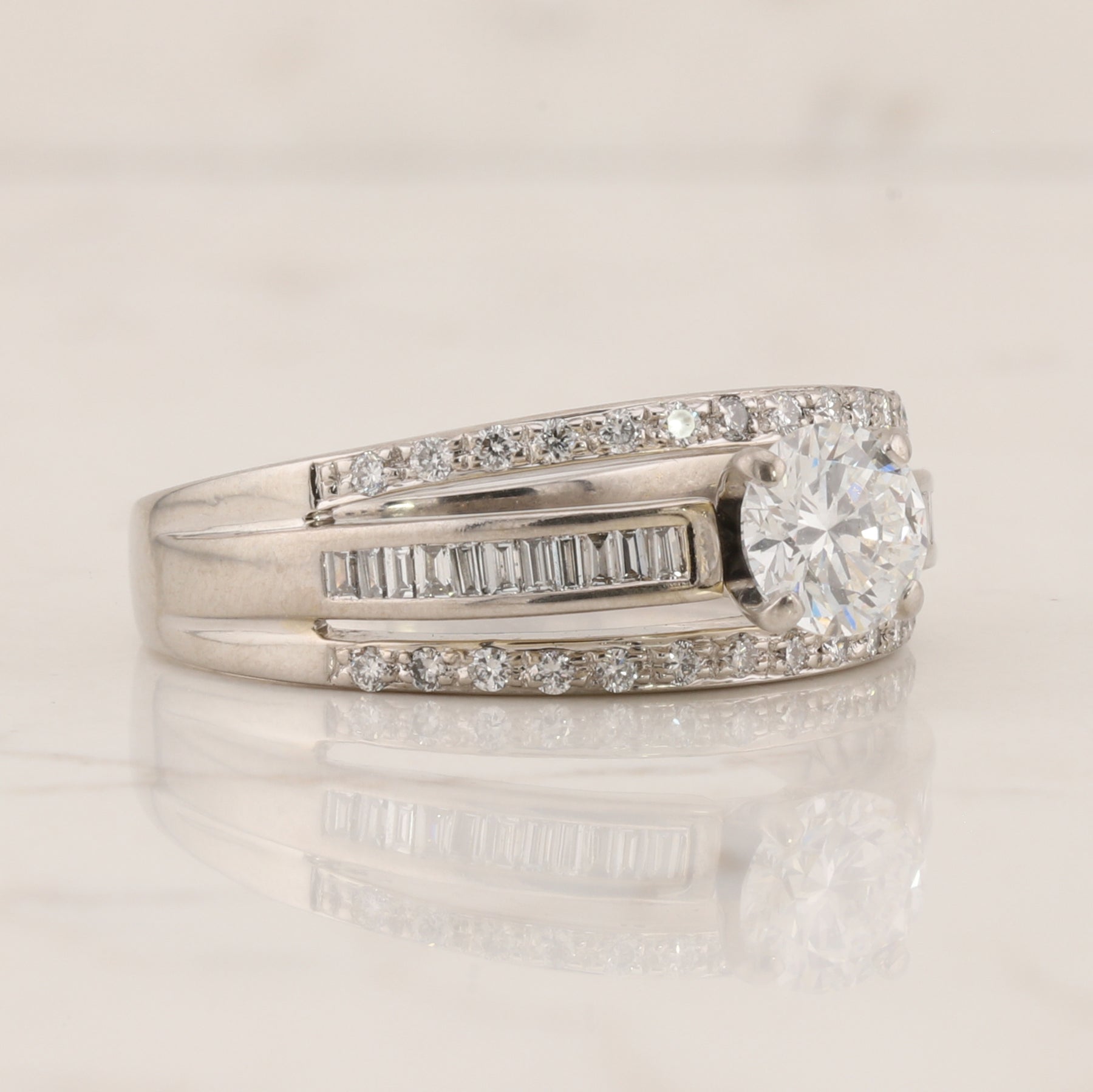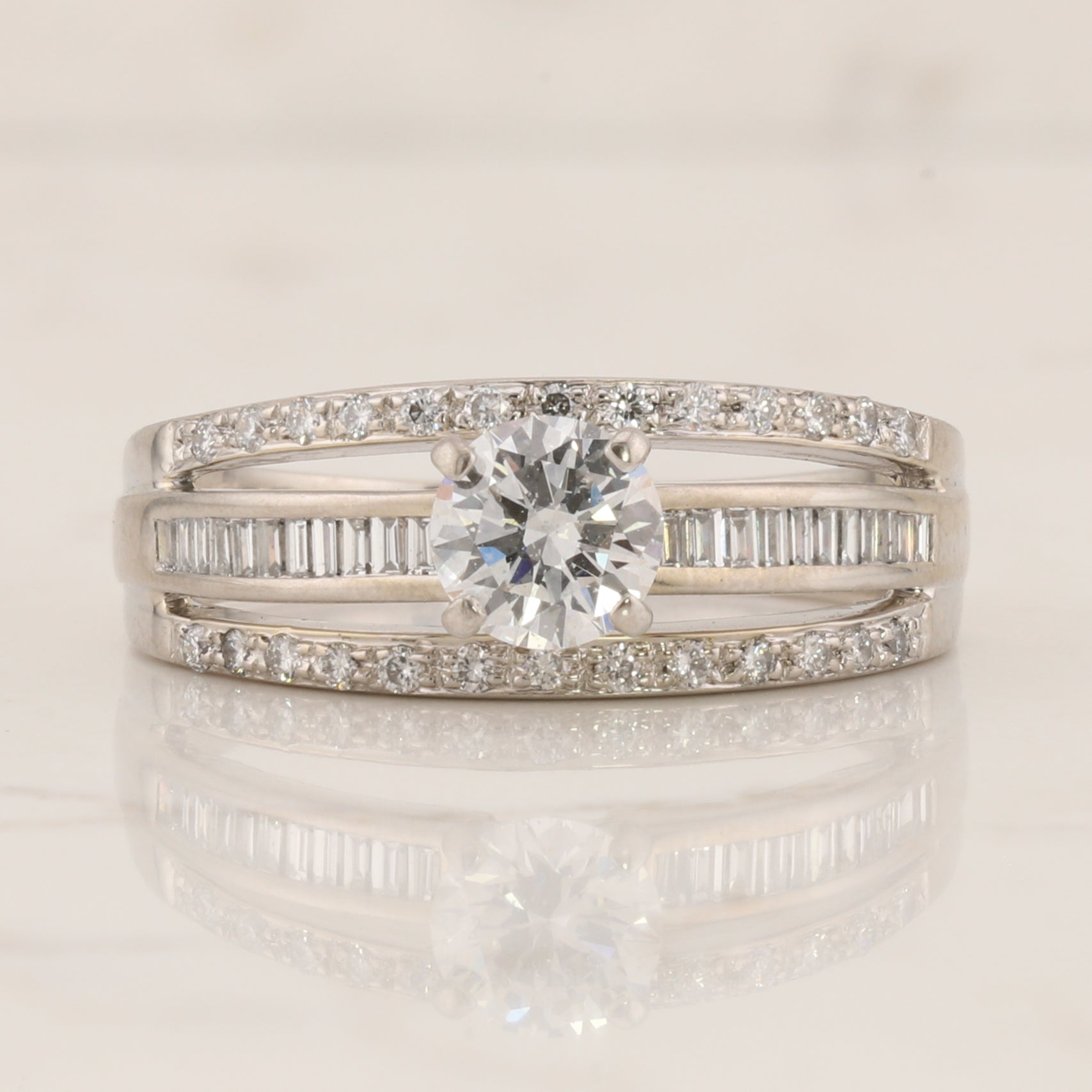 Elegant 18kt white gold engagement ring featuring a stunning 0.65ct round brilliant diamond (VS1, F-G colour) as the centerpiece. Flanked by channel-set baguette diamonds totalling 0.20ctw along the shoulders, with additional round diamonds (0.30ctw) adorning both sides of the band. Currently sized at 9, this piece can be professionally resized in-house to ensure a perfect fit. A timeless design that combines classic sophistication with brilliant sparkle.