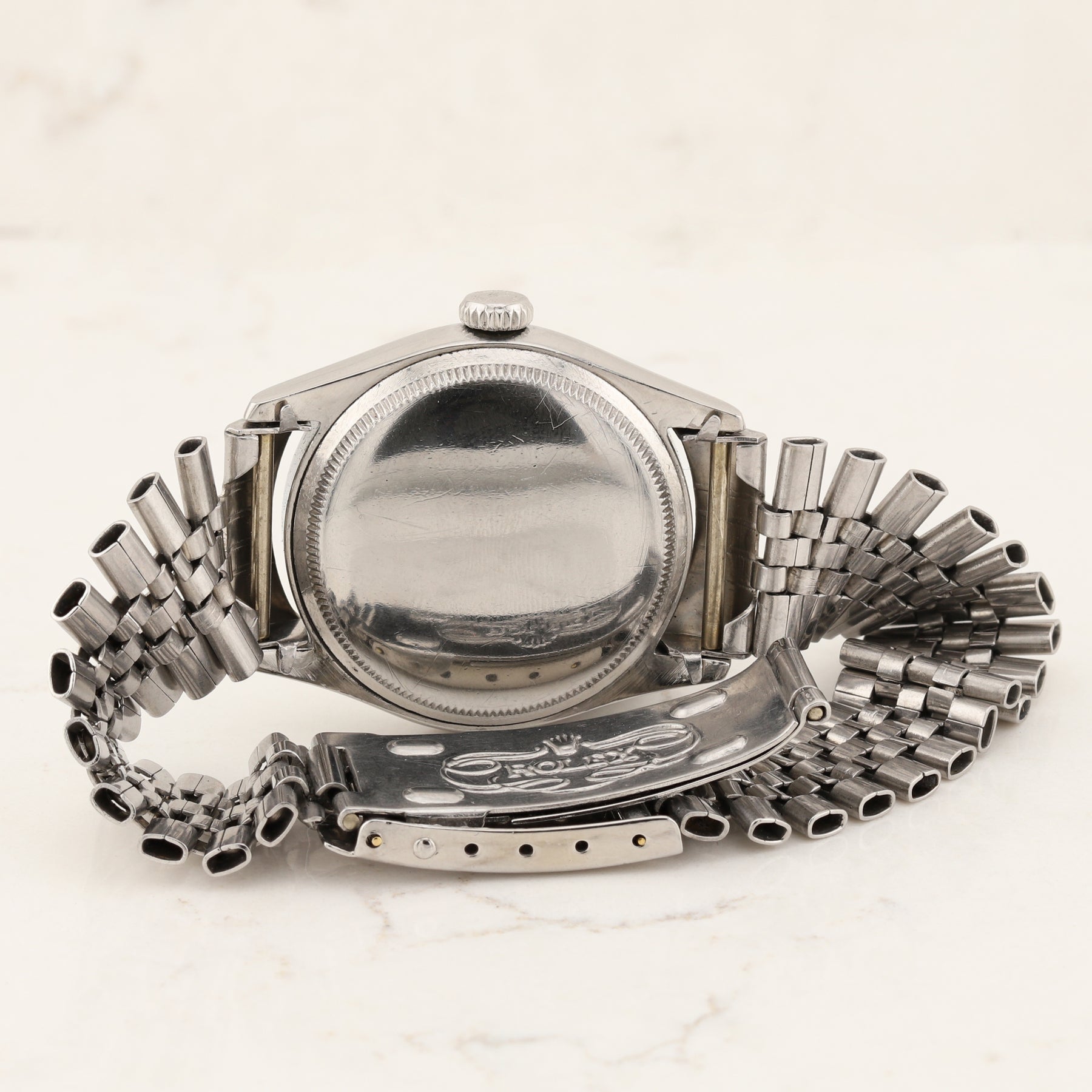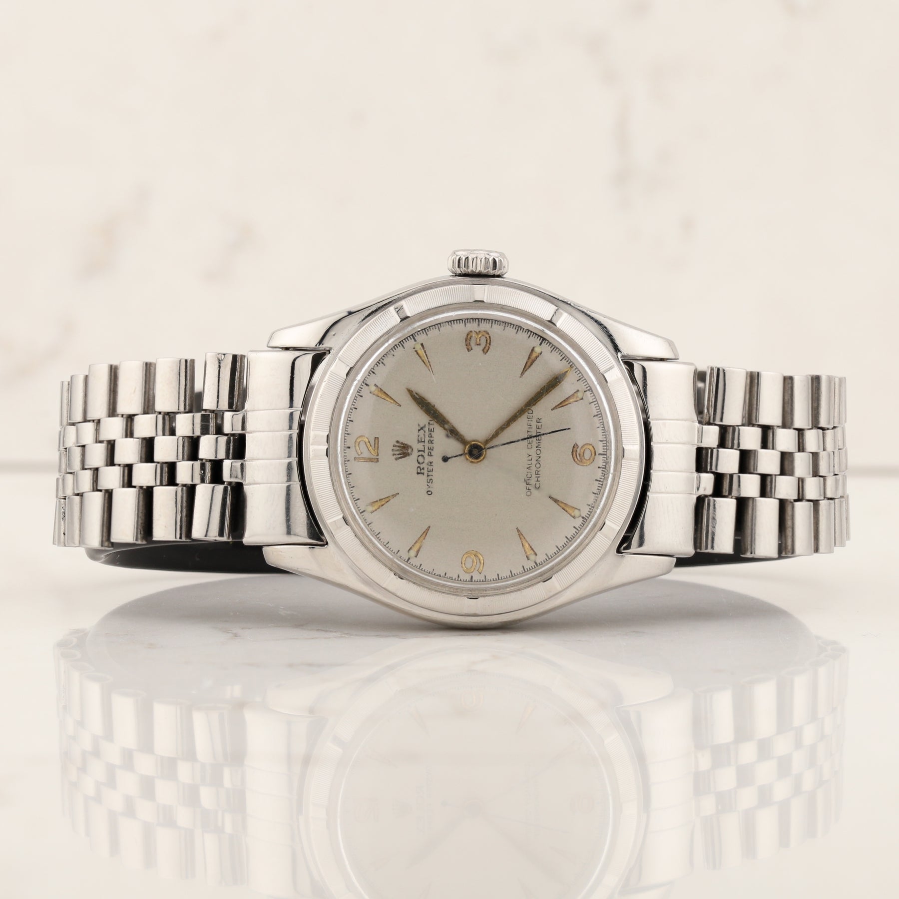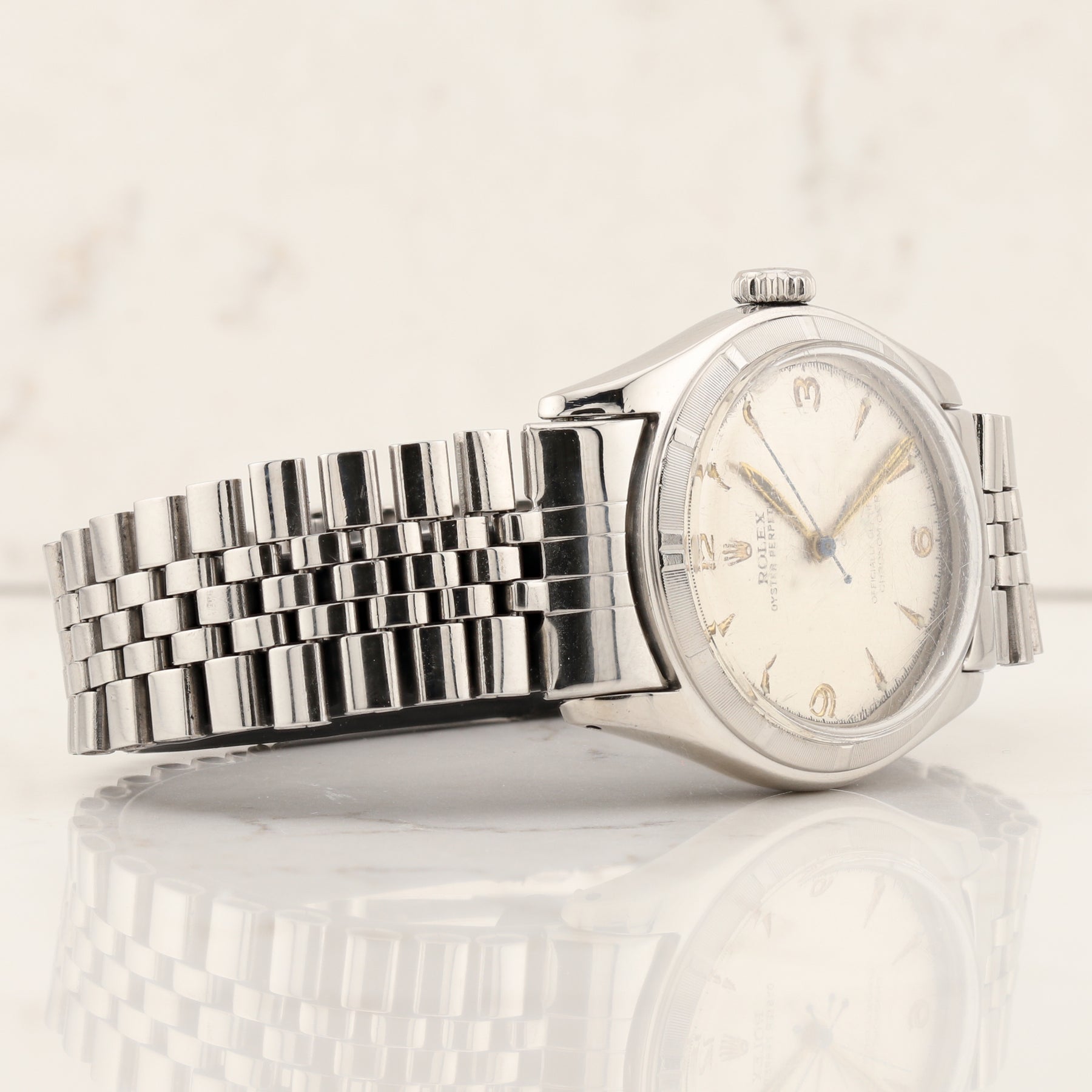 This 1950s Rolex Oyster Perpetual bubble back watch has a bubble caseback and a  Jubilee bracelet.
