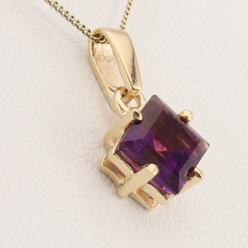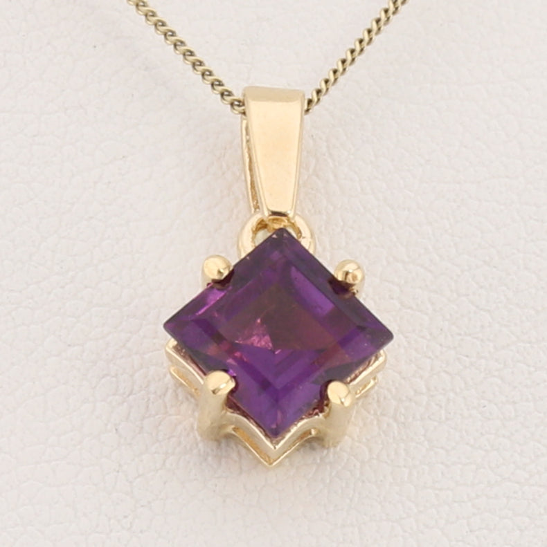 Elevate your collection with this stunning amethyst pendant, featuring a princess-cut stone rotated at a sophisticated 45-degree angle for dynamic visual appeal. Crafted in lustrous 14-karat yellow gold, the geometric setting showcases the rich purple hues of the amethyst while the angled presentation creates a modern, eye-catching design. Perfect for everyday elegance or special occasions, this piece combines timeless craftsmanship with contemporary style. (chain not included)