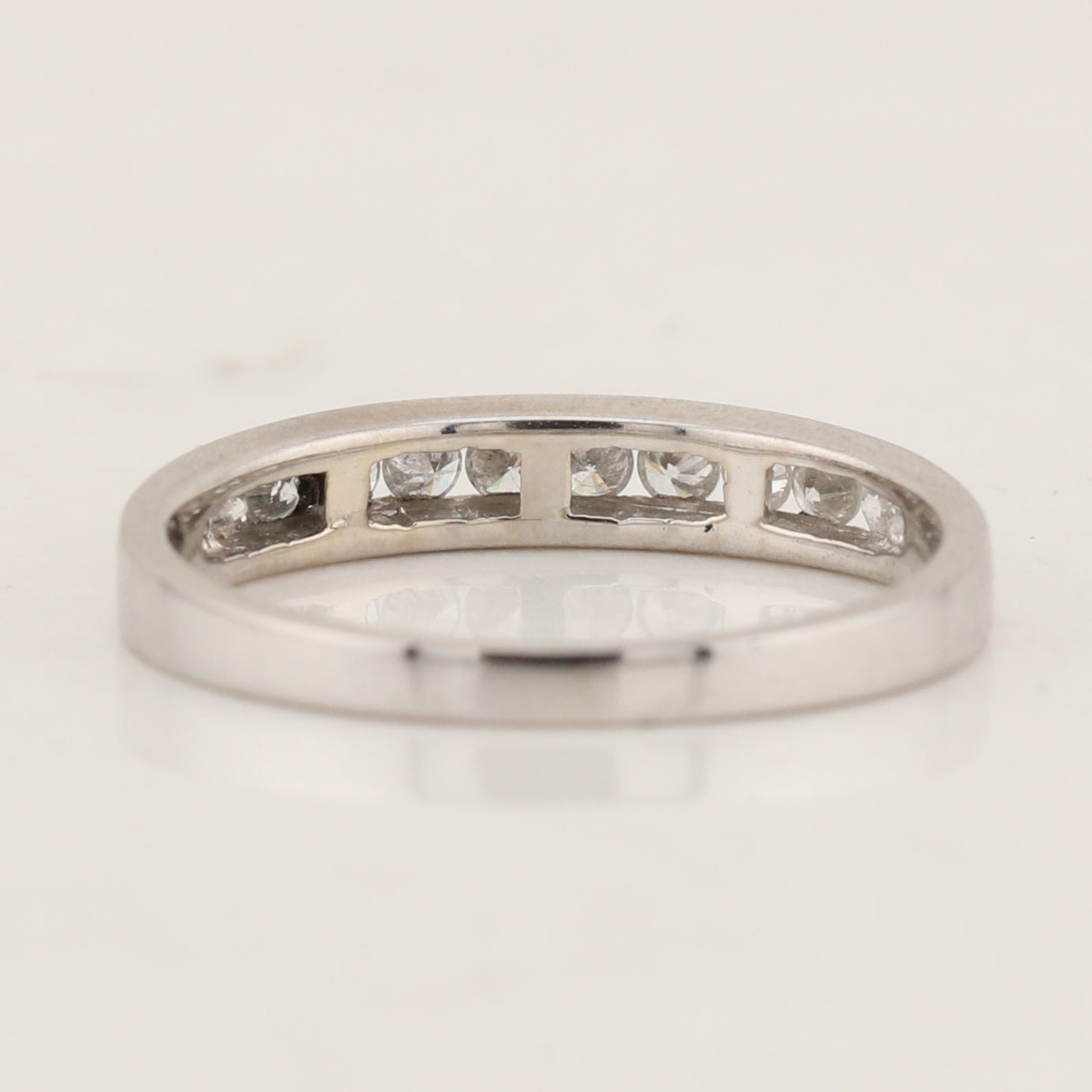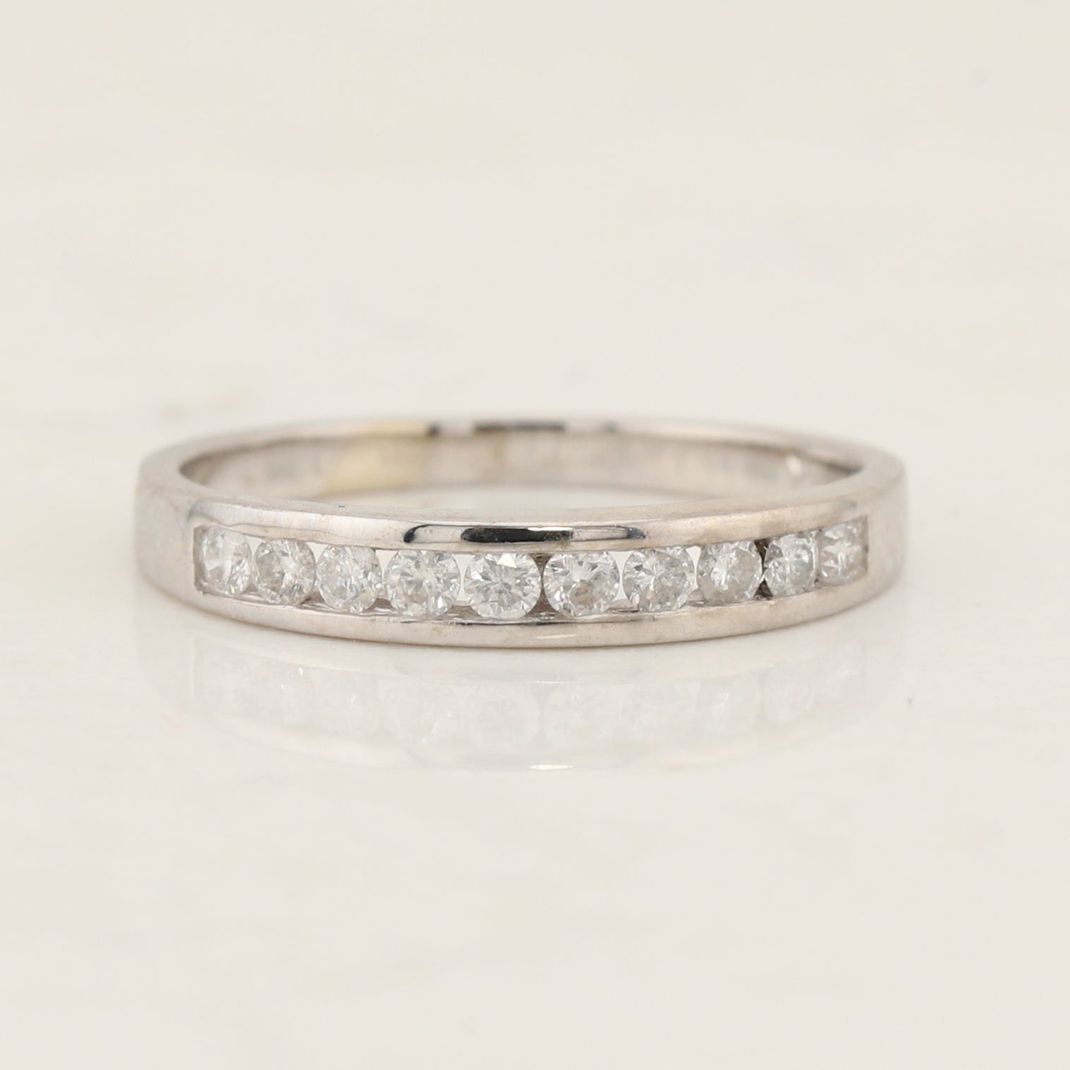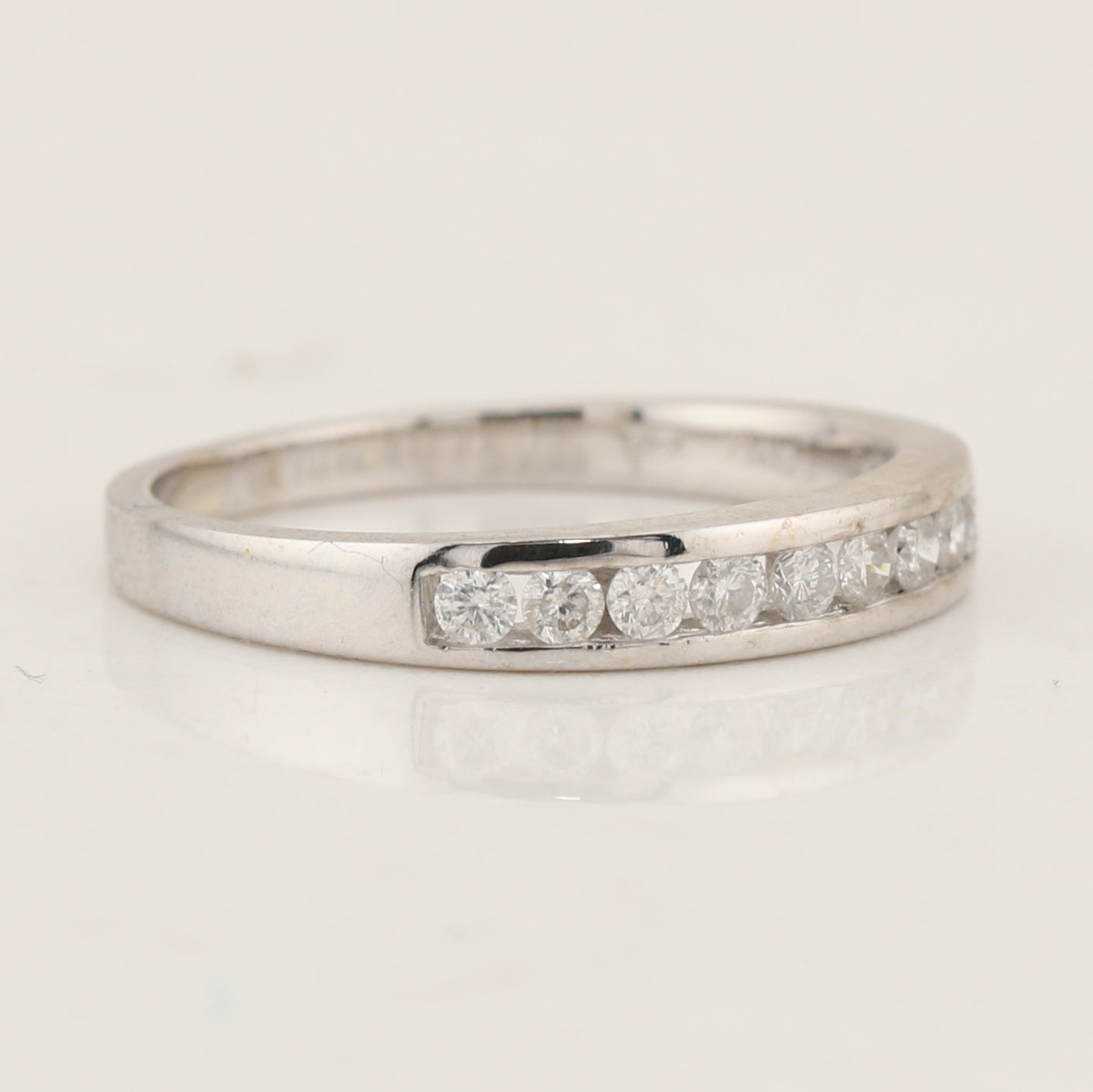 14kt white gold diamond channel band, the ring is a finger size 5
