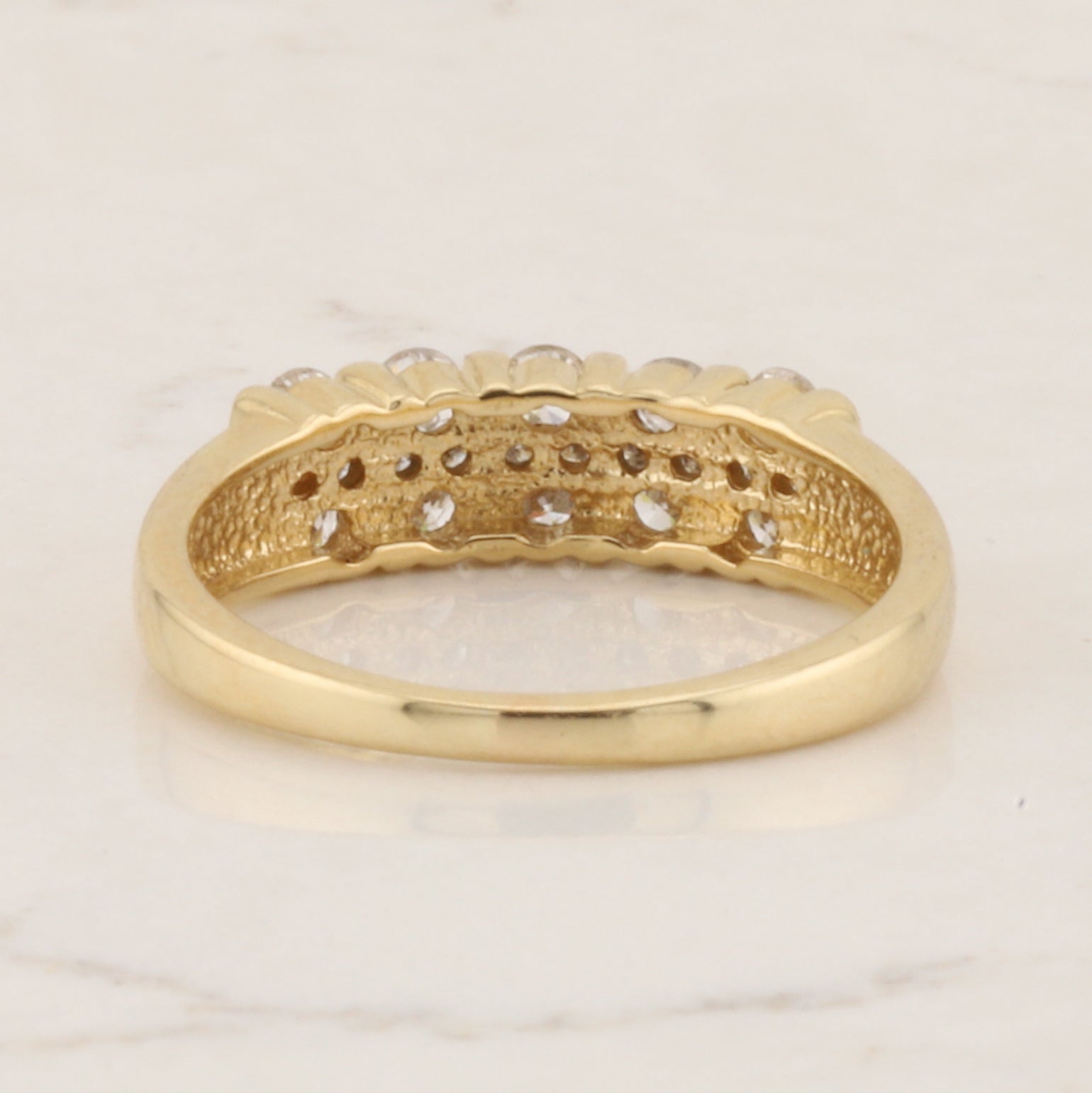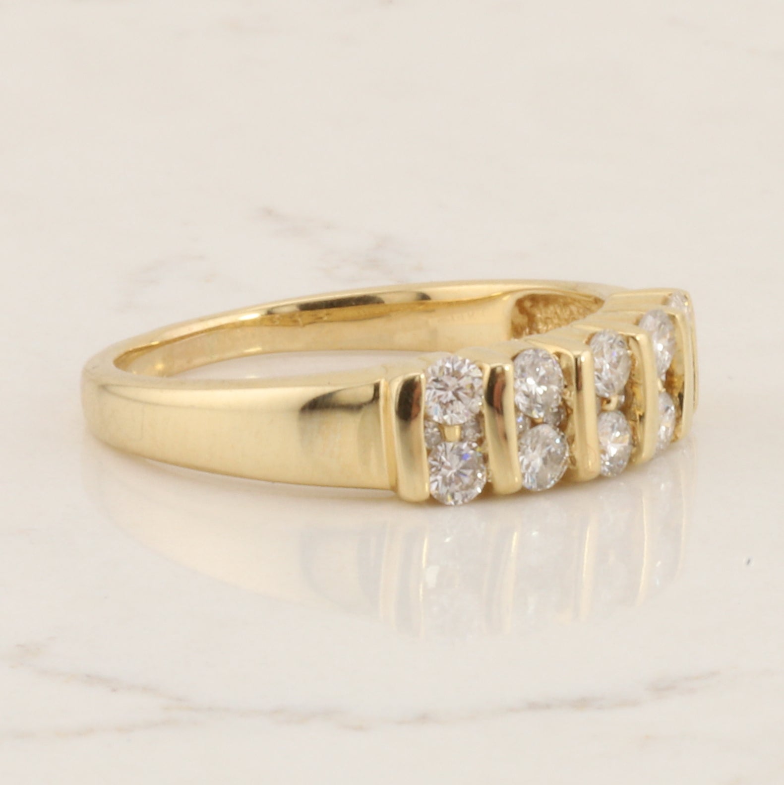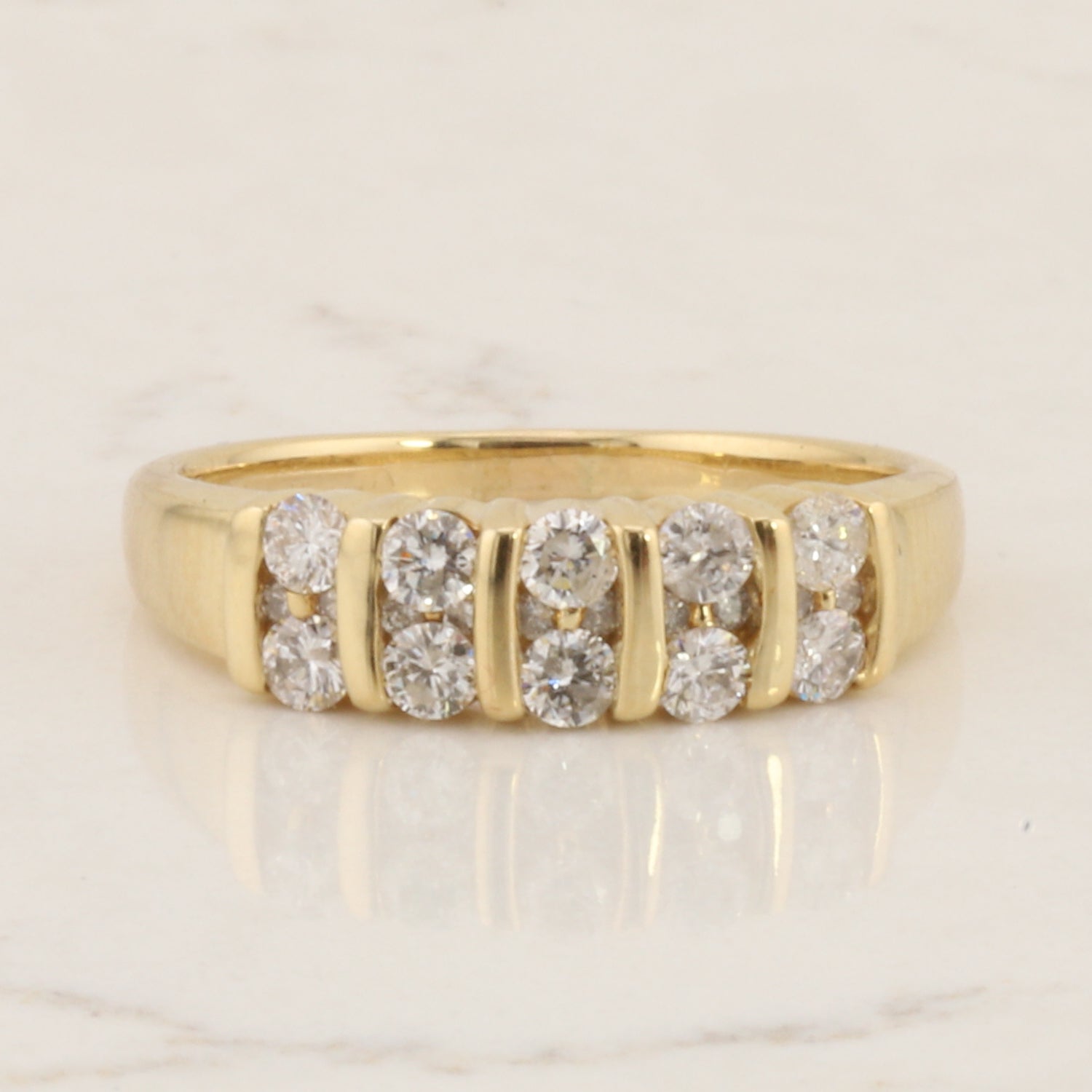 This channel-set diamond ring features a 0.25 carat total diamond weight in 14kt yellow gold. The ring is a size 6.