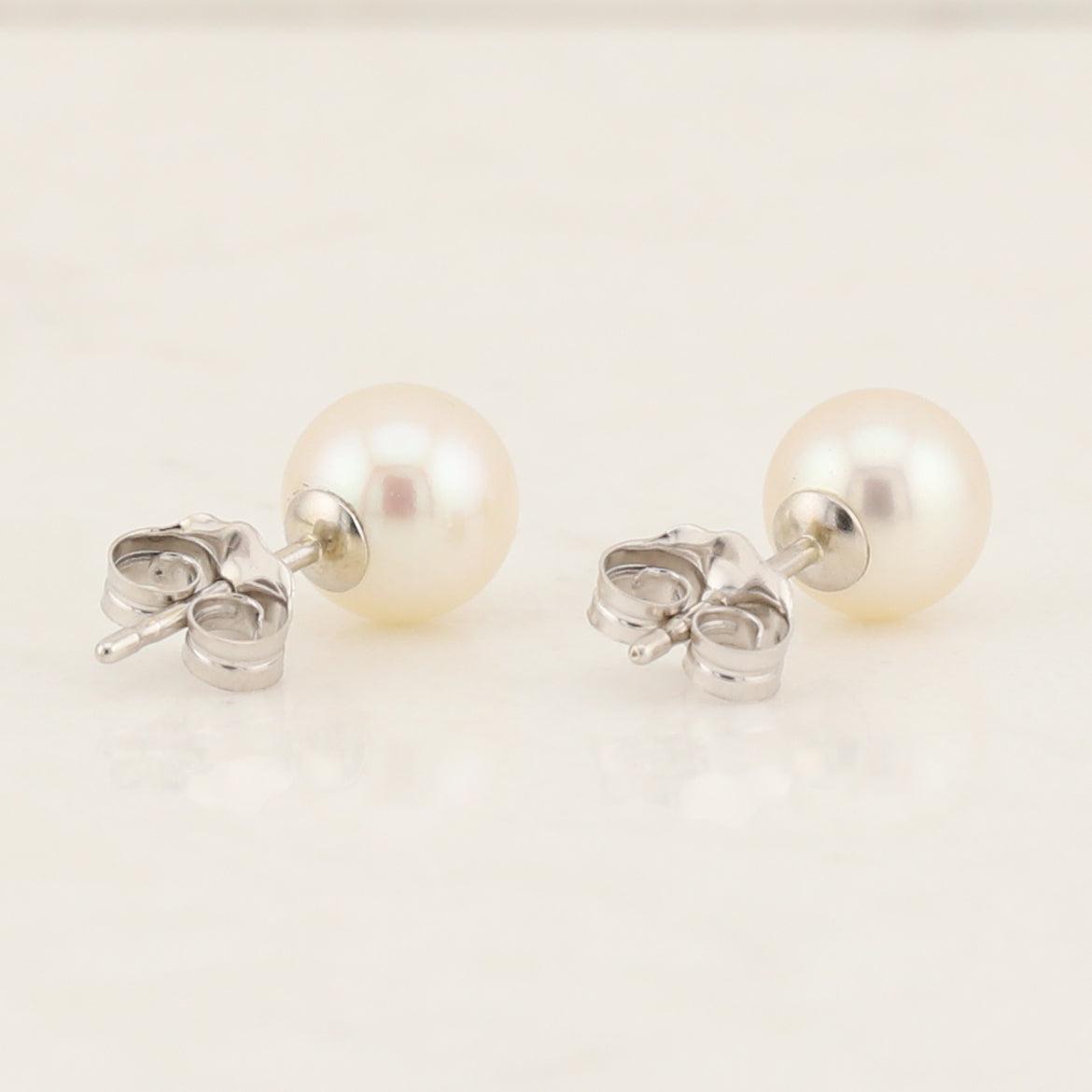 These 18kt white gold pearl stud earrings are made by Birks and measure 6.5 mm roound.