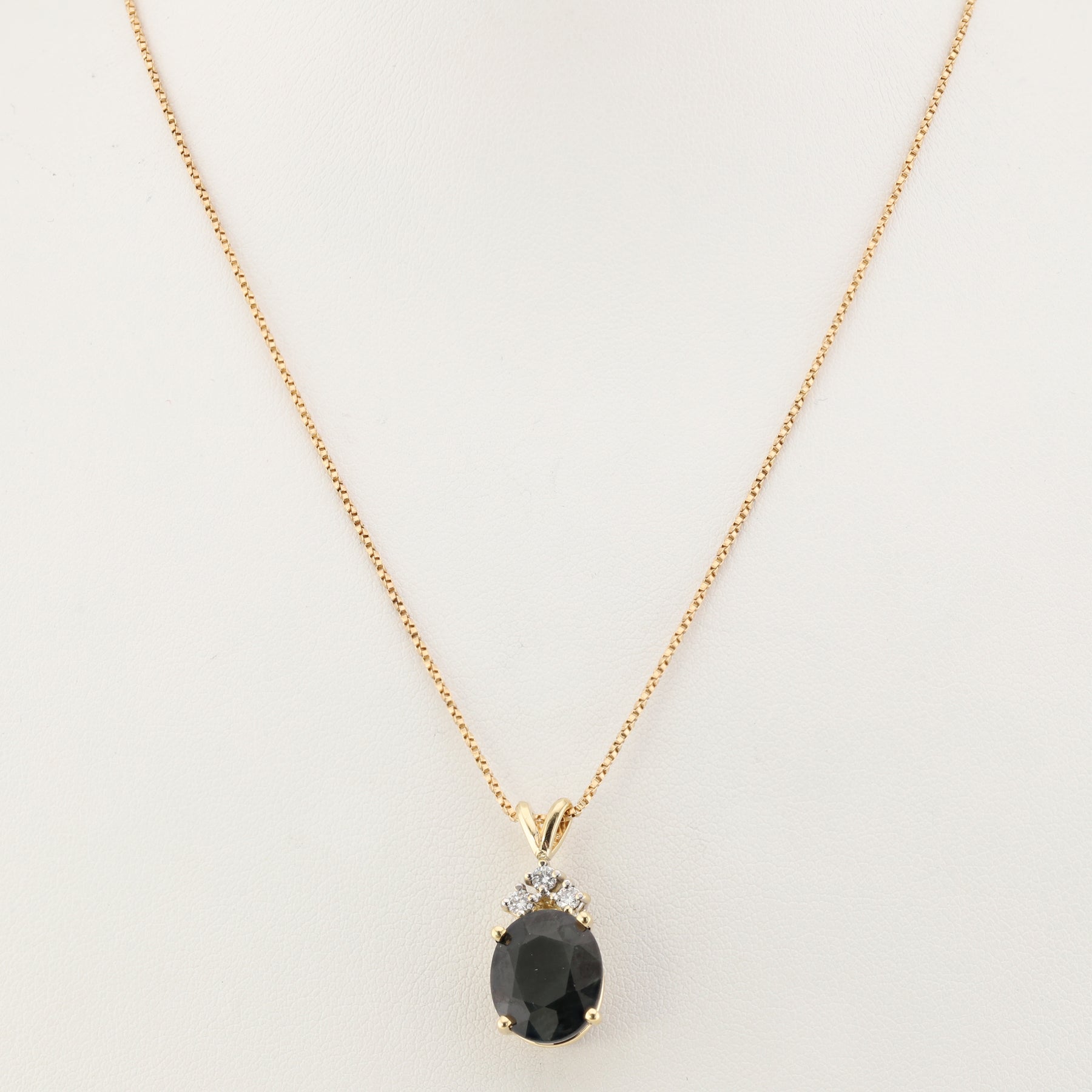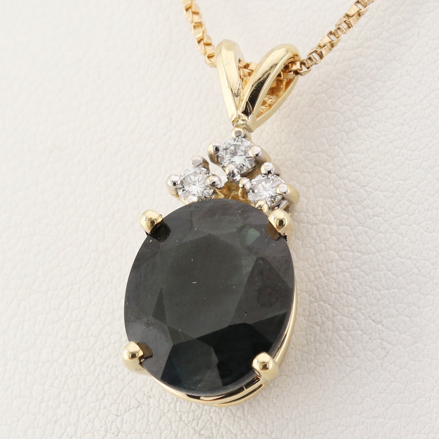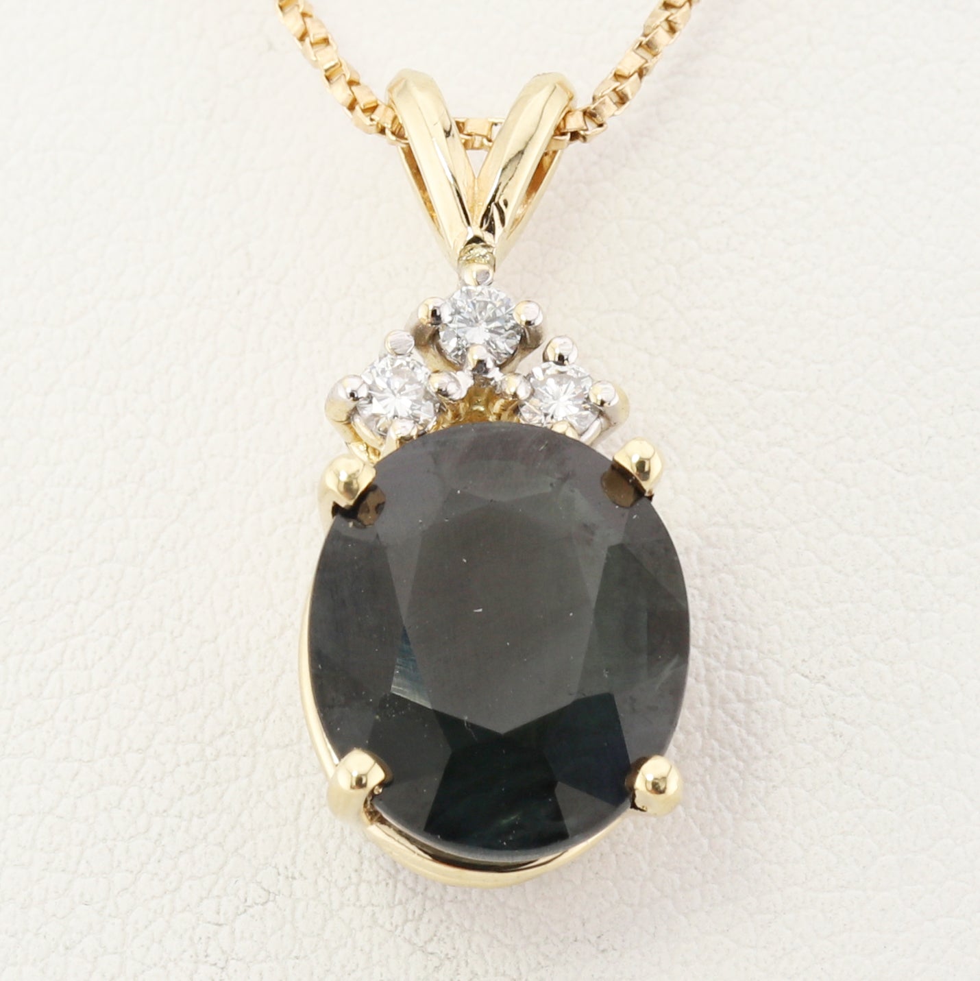 This pendant features a dark blue sapphire set in 10kt yellow gold, accented with diamonds with a 20" chain.
