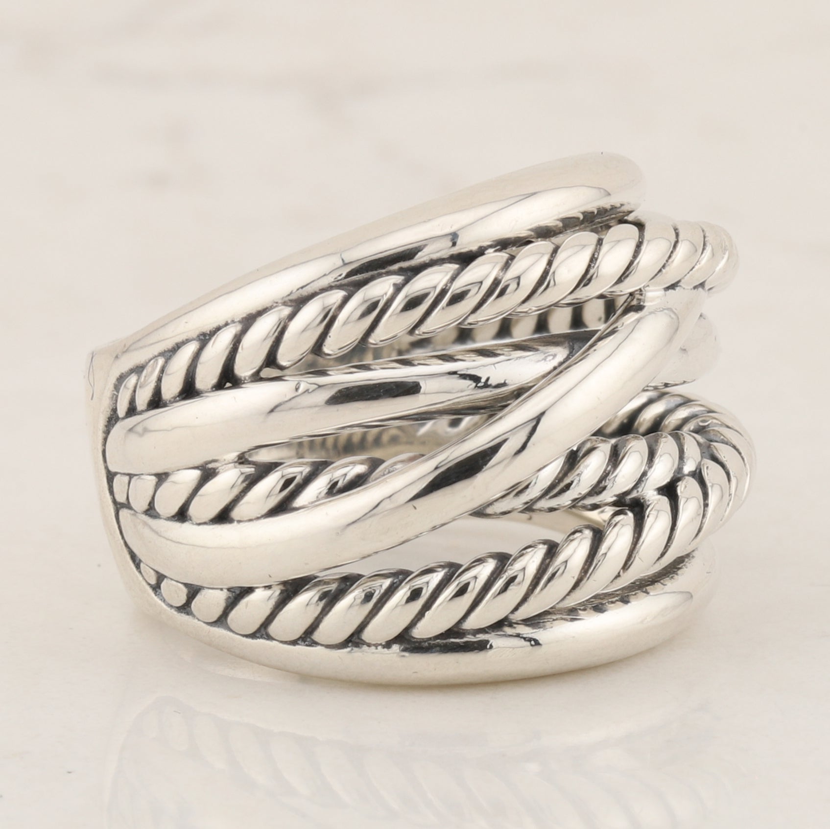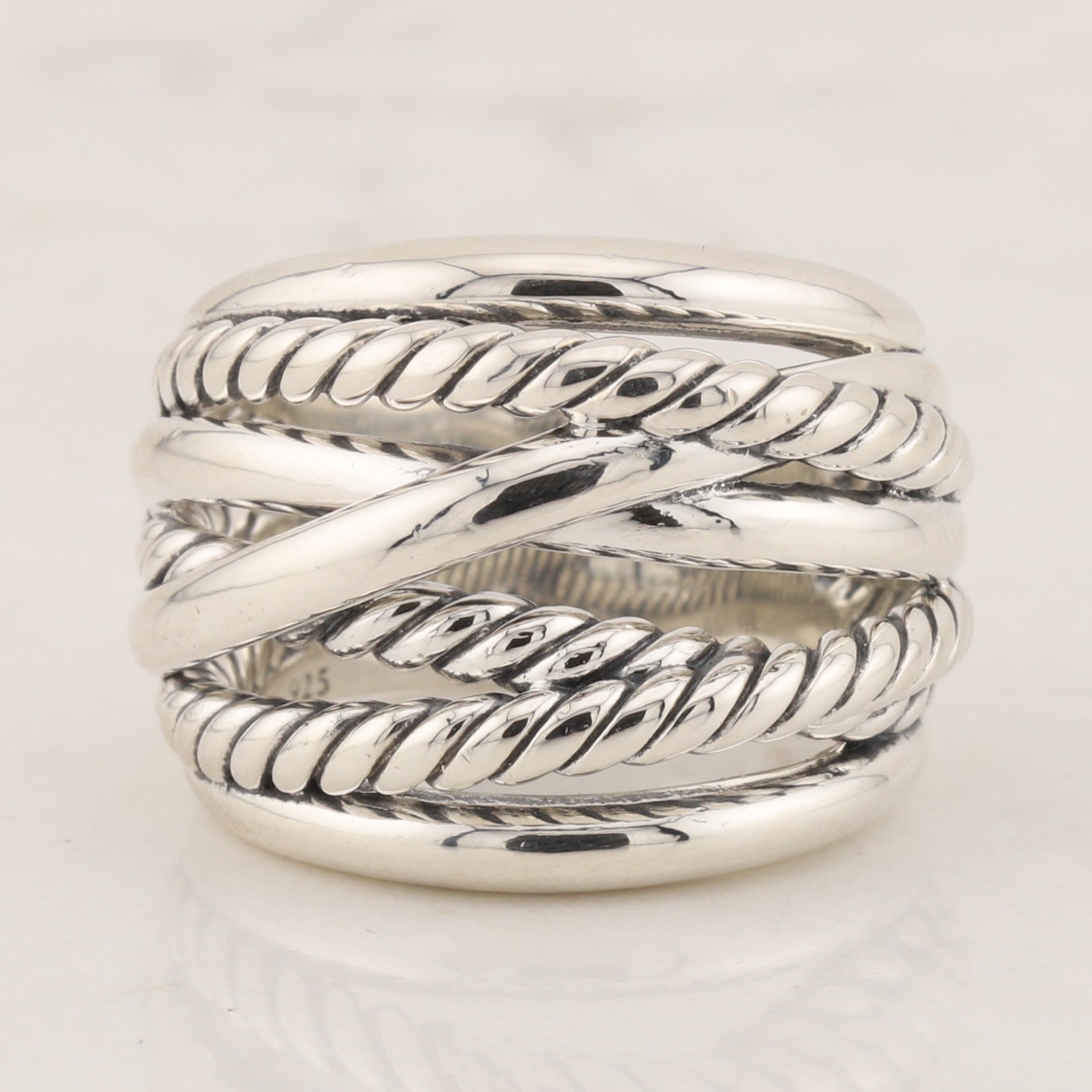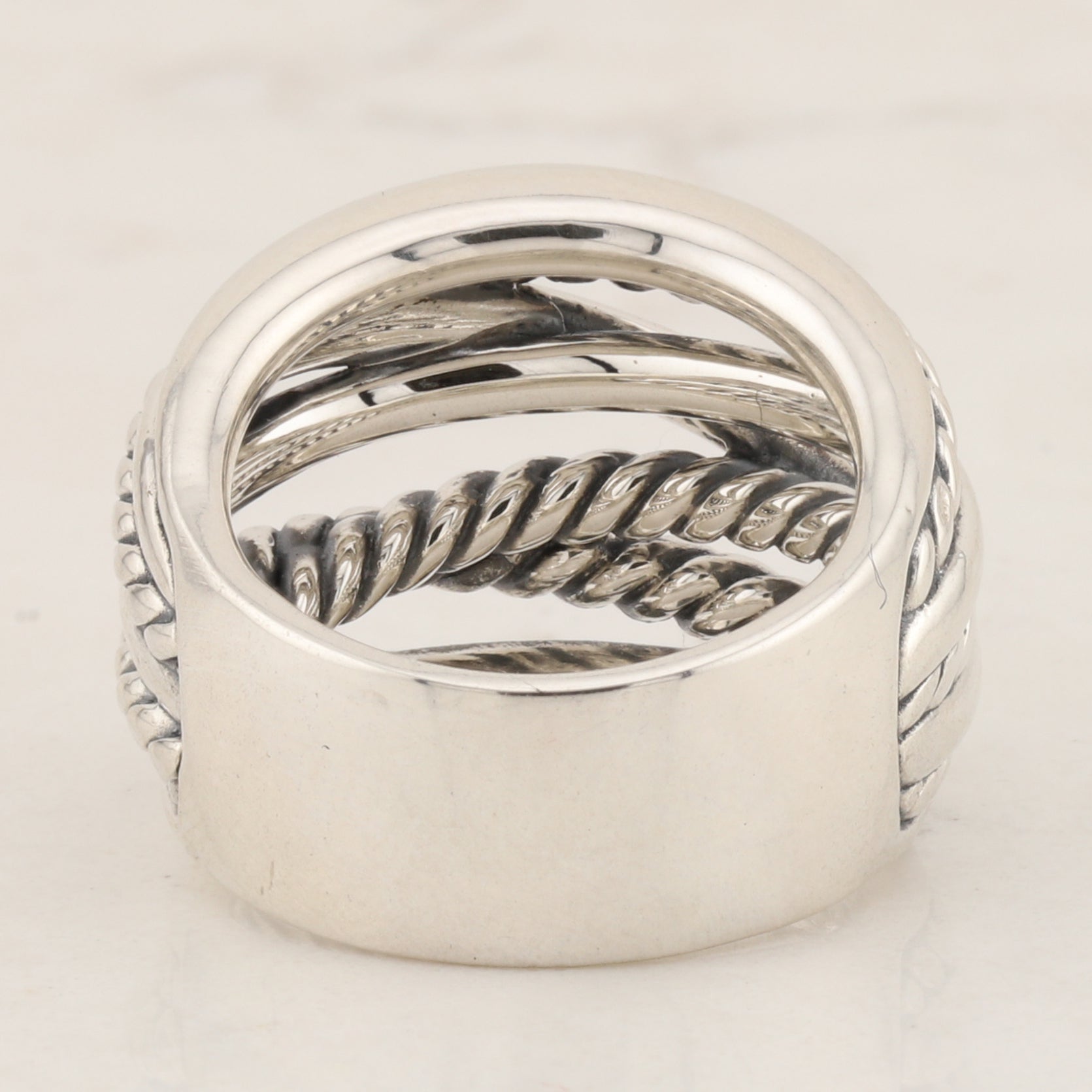 A striking sterling silver crossover ring that makes a bold statement. This David Yurman design features an interlocking band construction that creates visual depth and movement. The heavy-gauge sterling silver ensures durability and substantial feel, while the crossover style offers a modern, architectural aesthetic. Perfect for those seeking a distinctive piece that combines contemporary design with timeless craftsmanship. An excellent choice for everyday wear or special occasions.