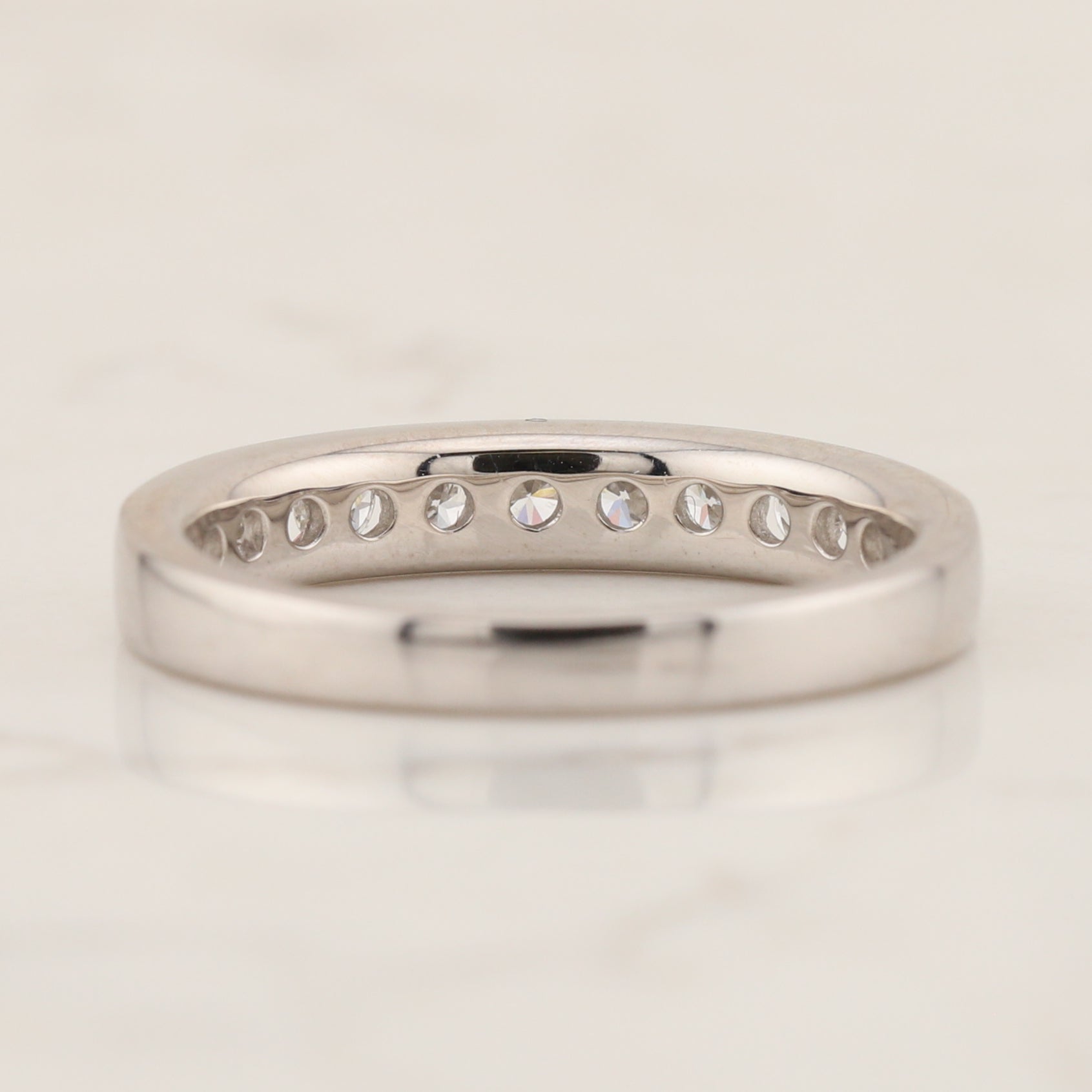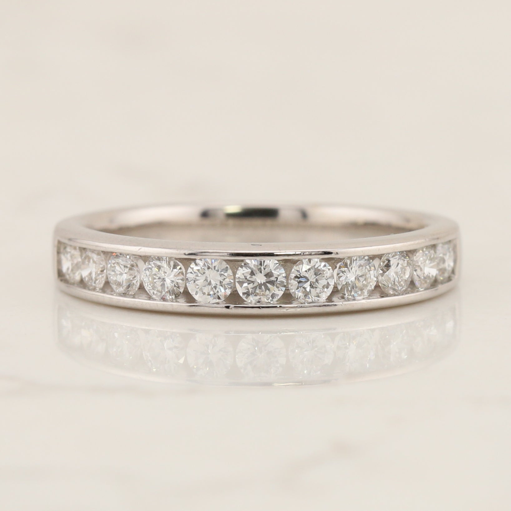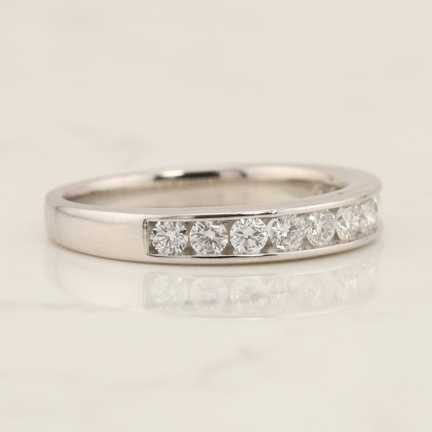 14kt white gold diamond, channel set band set with 11 diamonds. The ring is a finger size 6.5, the total diamond weight is 0.70cts tdw