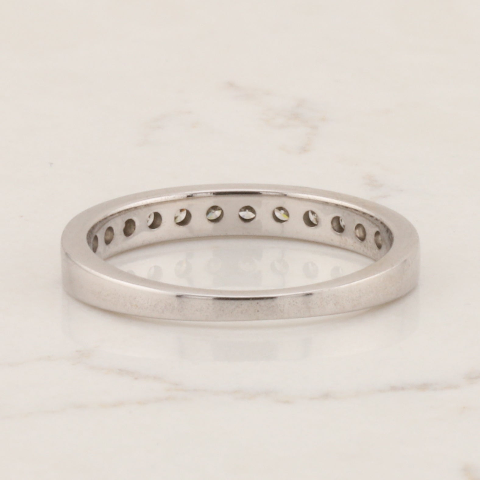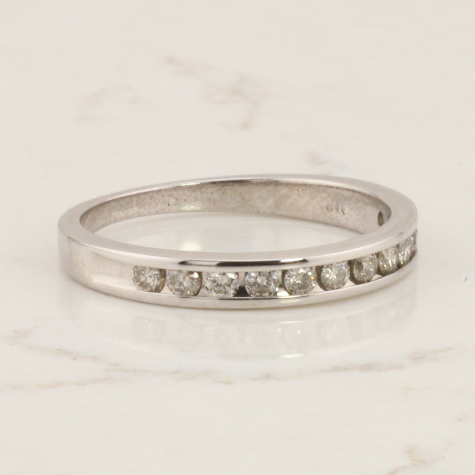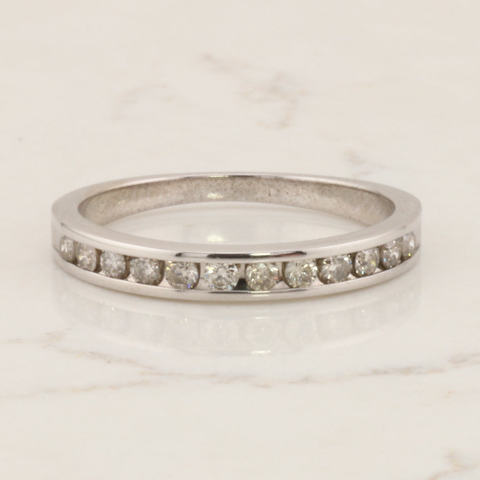 This 10kt white gold anniversary band features channel-set diamonds. The ring is a size 5.5.