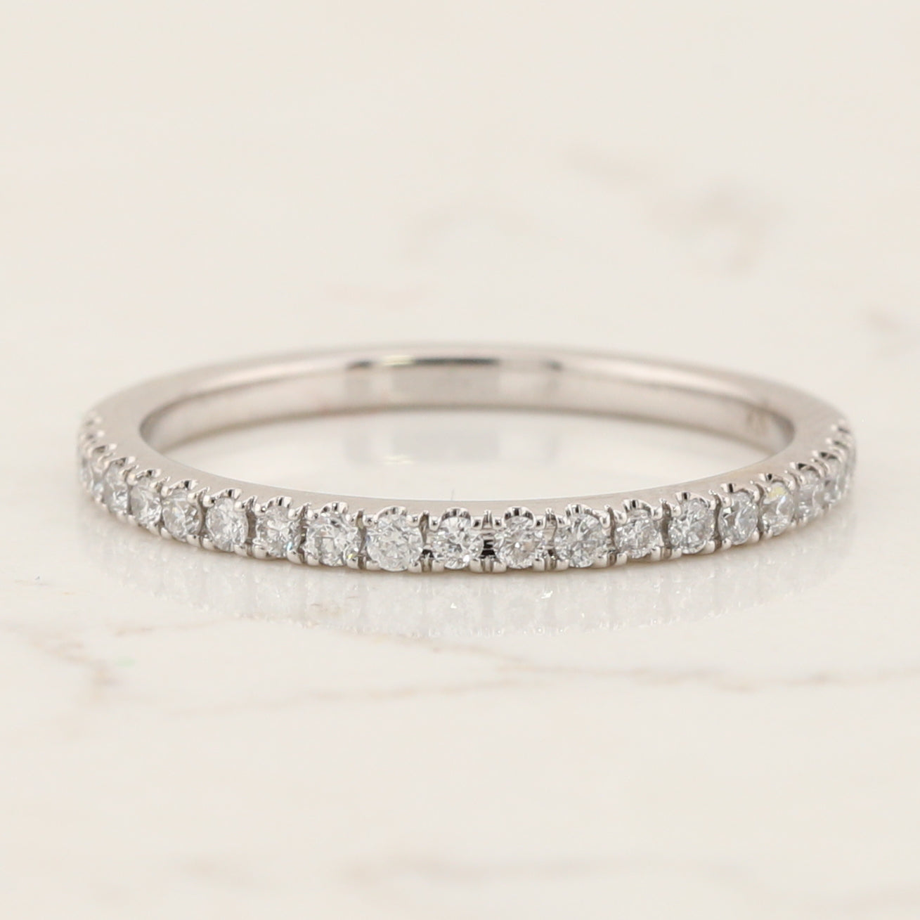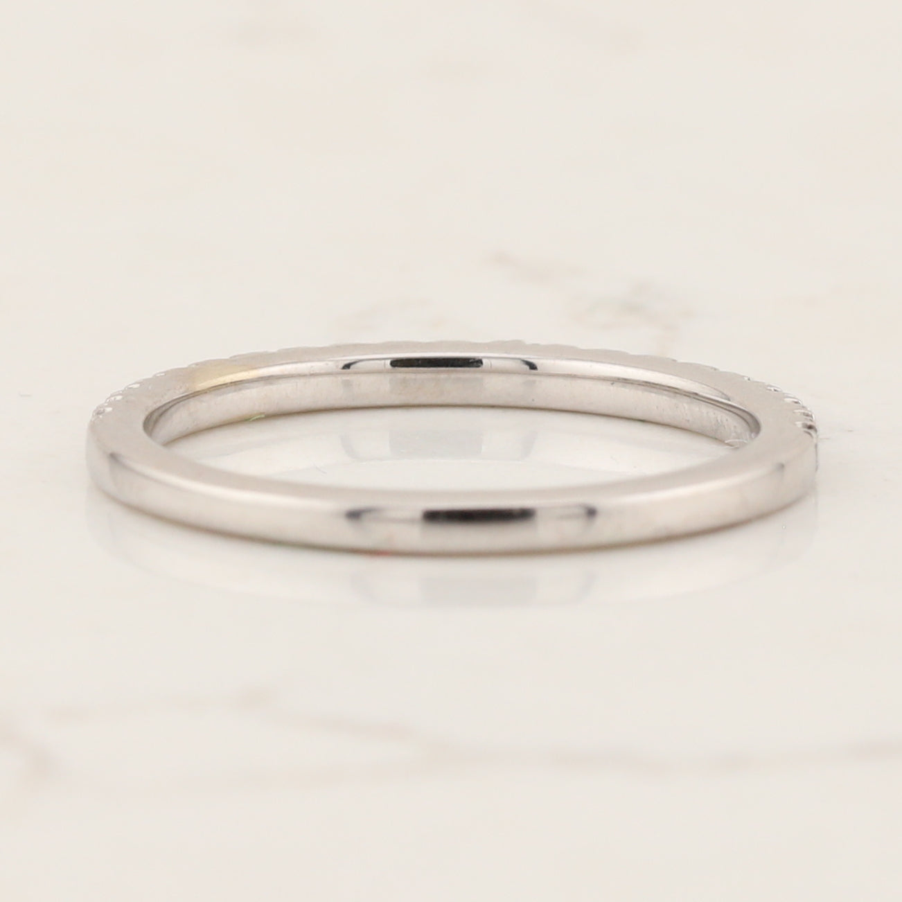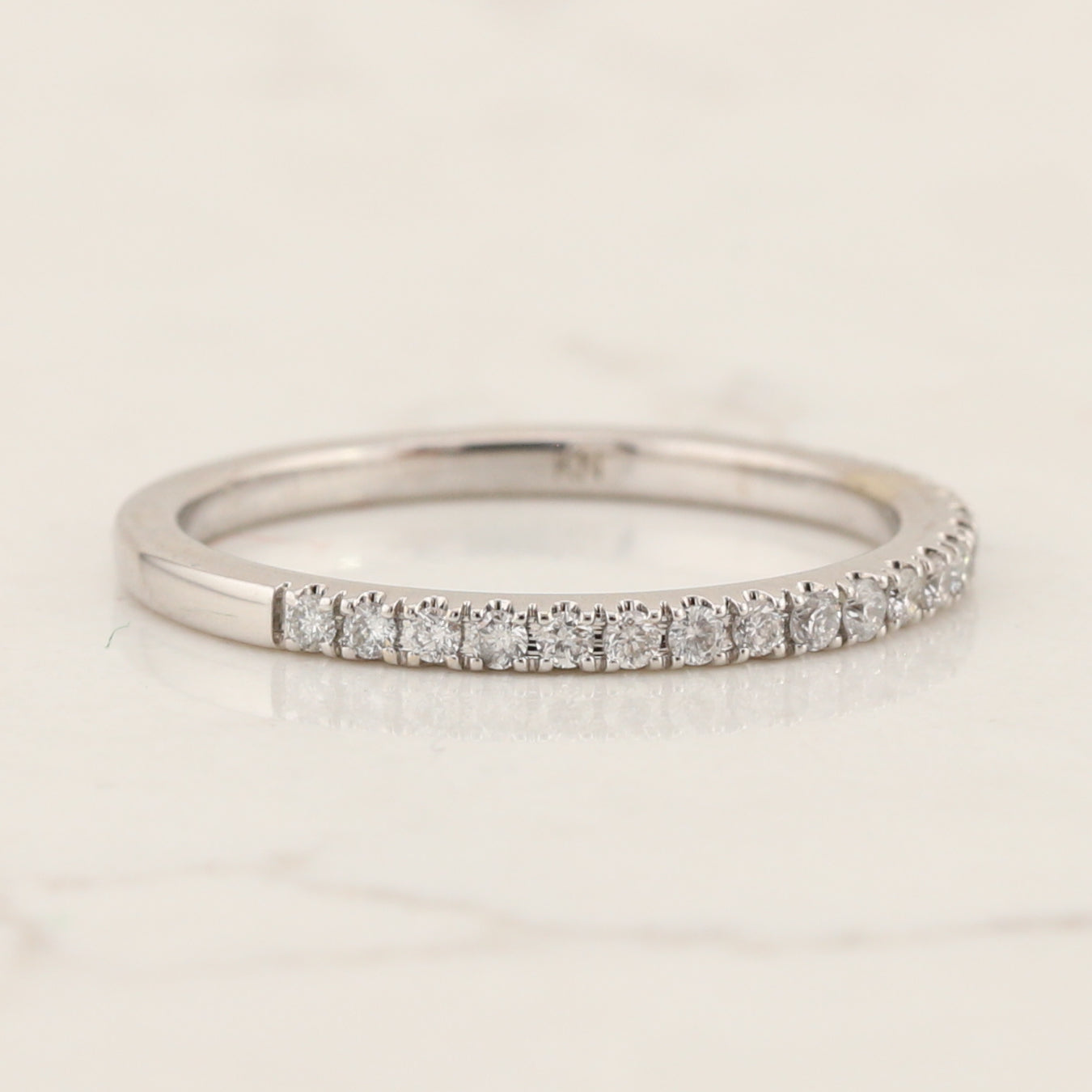 This 14kt white gold anniversary band features diamonds set across the ring.  The ring is a size 6.75.