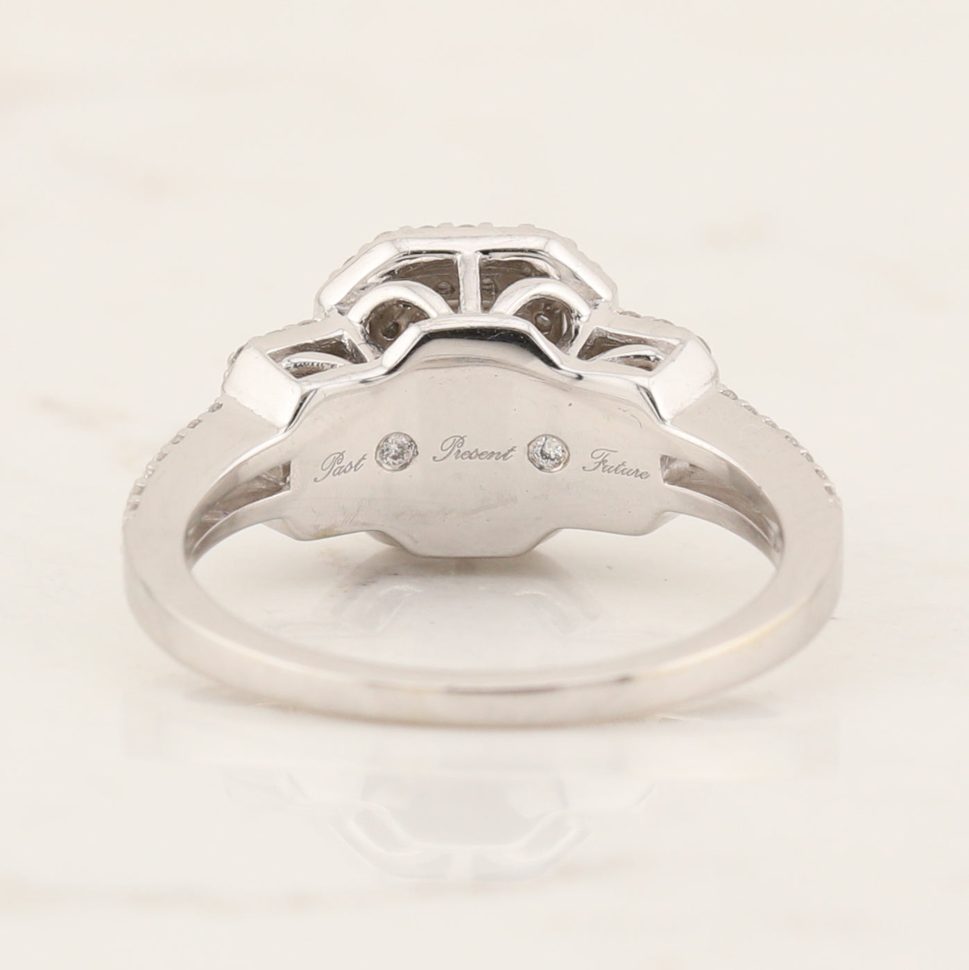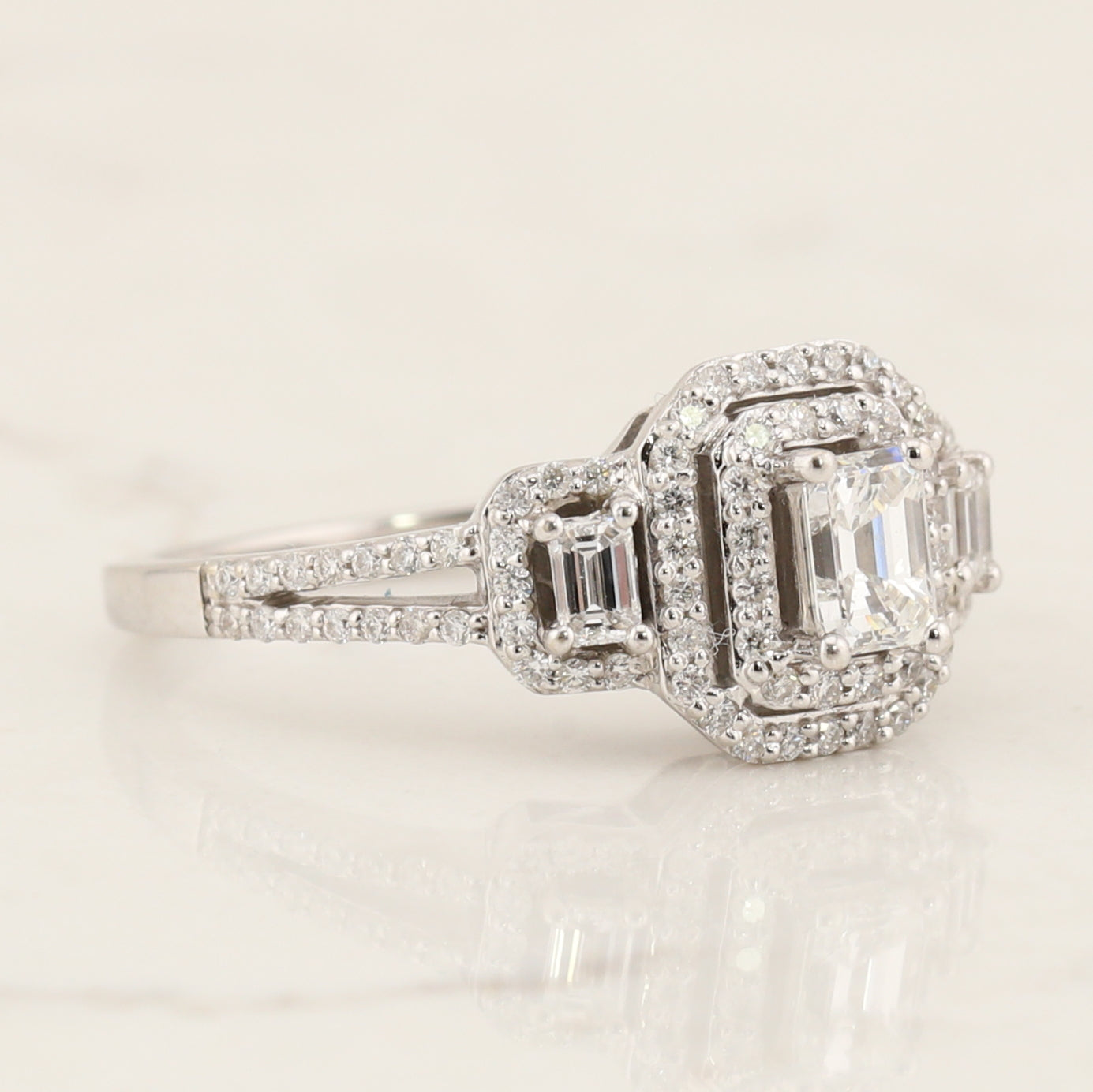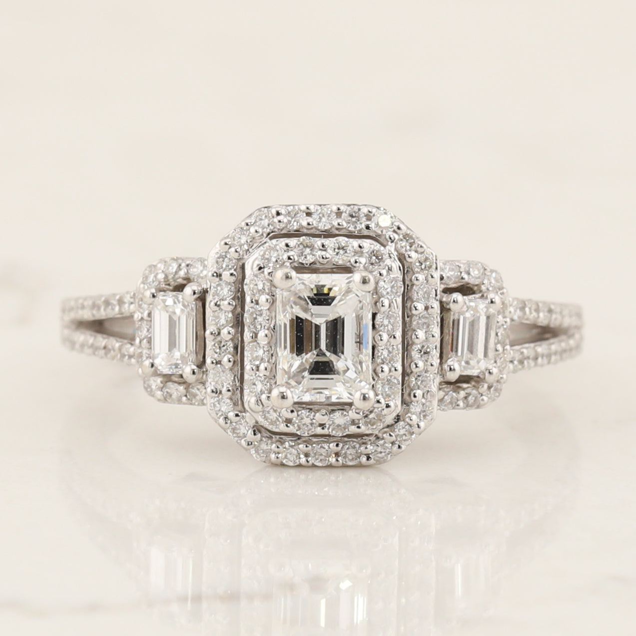 Emerald cut diamond engagement ring, the center stone is a 0.45ct, VVS1, G colour. The ring is a finger size 7 and has a total of approximately 1.75cts total diamond weight.