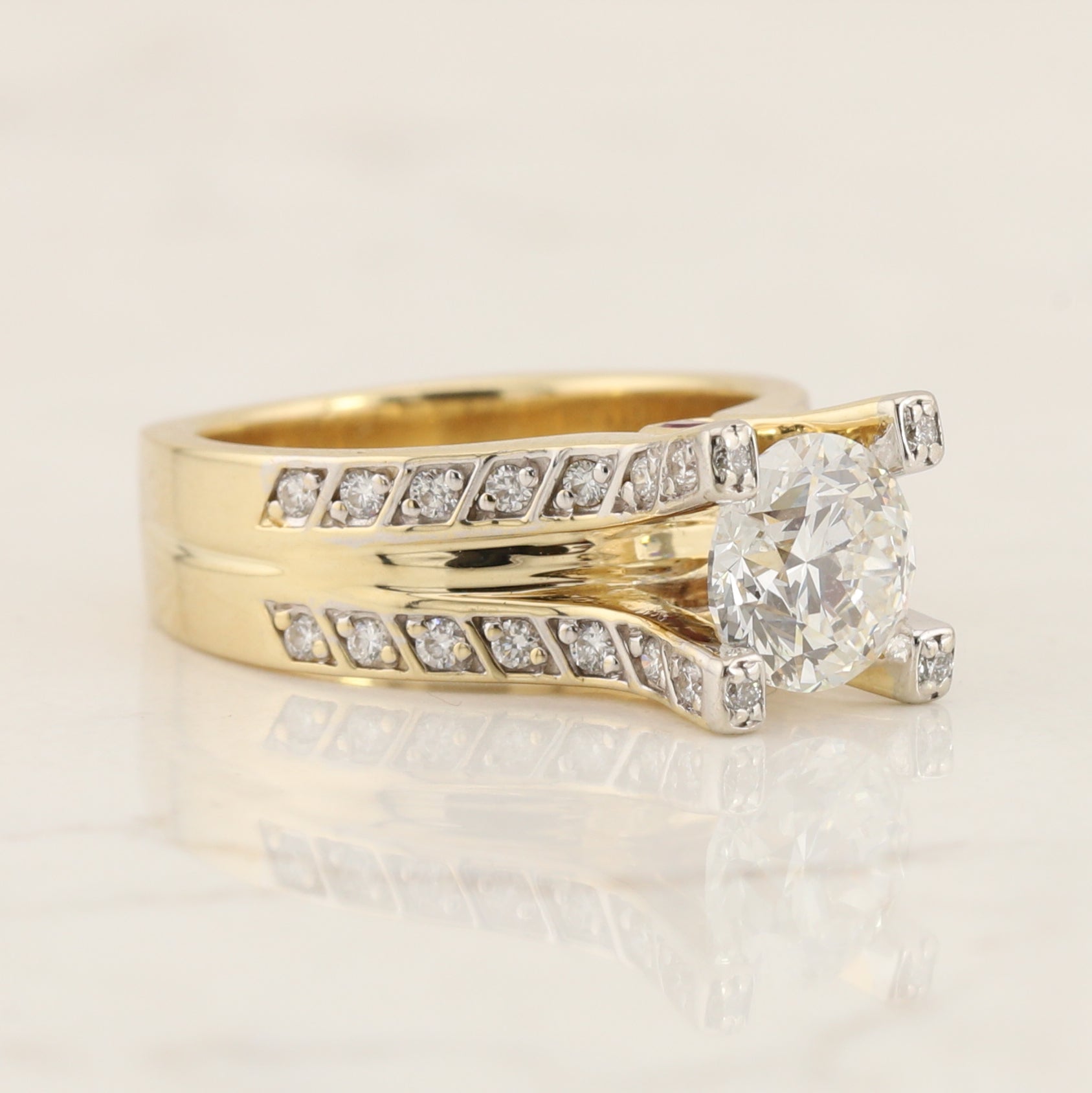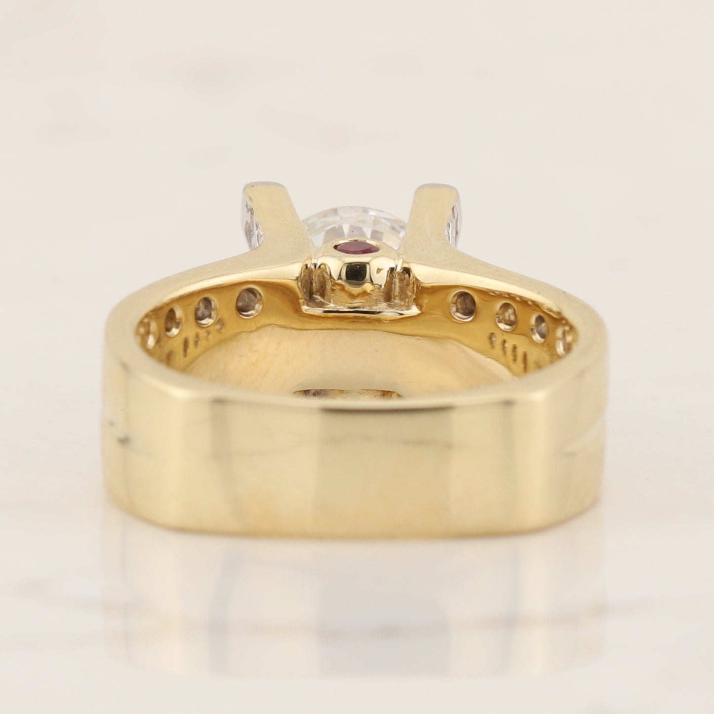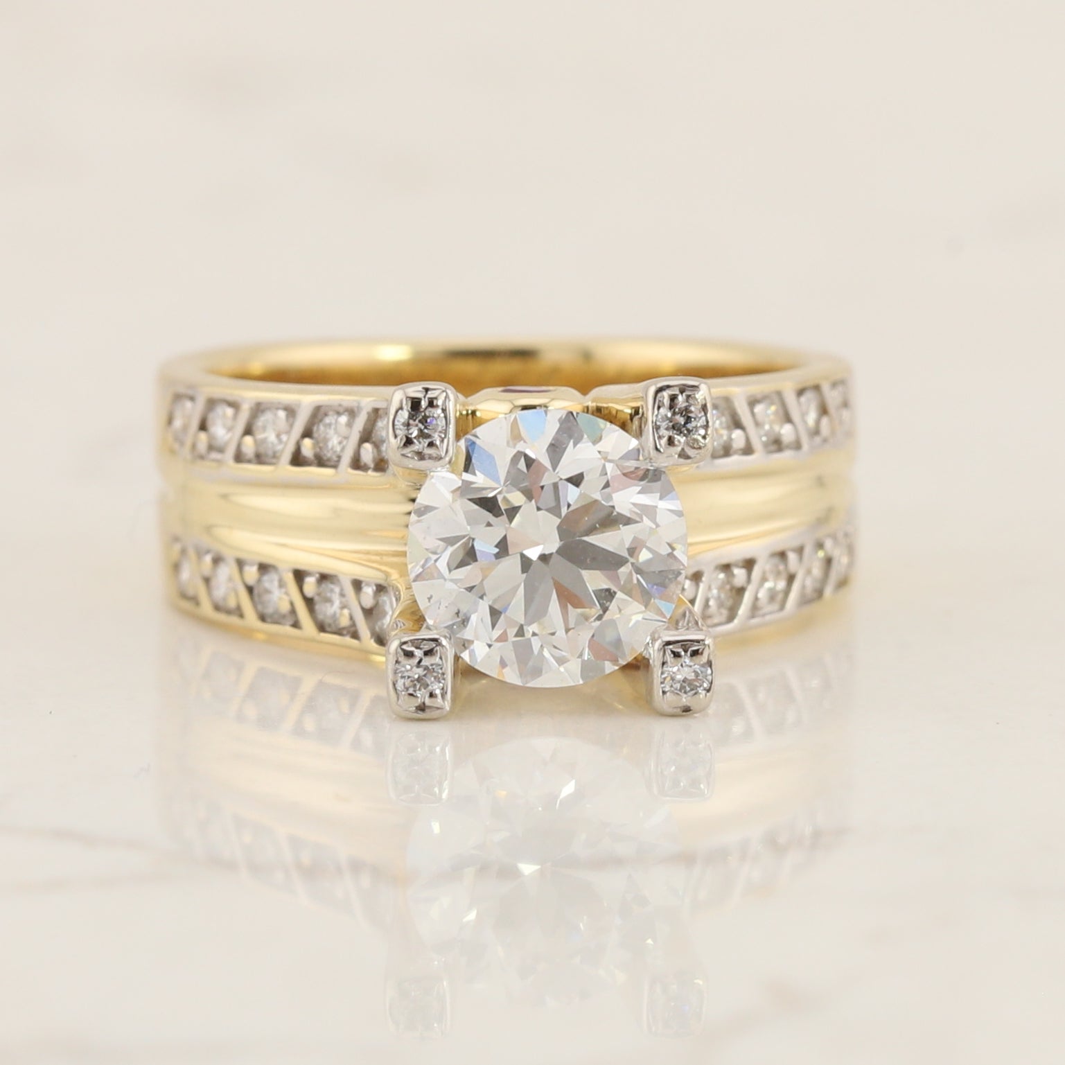 Gorgeous custom engagement ring with a 1.50ct GIA certified diamond, G colour, SI1, Excellent cut diamond. The custom mount has two rows of diamonds on either side and a hidden ruby under the head.