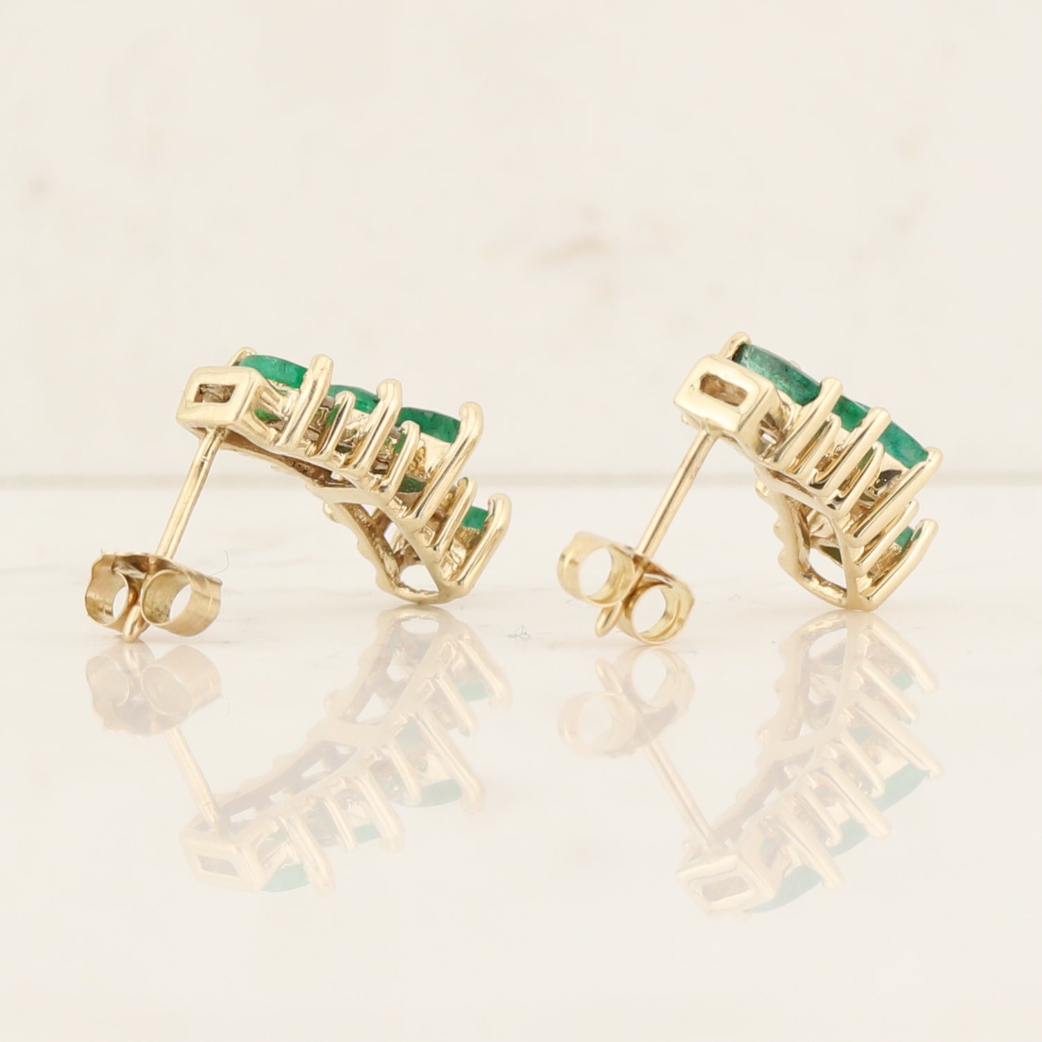 14kt yellow gold half hoop earrings set with marquise shaped emeralds and small diamonds.