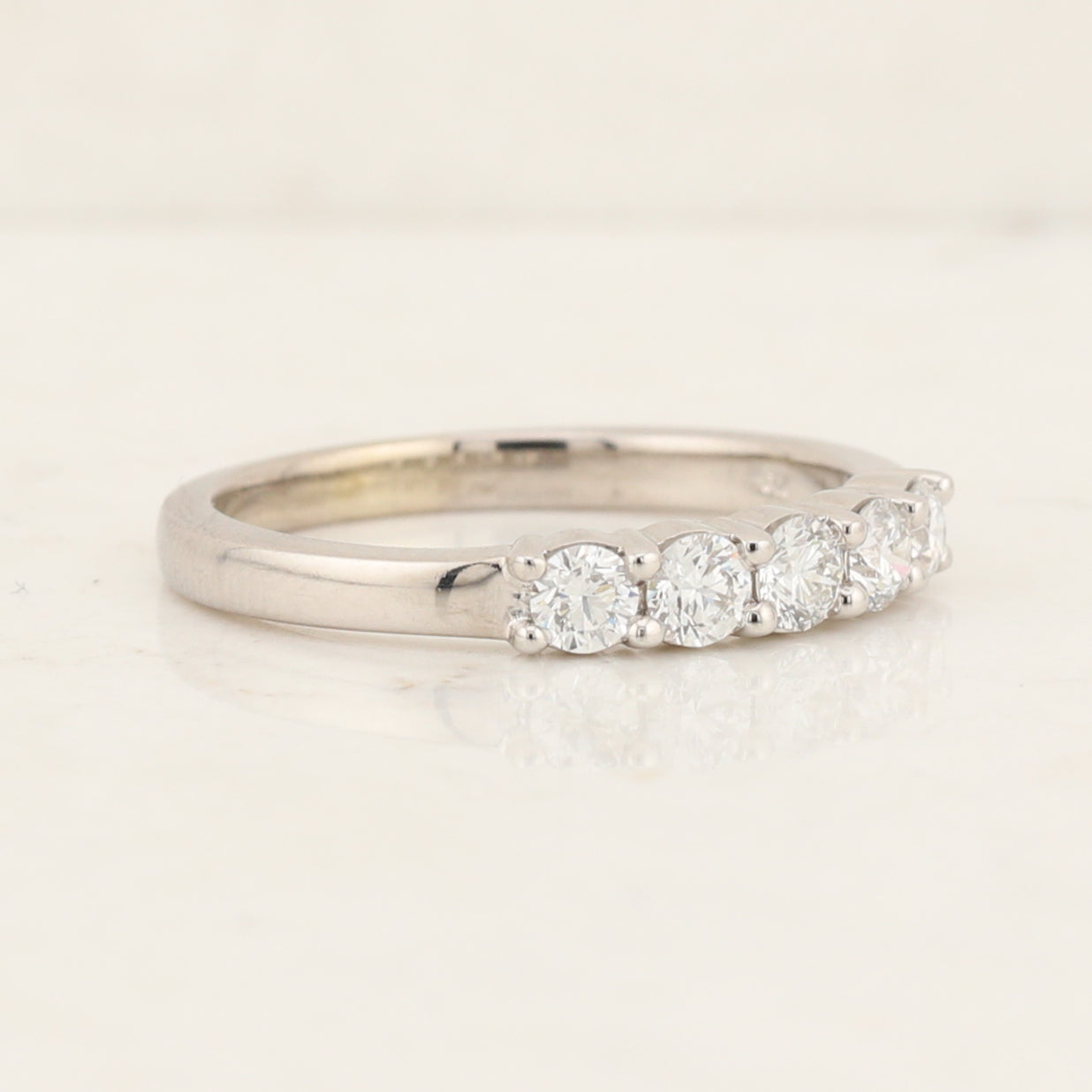 Anniversary band perfect for fifth anniversary, set with 5 0.10pt diamonds for a total diamond weight of 0.50cts tdw. The ring is 14kt white gold and is a finger size 6.25
