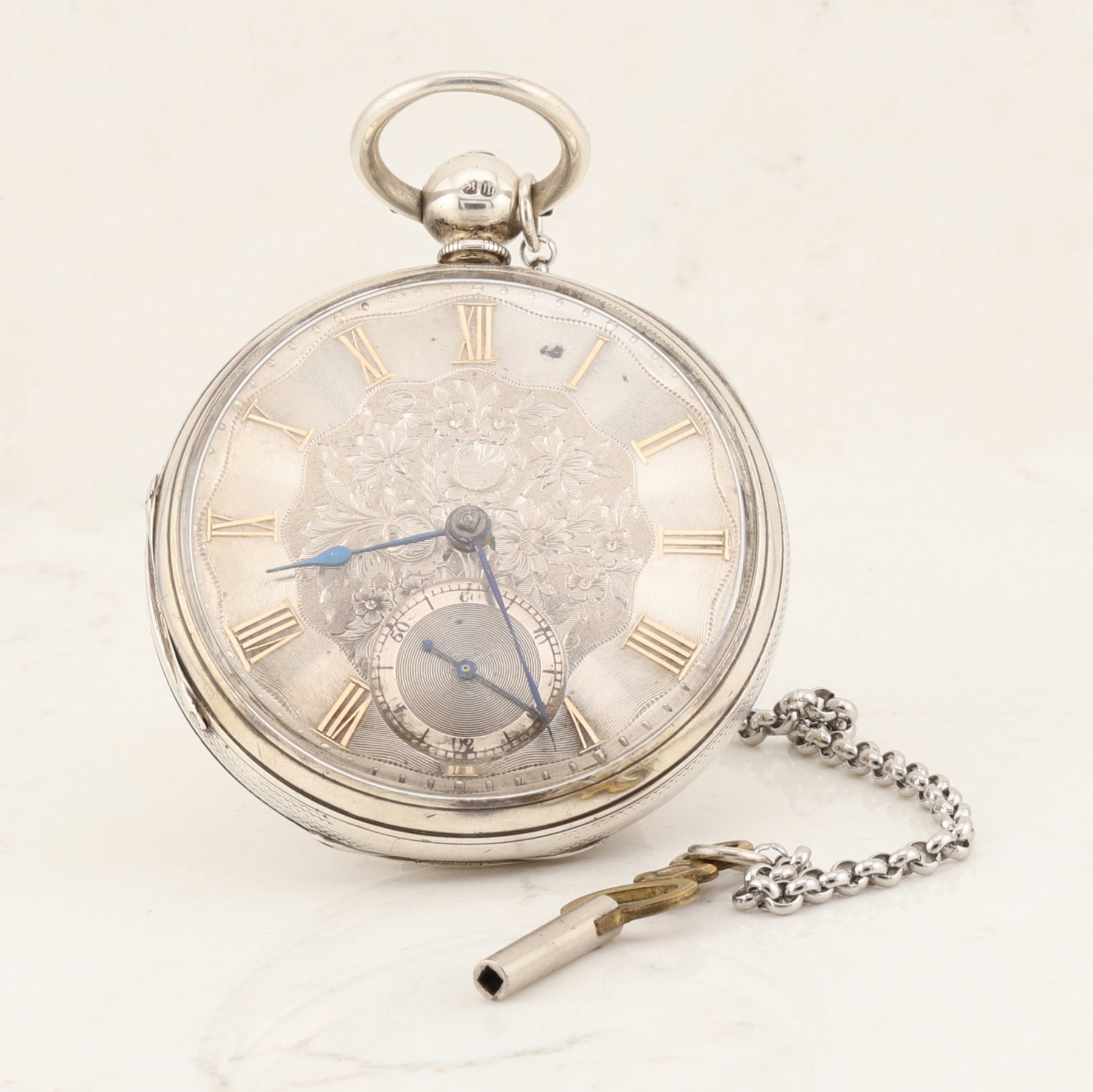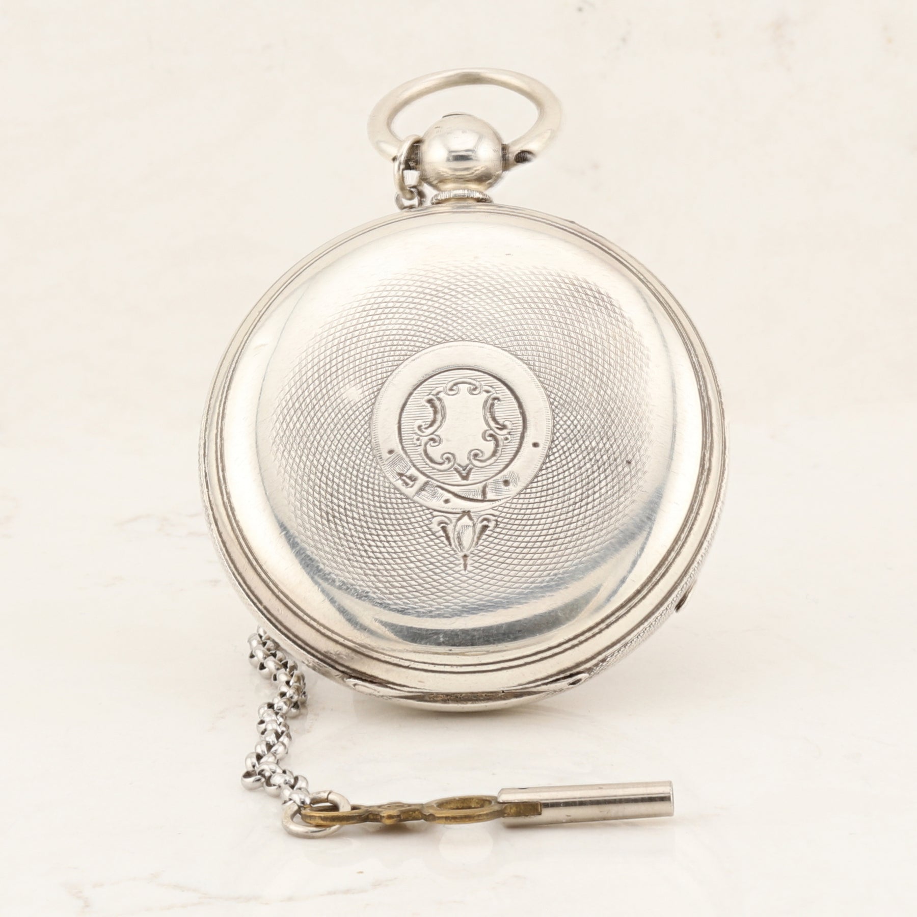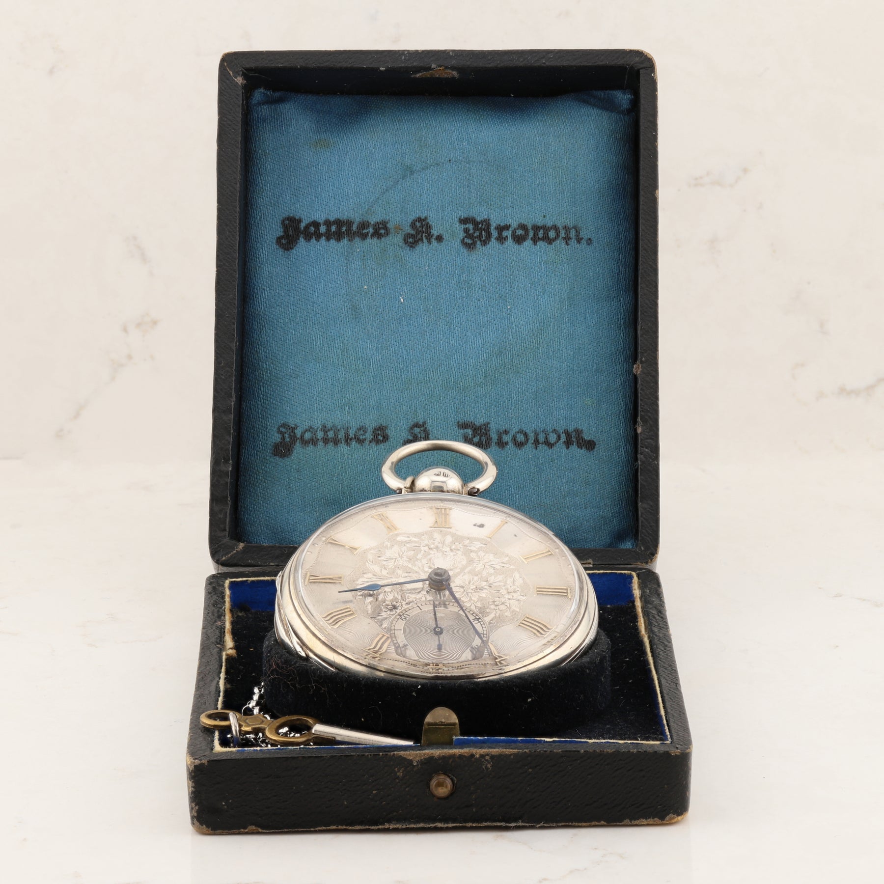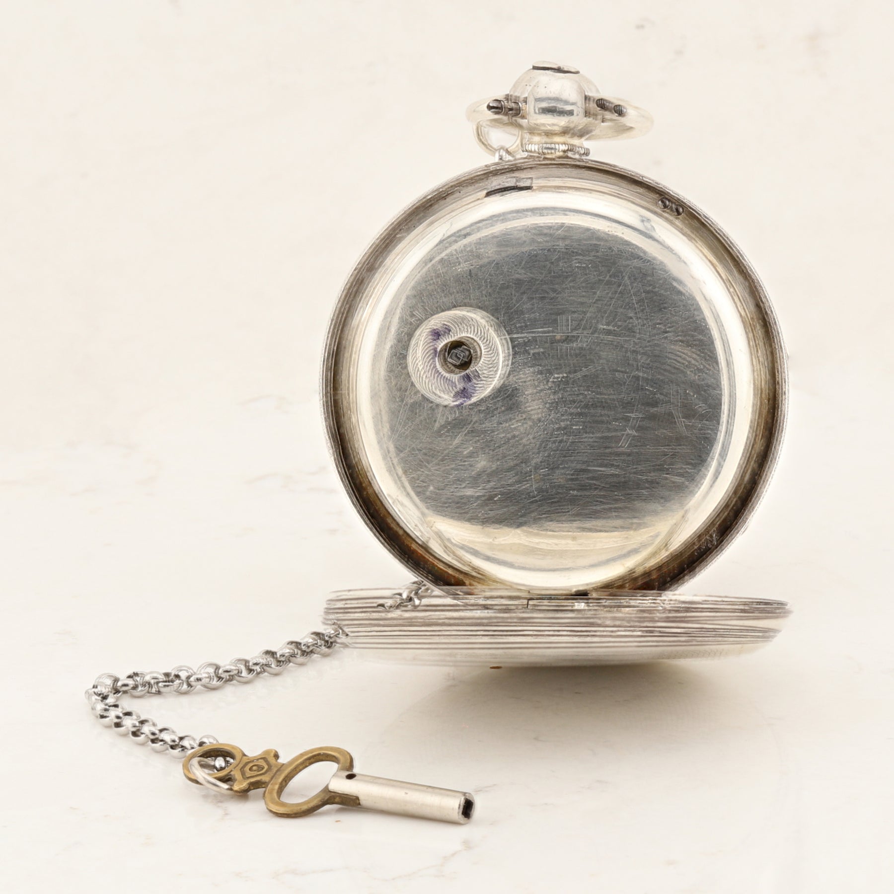 This exquisite Victorian-era Fusee pocket watch showcases authentic craftsmanship from circa 1890 London, crafted by the esteemed Bennett Rutherglen. The sterling silver case measures 53mm x 19mm and features delicate blue steel hands positioned on the watch face with period-appropriate elegance. As a key-wound timepiece, it operates with the mechanical precision characteristic of its era. This collector's piece arrives complete with its original box, preserving both its historical integrity and investment value. A remarkable example of 19th-century horological artistry.