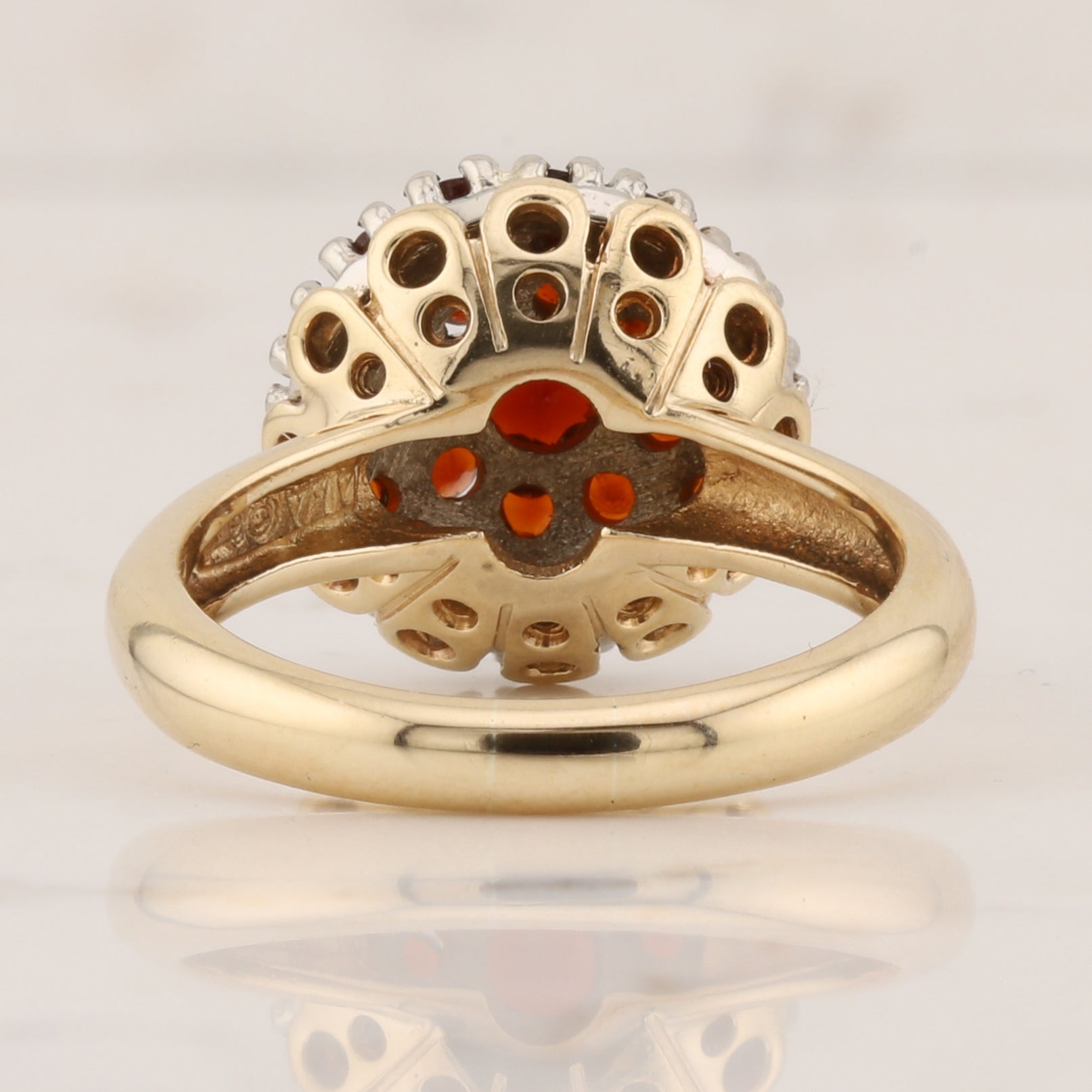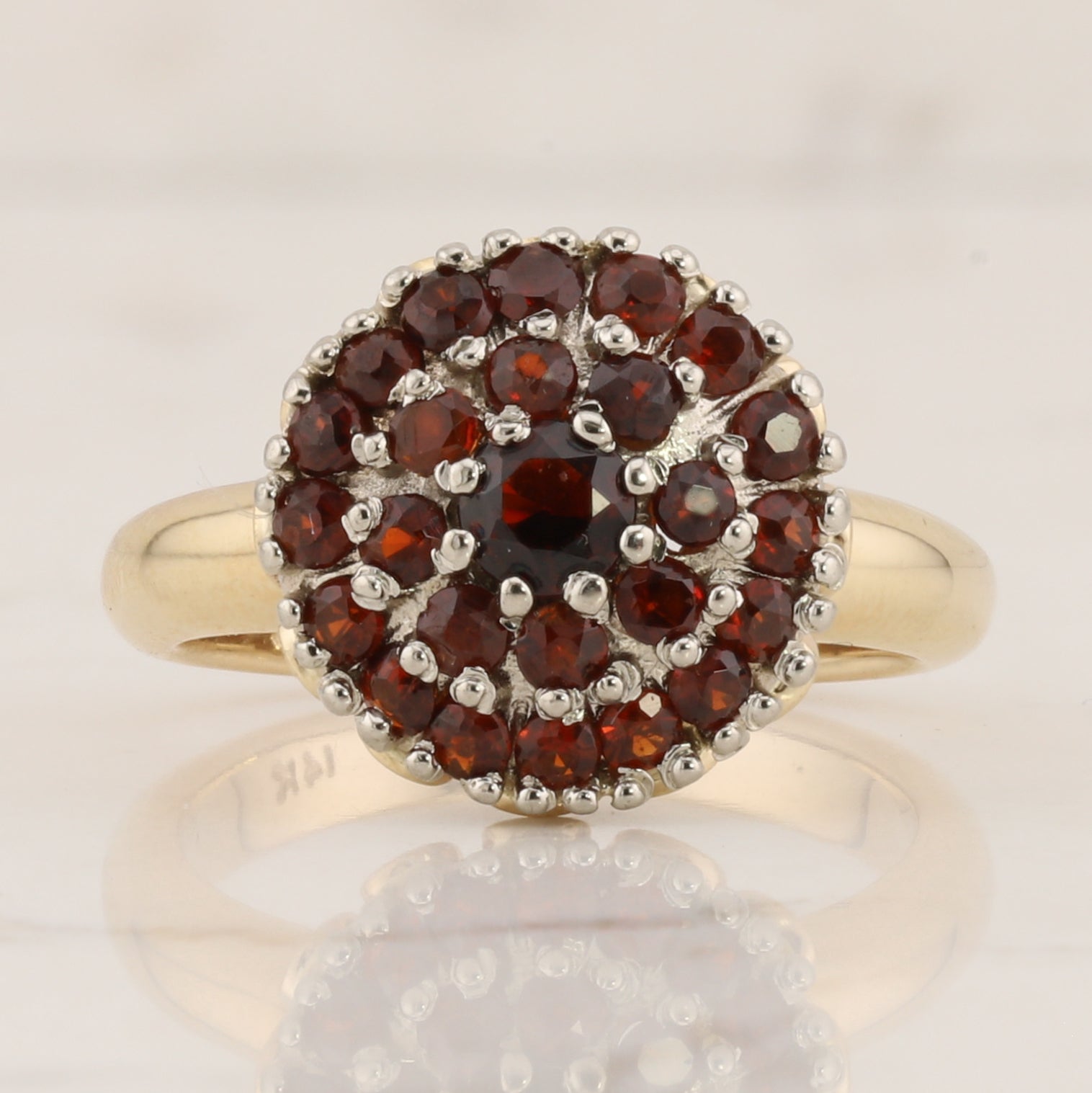 Elegant garnet cluster ring crafted in 14 kt yellow gold, sized at 6.5. This timeless piece features deep red garnets arranged in a sophisticated cluster design that catches the light beautifully. The warm glow of yellow gold complements the rich gemstone tones, making it perfect for everyday wear or special occasions. A versatile addition to any jewellery collection.