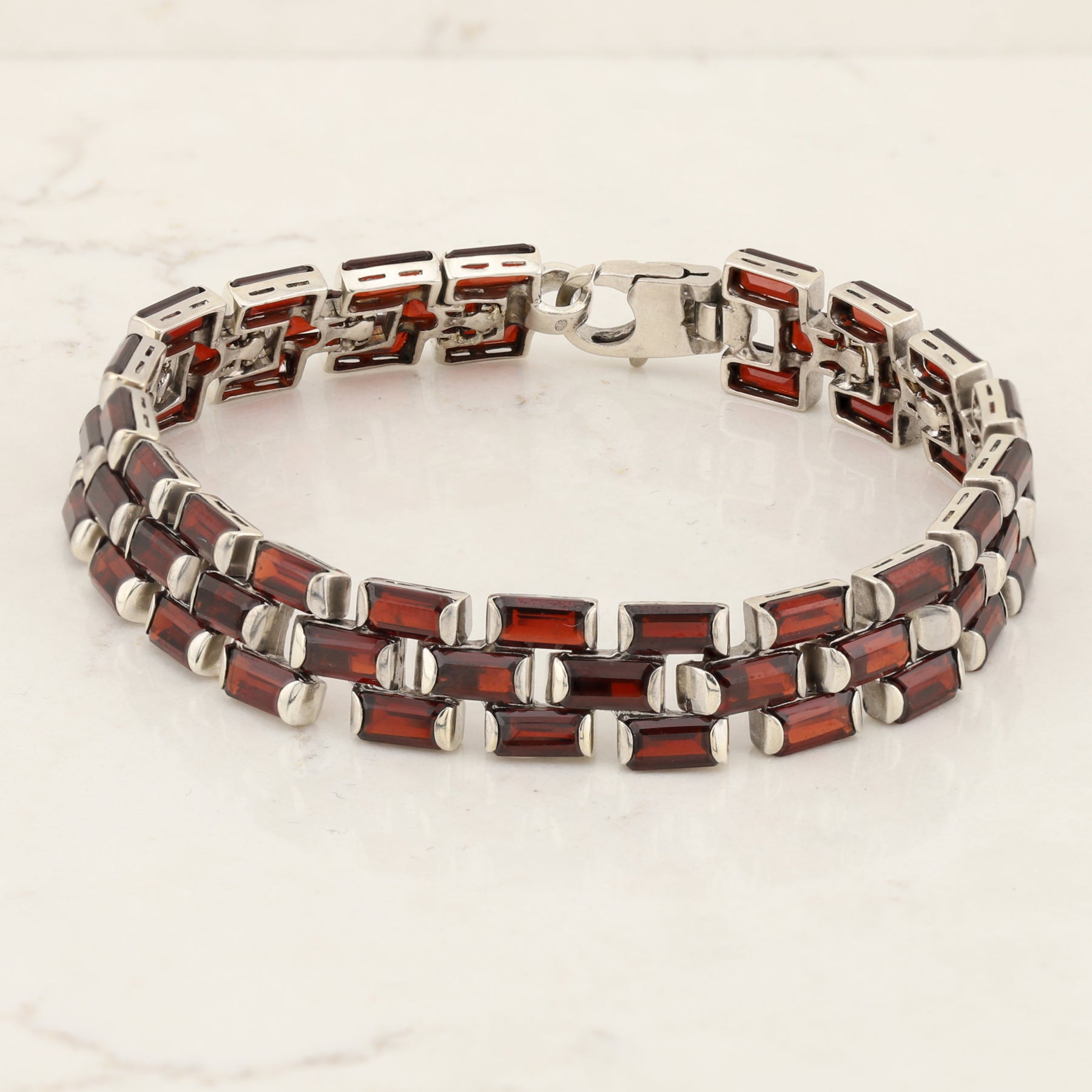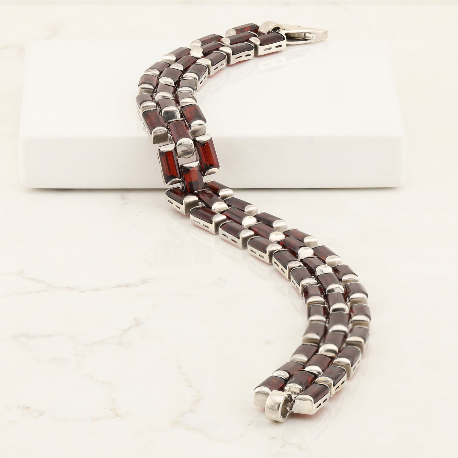 Sterling silver 7 inch bracelet set with a triple row of emerald cut garnets.