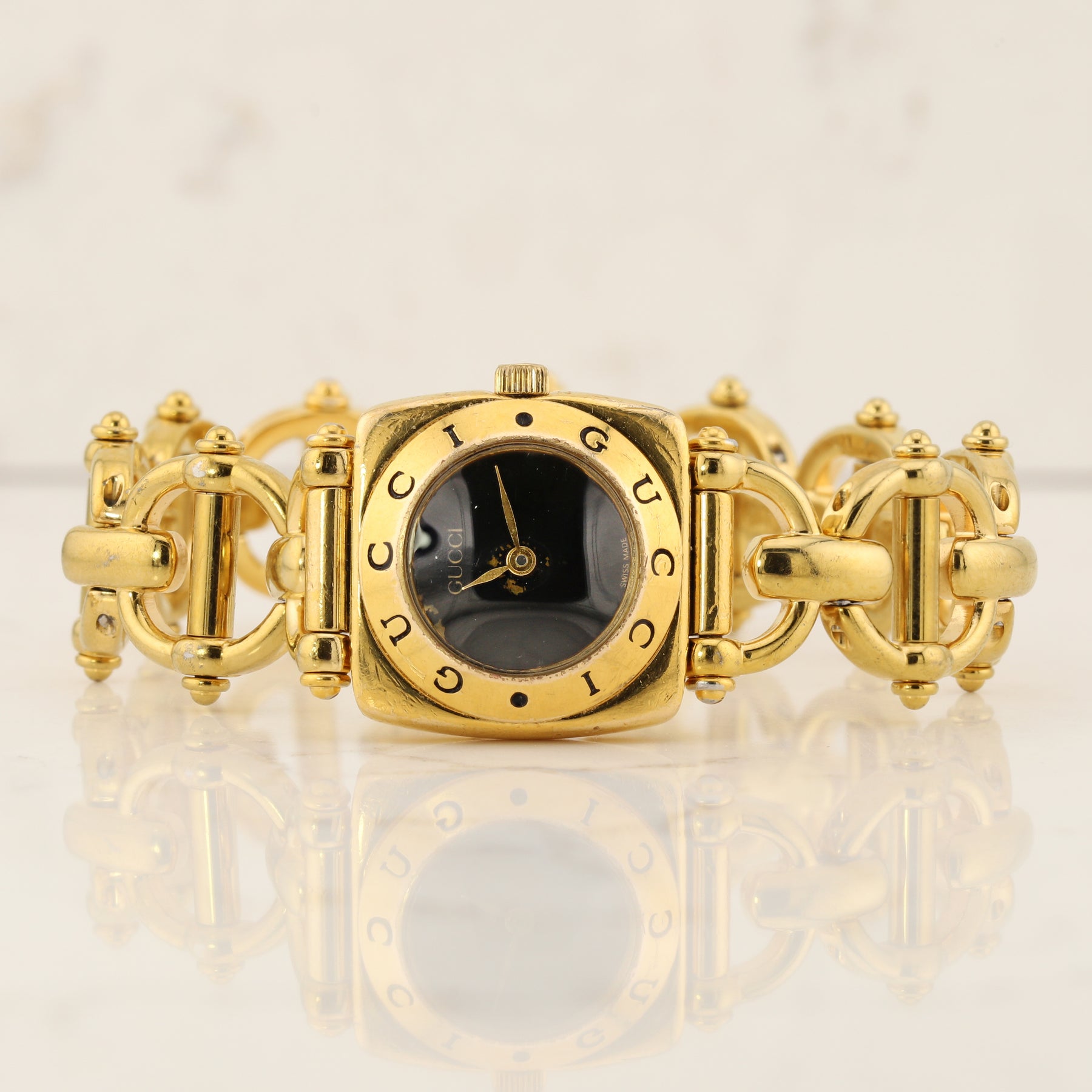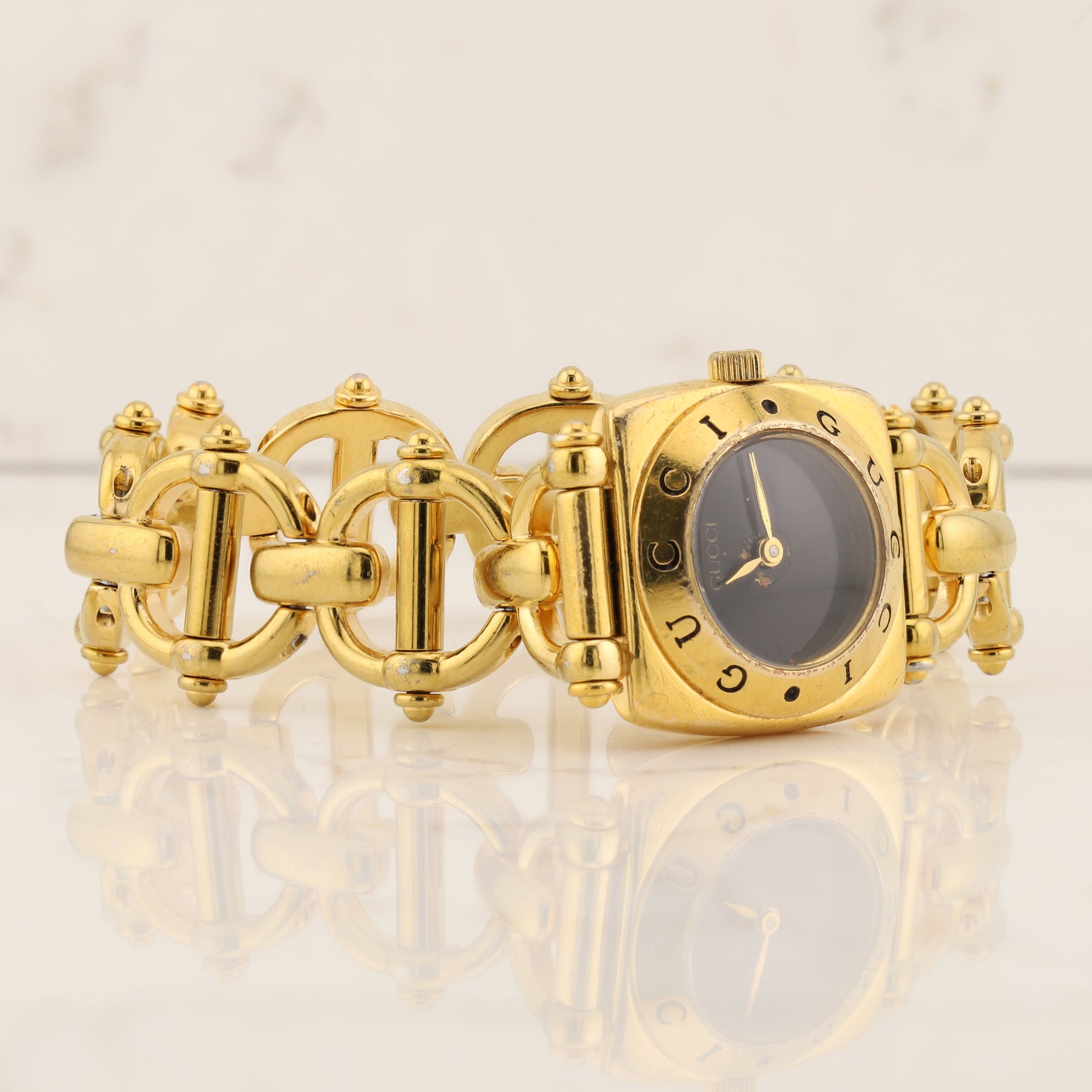 This gold tone Gucci watch features a sleek black dial that stands out against the warm metallic case.