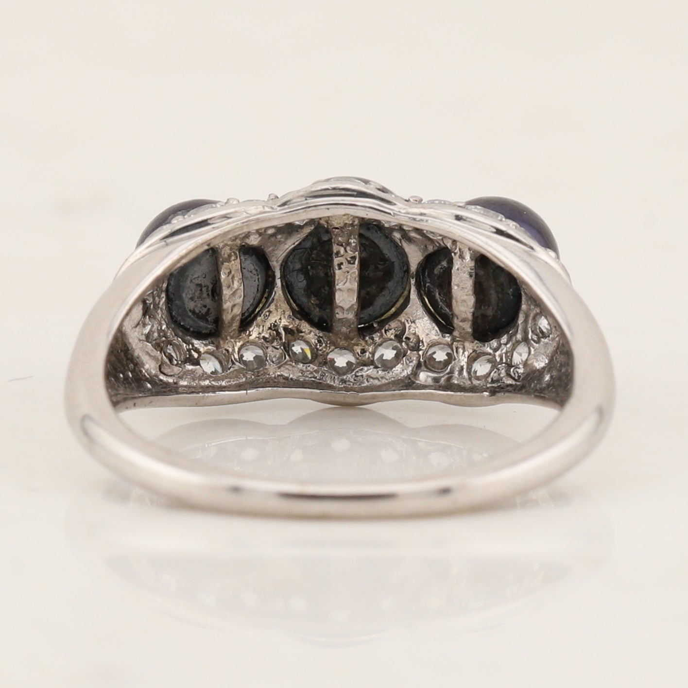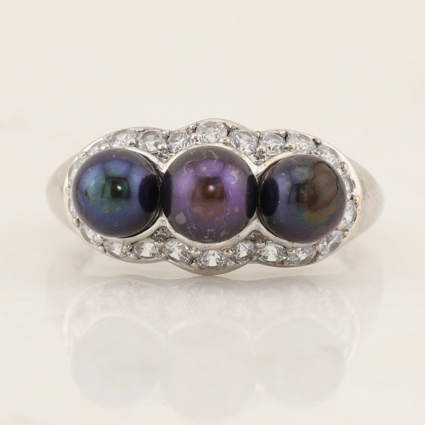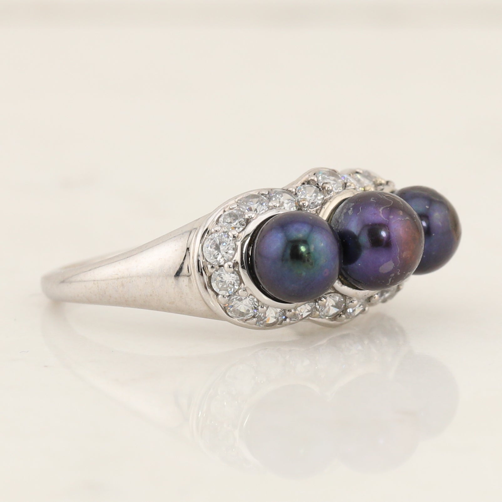Three grey pearls adorn this ring, like three peas in a pod. This 14kt white gold ring is set with accent diamonds in a scalloped design surrounding the Grey pearls in a finger size 7.75