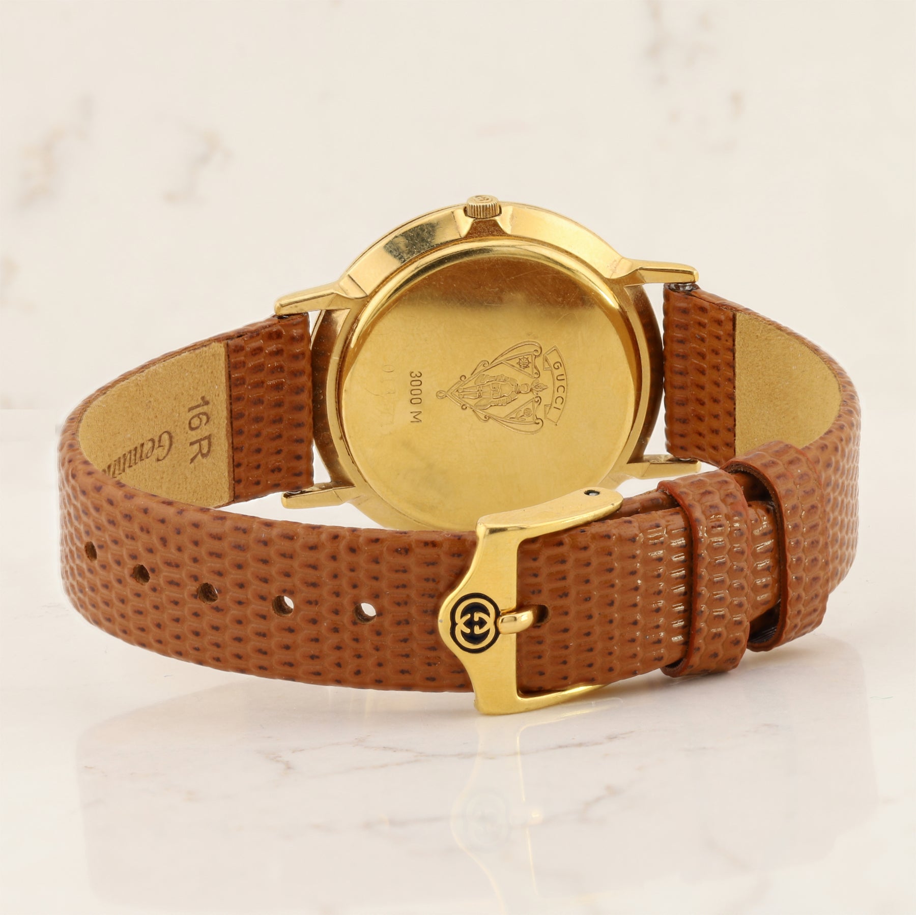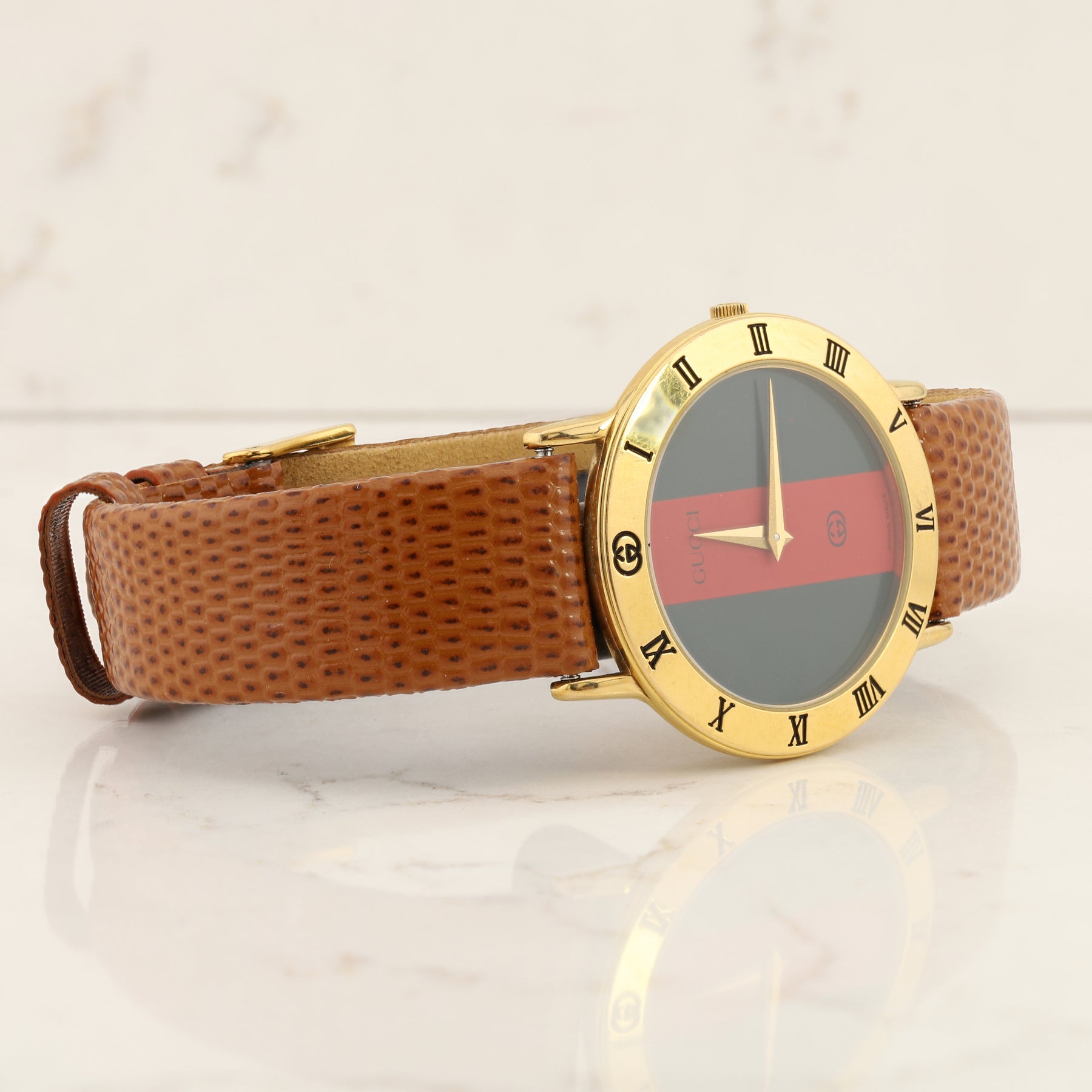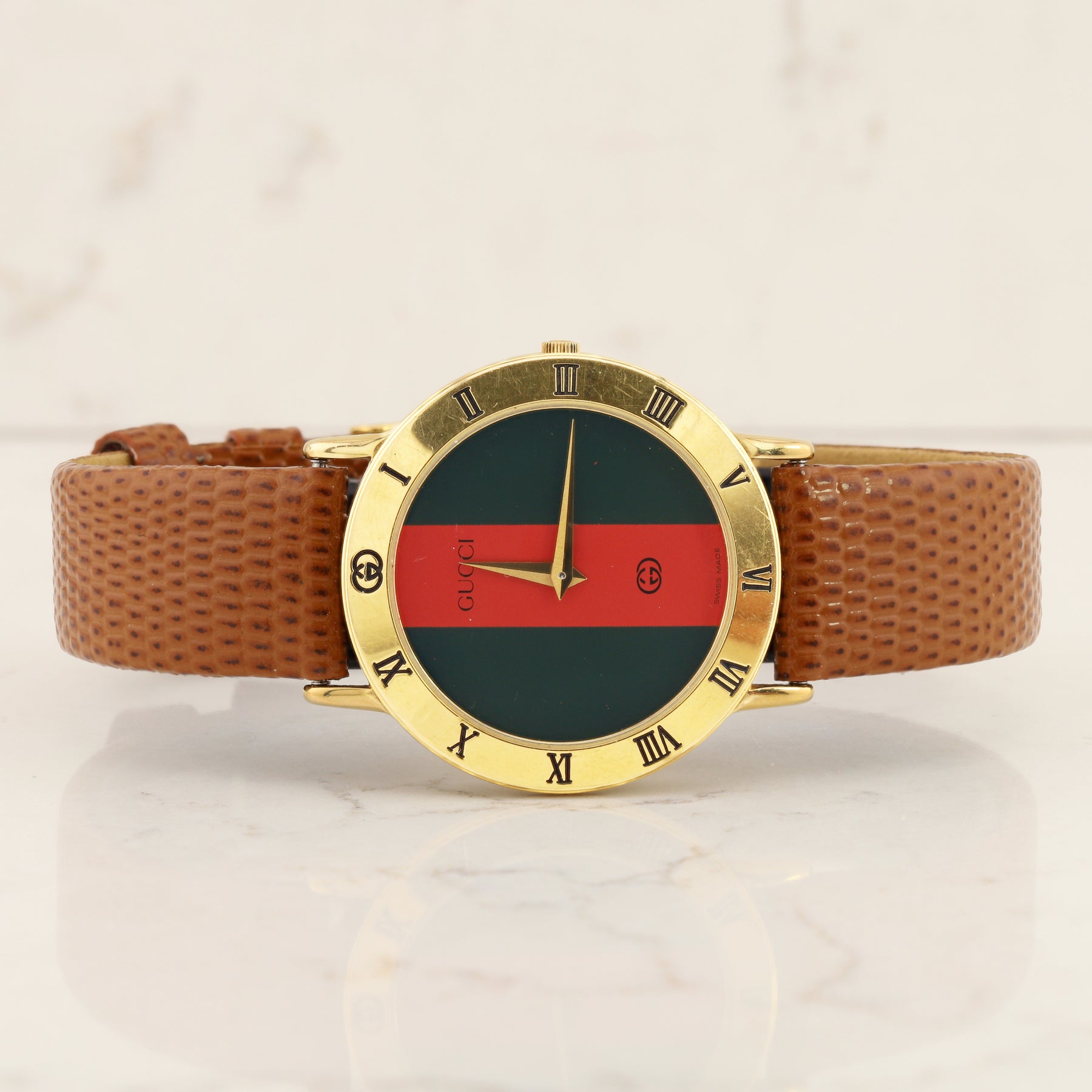 This Gucci watch has a red and green dial paired with a warm yellow-tone case, and comes with a leather strap.