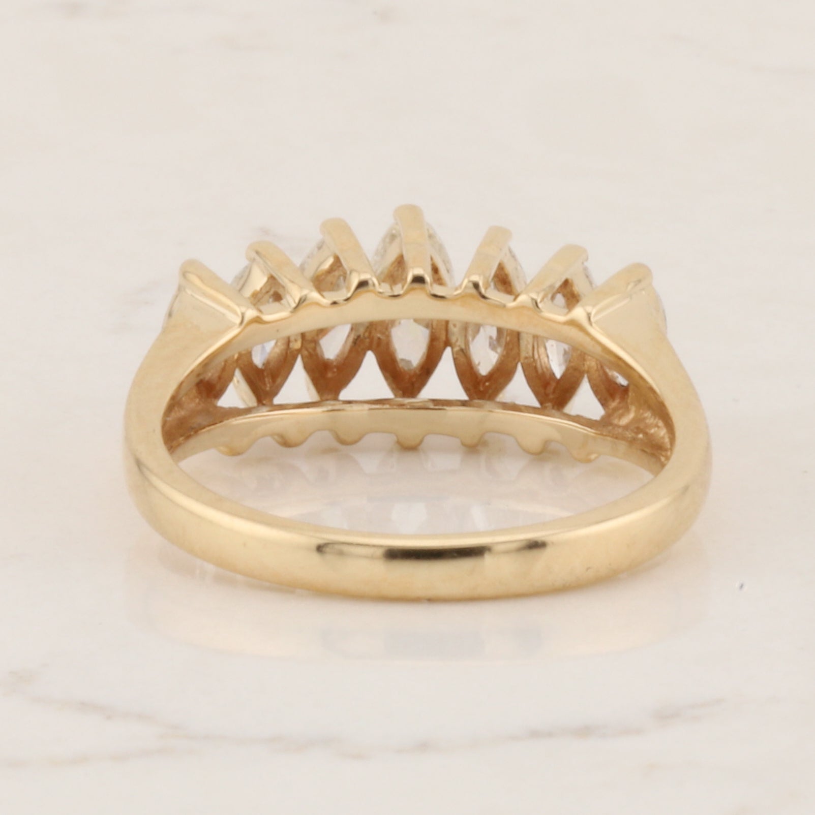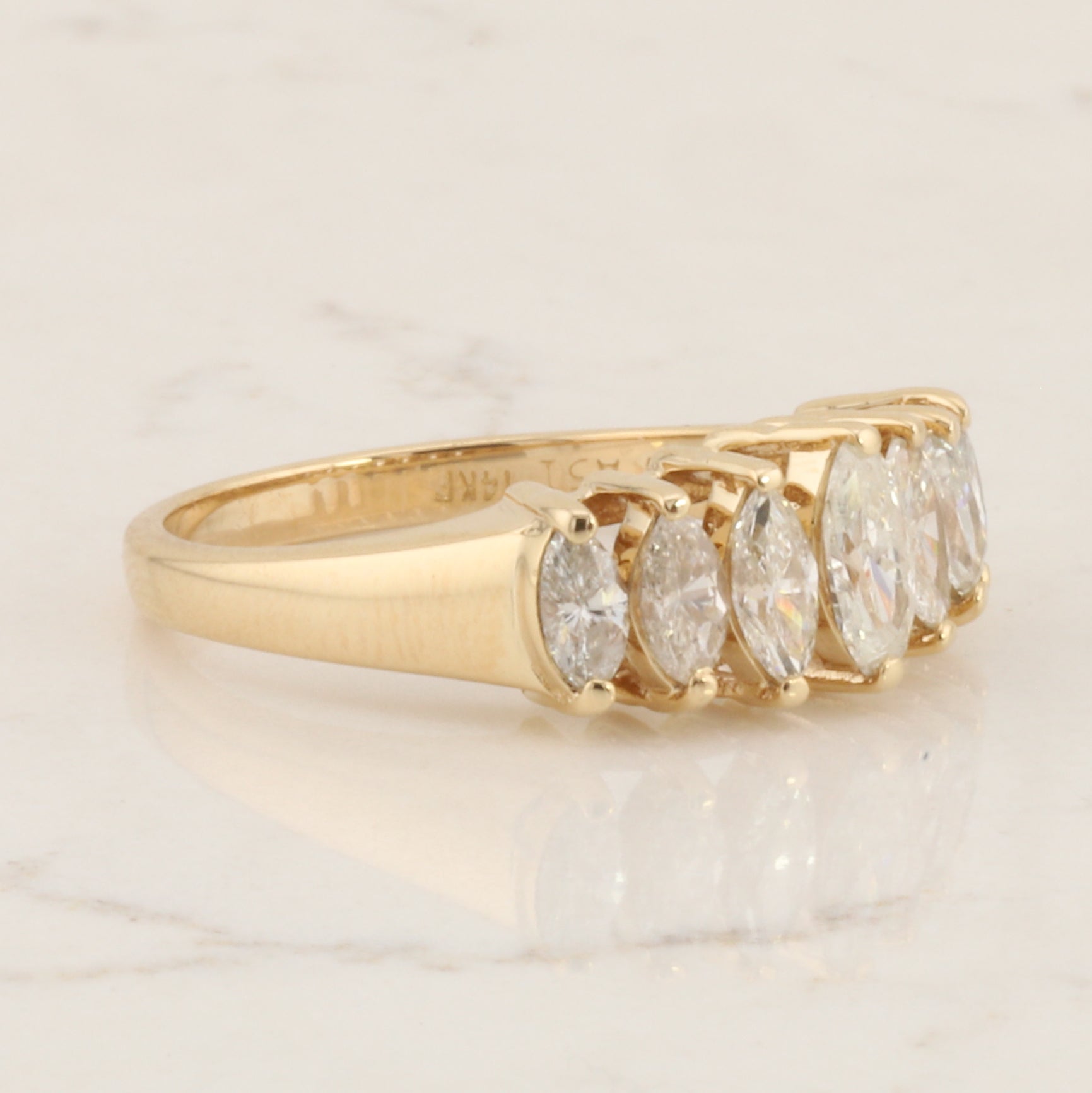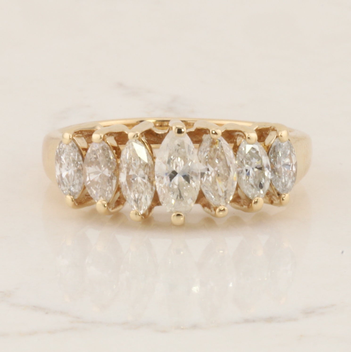 Crafted in 14-karat yellow gold, this elegant ring showcases seven marquise-cut diamonds arranged in a sophisticated design. The ring is a size 6.