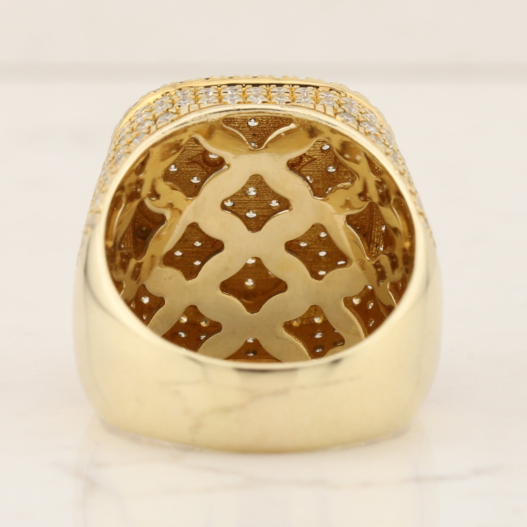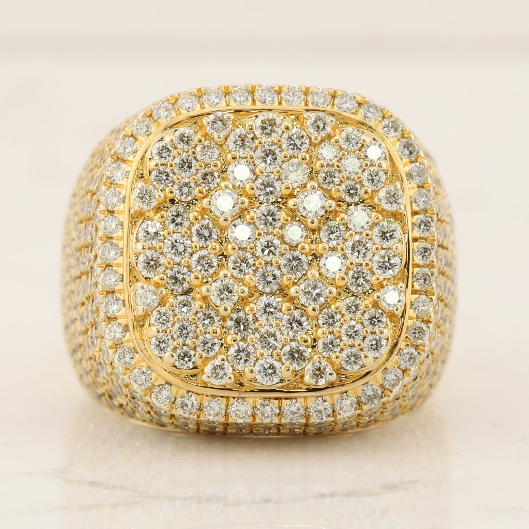 10kt yellow gold "football" style diamond ring, with a full inside finger bezel. The ring is pave set on all three sides with diamonds and is a finger size 11.25