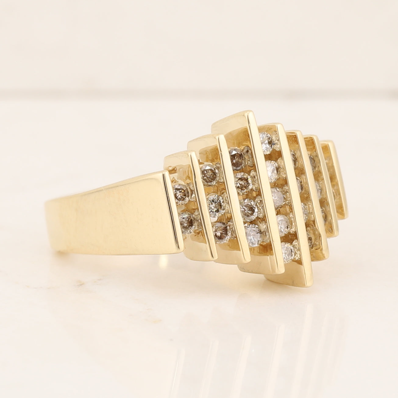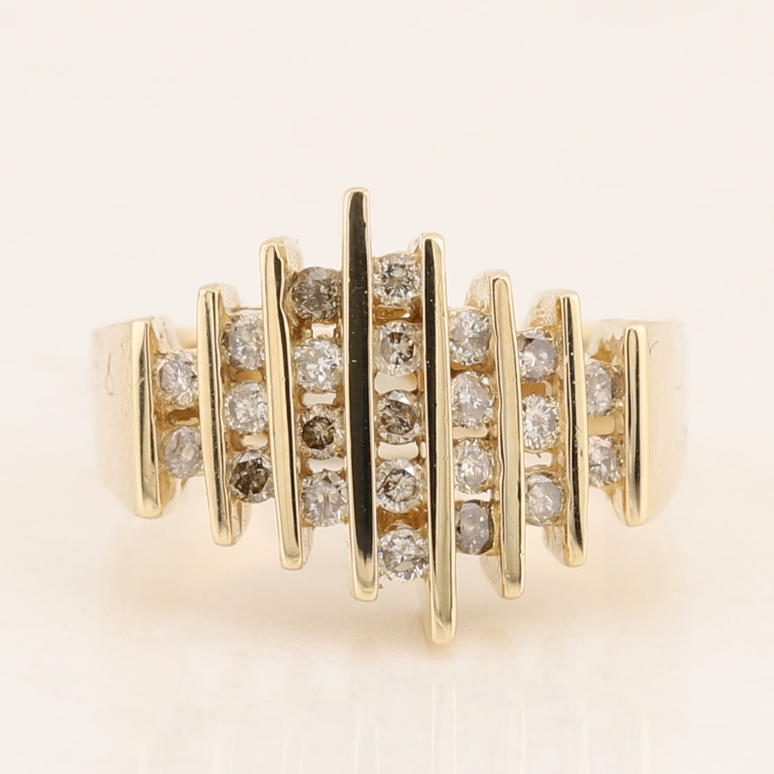 This modern design of channel set diamonds is made in14kt yellow gold and is a finger size7 with a squared off shank to help prevent spinning