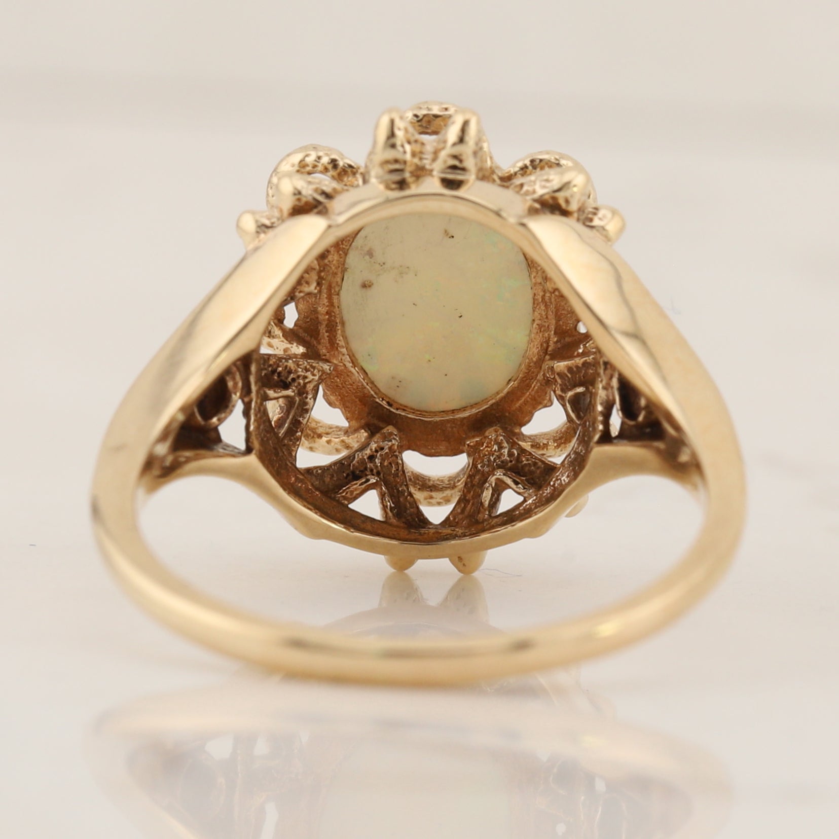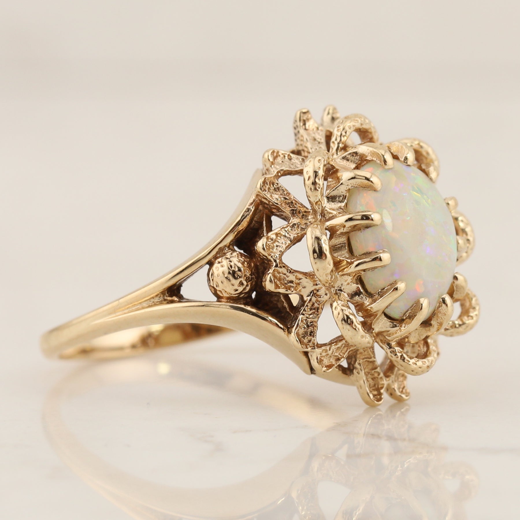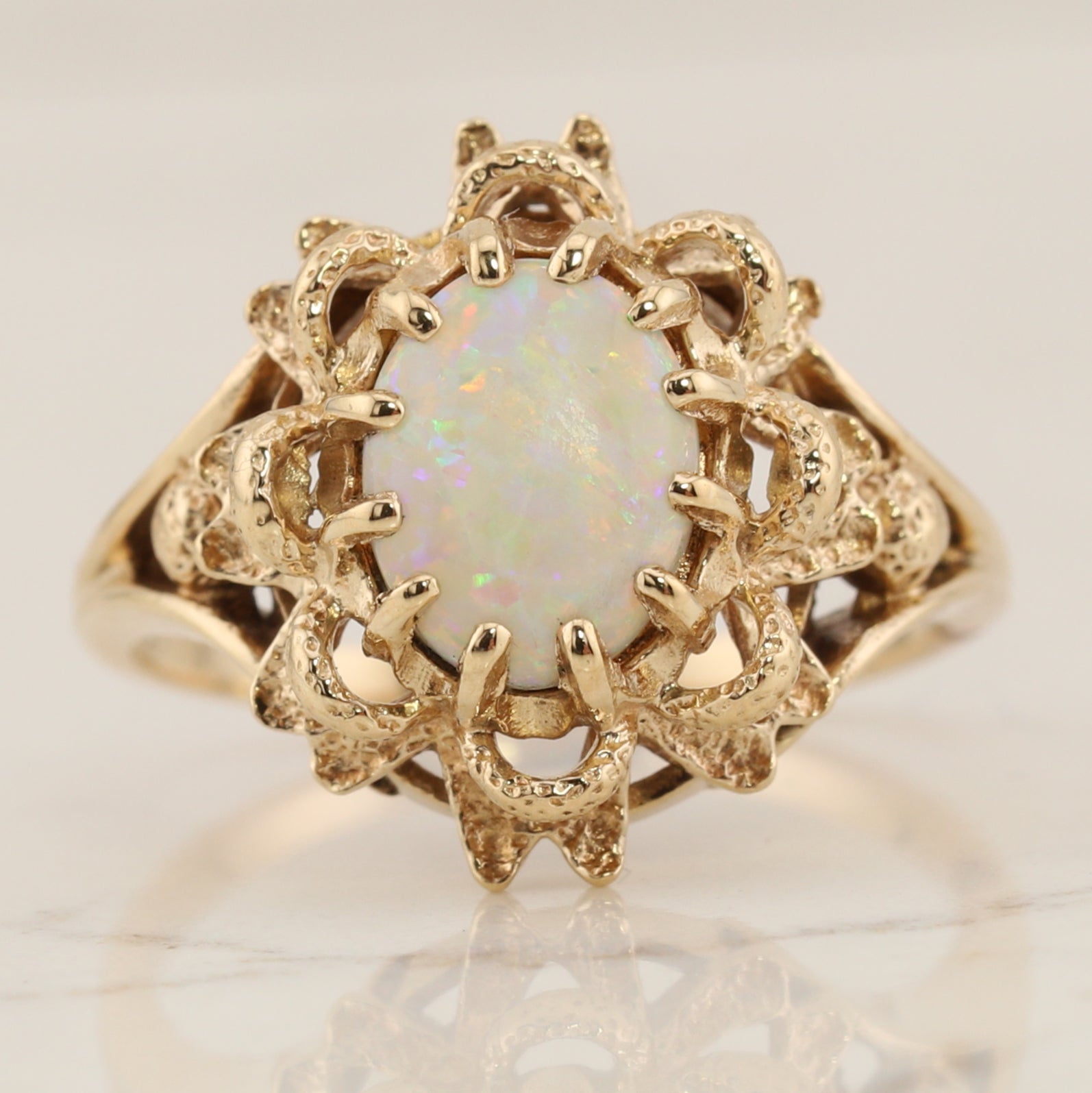 This oval opal ring is set in 14kt yellow gold in a unique floral design.  The ring is a size 7.25.