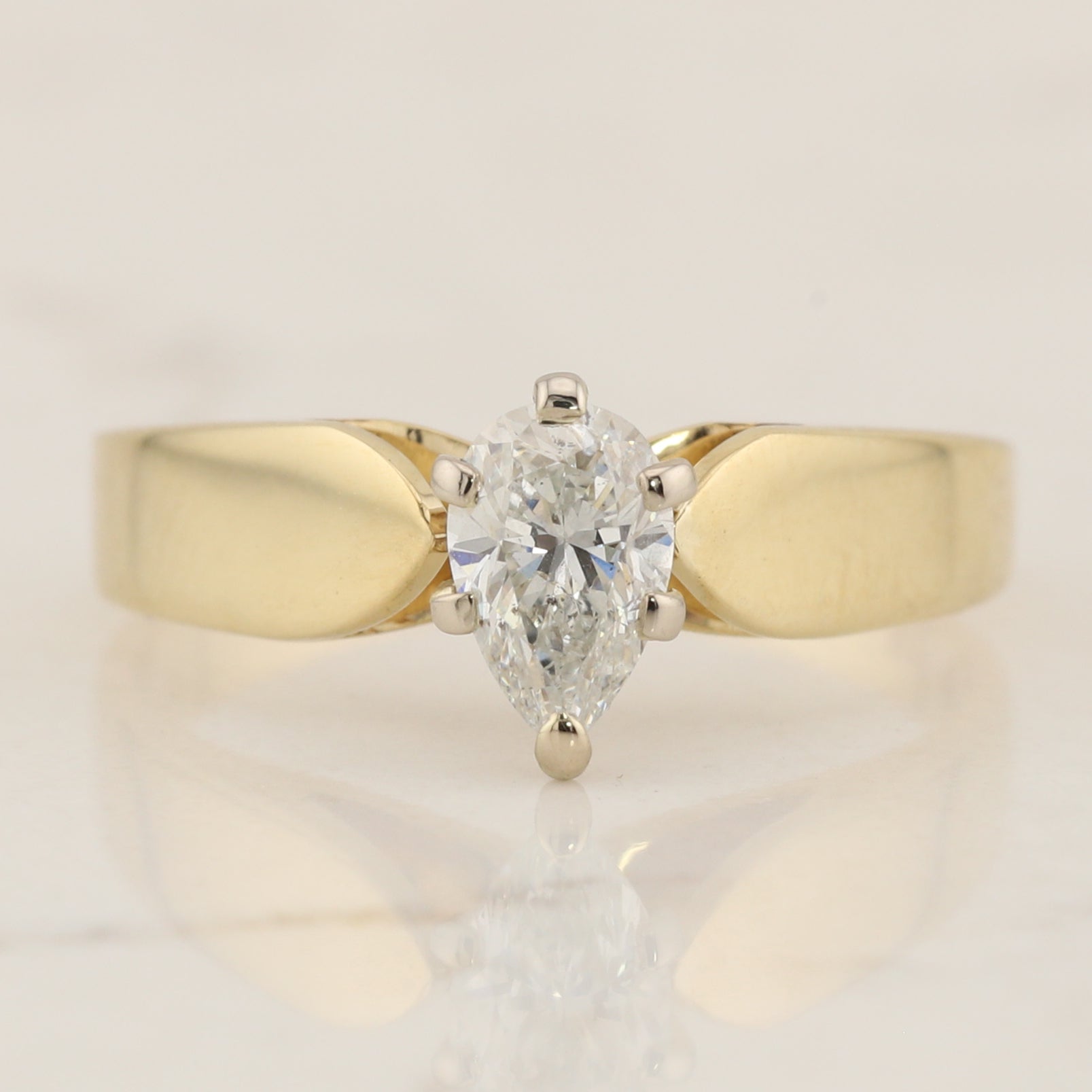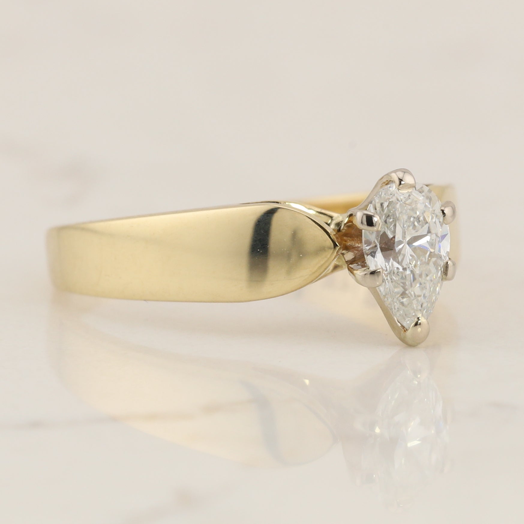14kt yellow gold diamond solitaire ring, set with a stunning pear shaped natural diamond