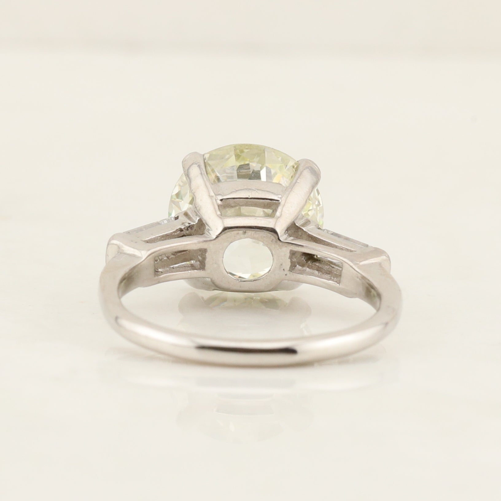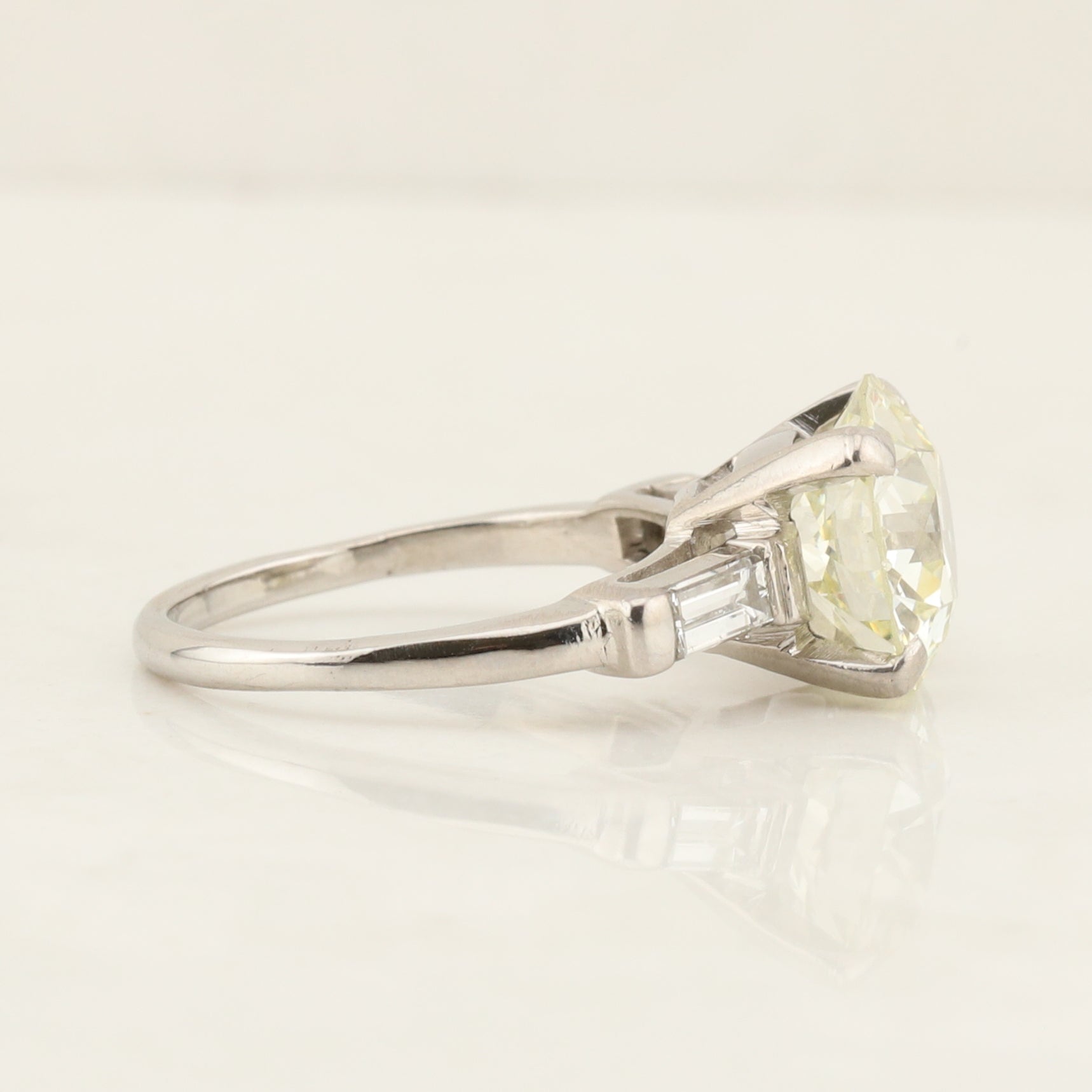 This older diamond ring is absolutely stunning, set with a 3.39ct older cut diamond and flanked by baguettes in this classic setting style.