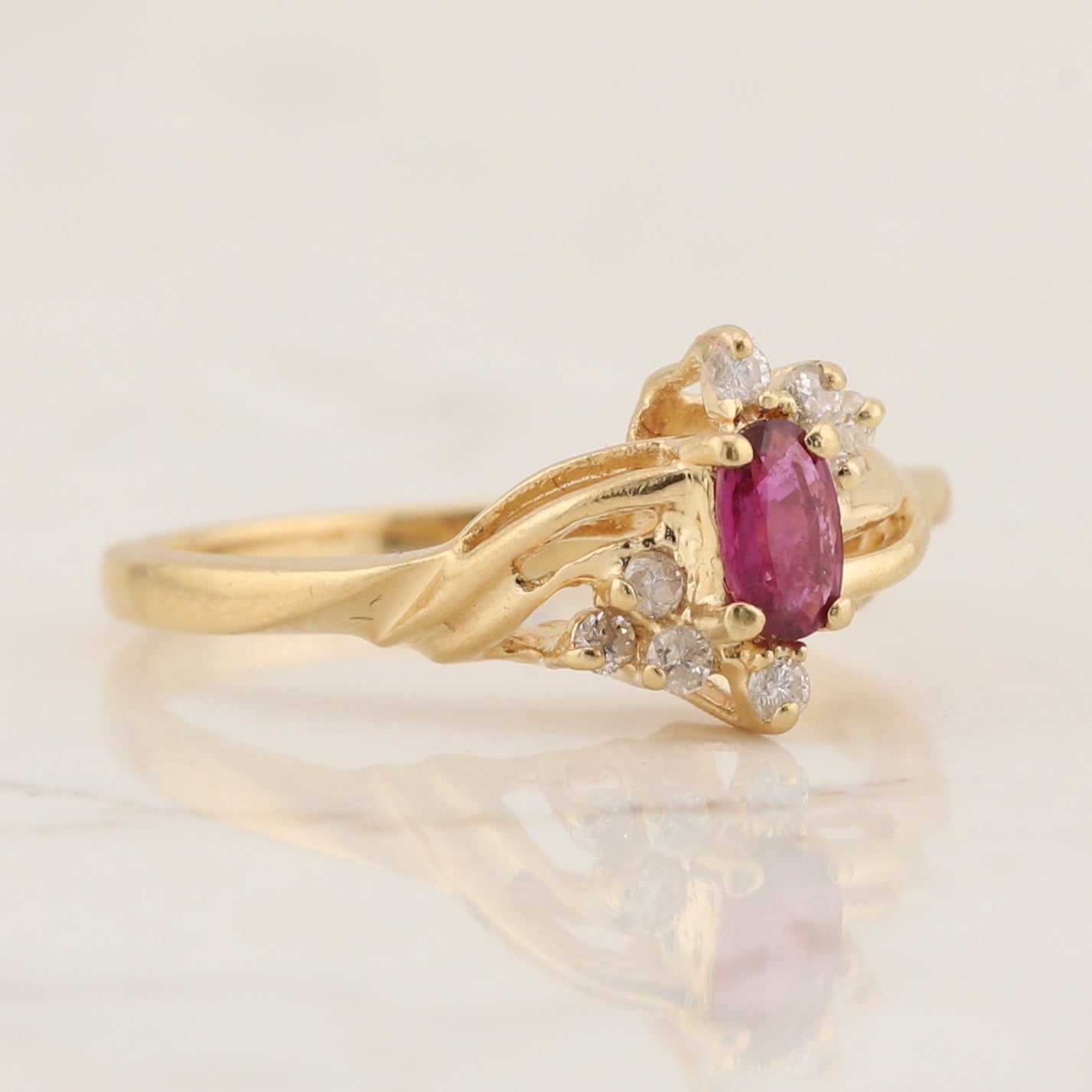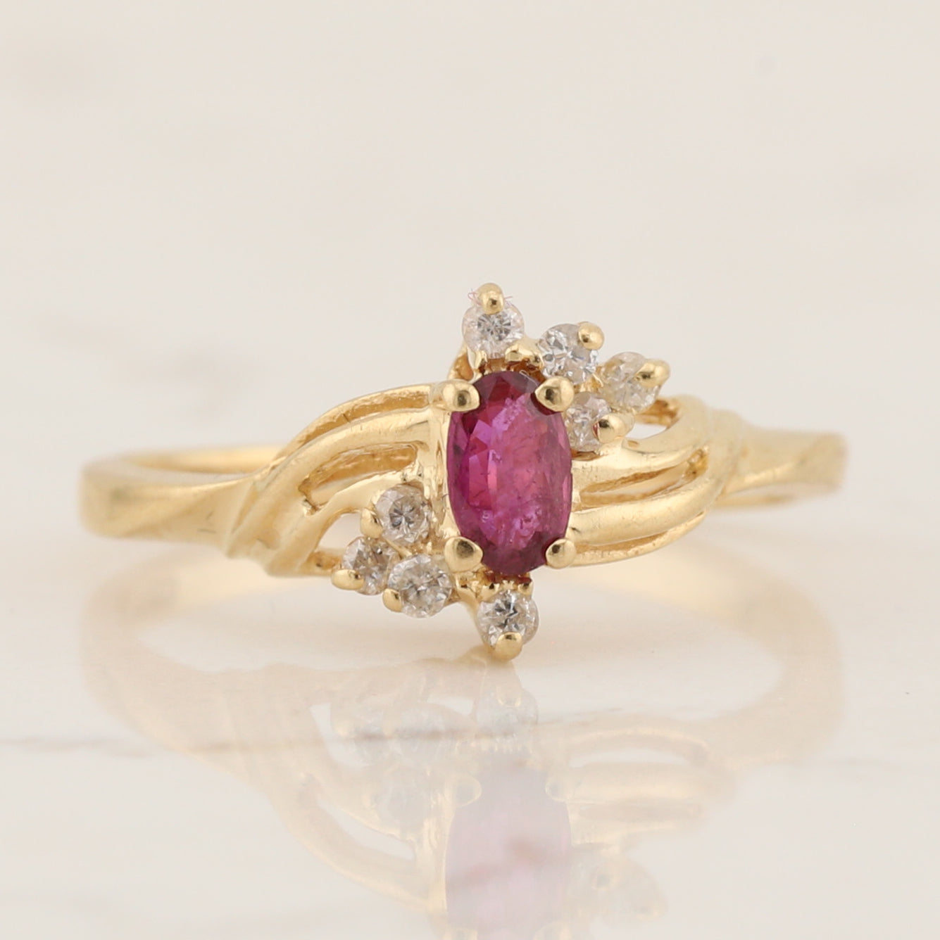 Cute little oval ruby with accent diamonds. The ring is a finger size 6.