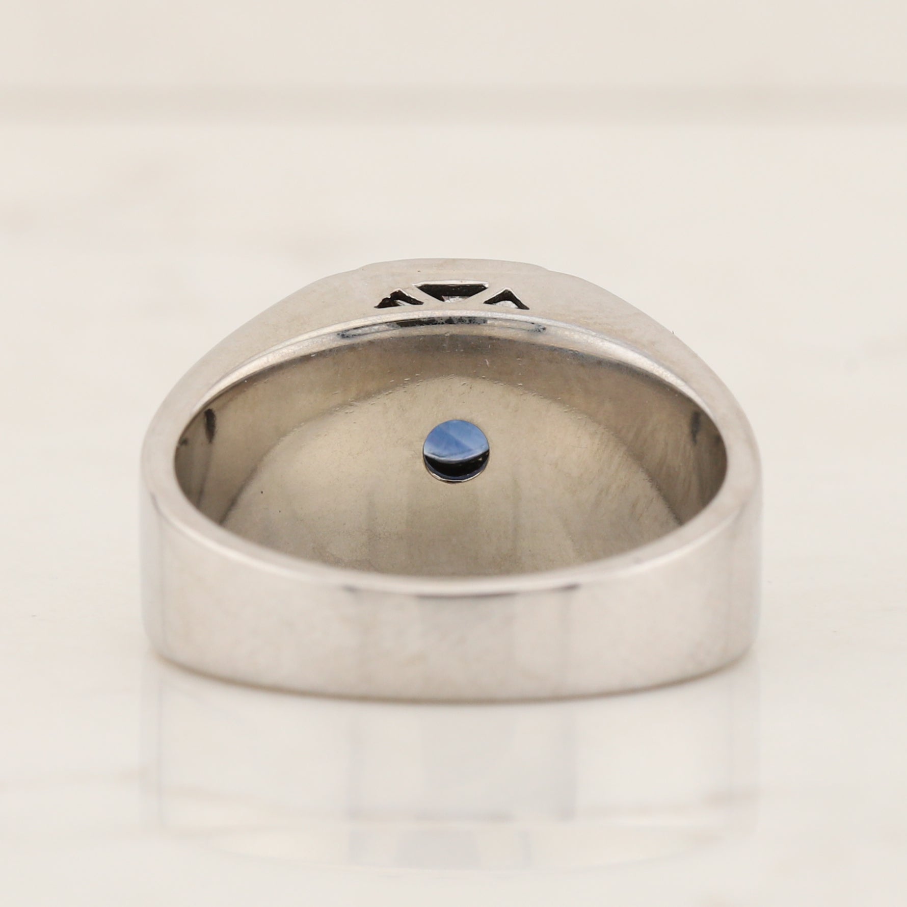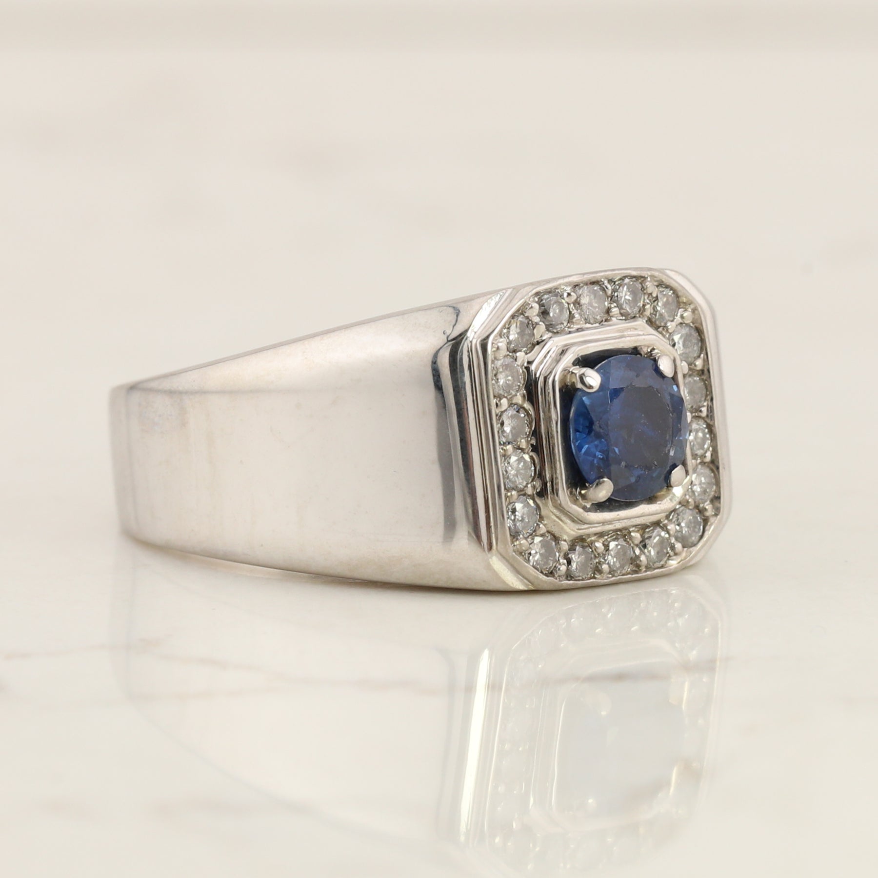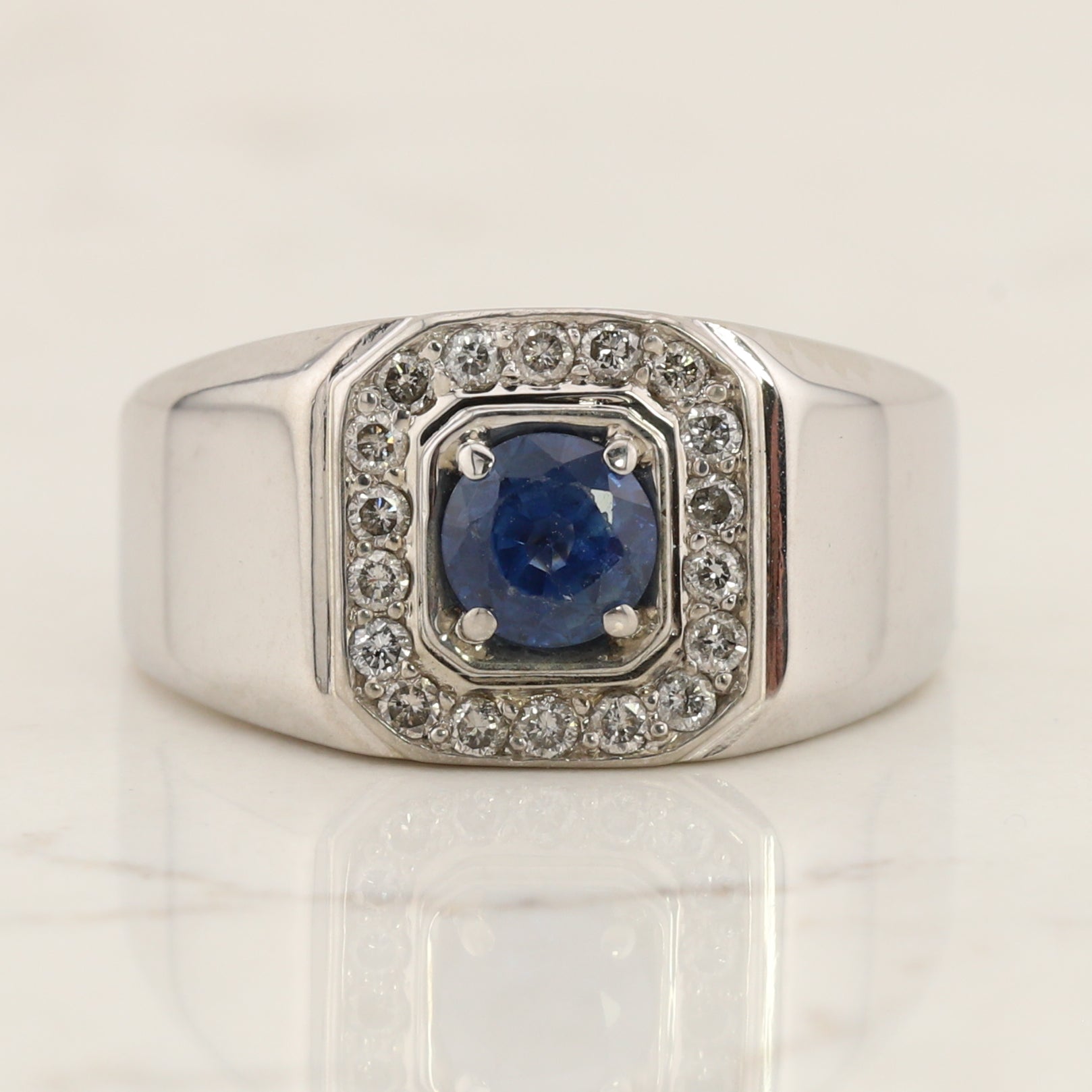 This is a gents ring finger size 9, solid back in 10kt white gold diamond ring, set with a round sapphire in the center.