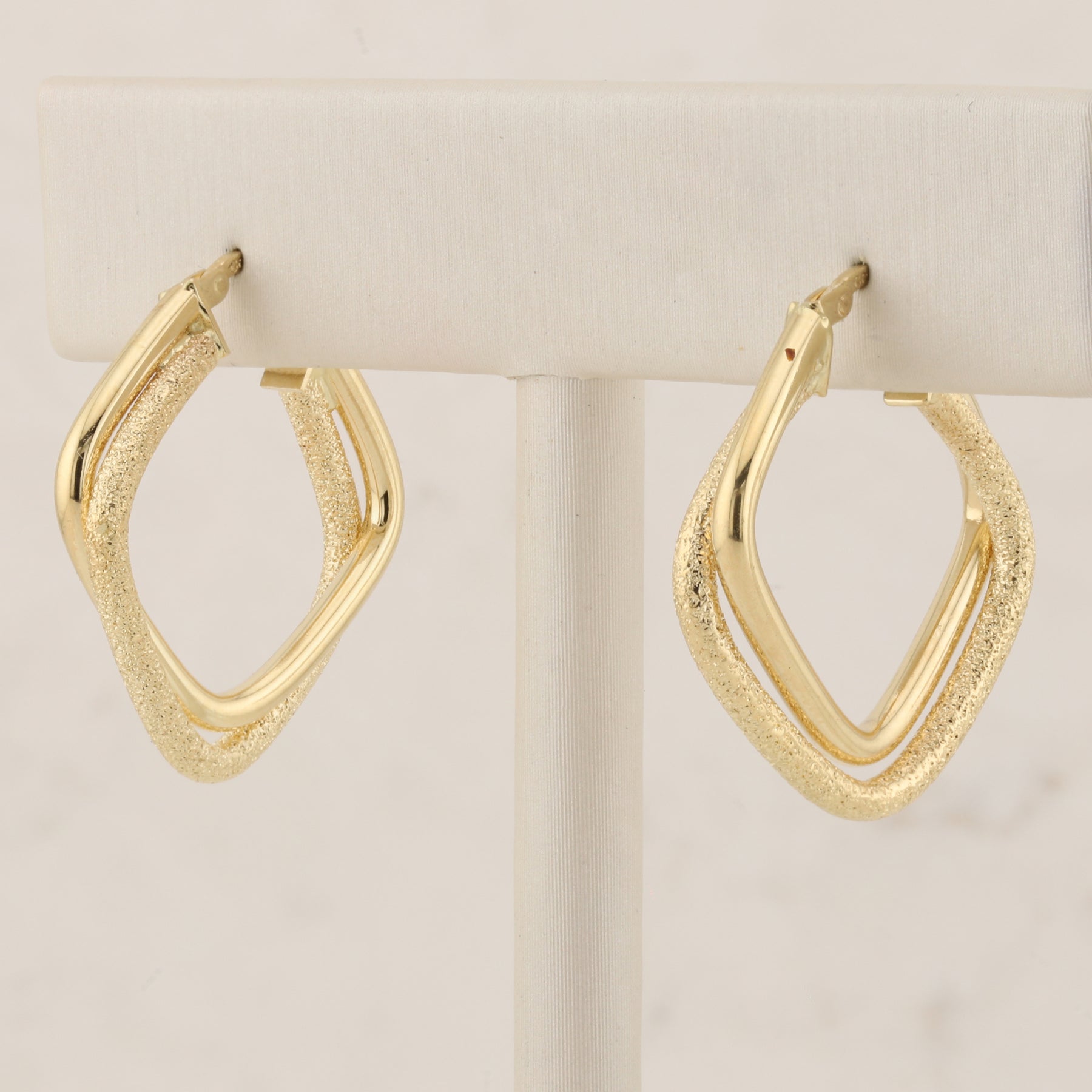 Elegant 14 kt yellow gold squared hoop earrings featuring a sophisticated mix of brushed and polished finishes. Each hoop measures approximately 2.5 cm in length, offering a modern geometric silhouette that complements both casual and formal styles. The contrasting textures create visual depth while the substantial gold construction ensures lasting quality and timeless appeal.
